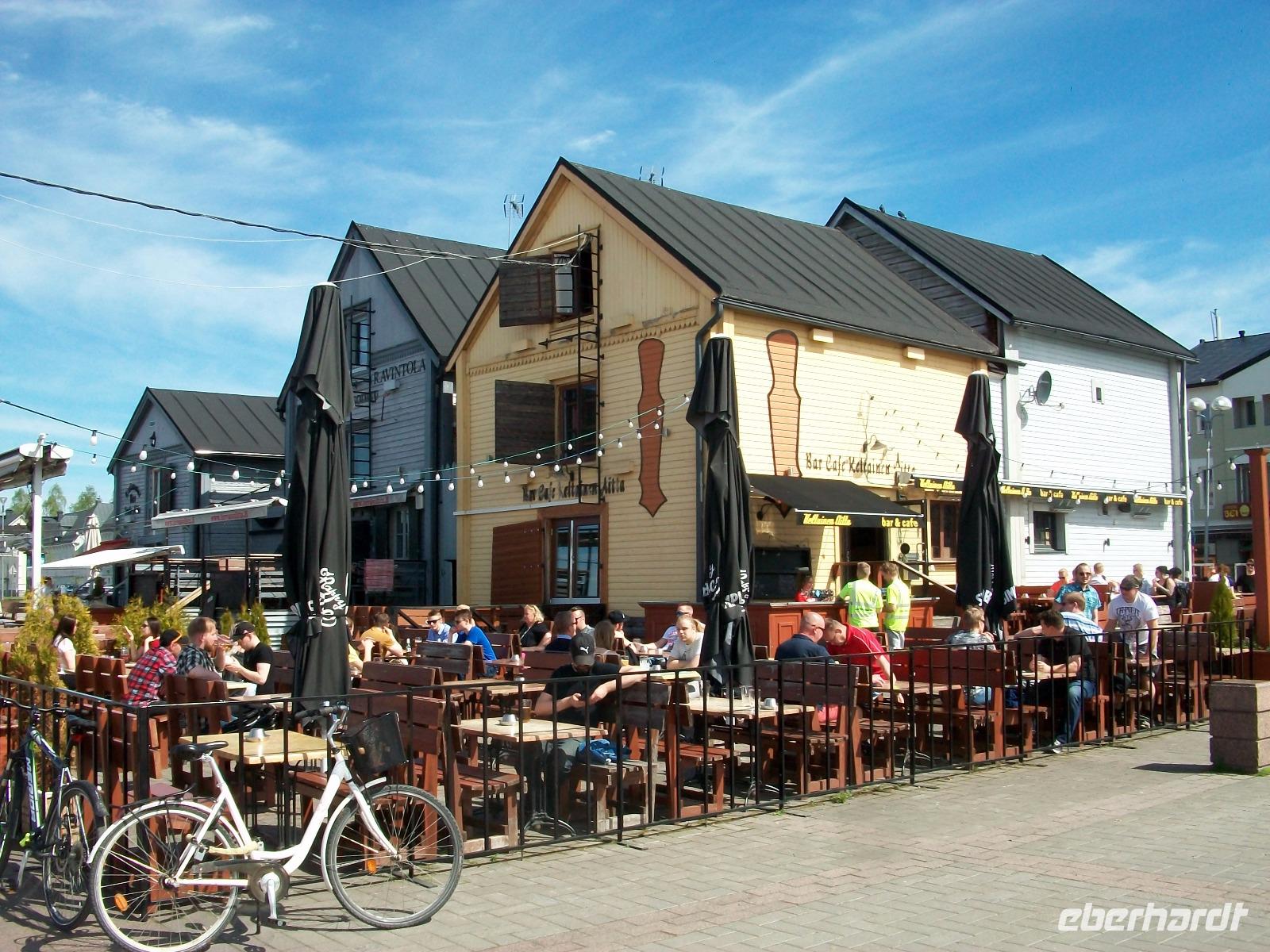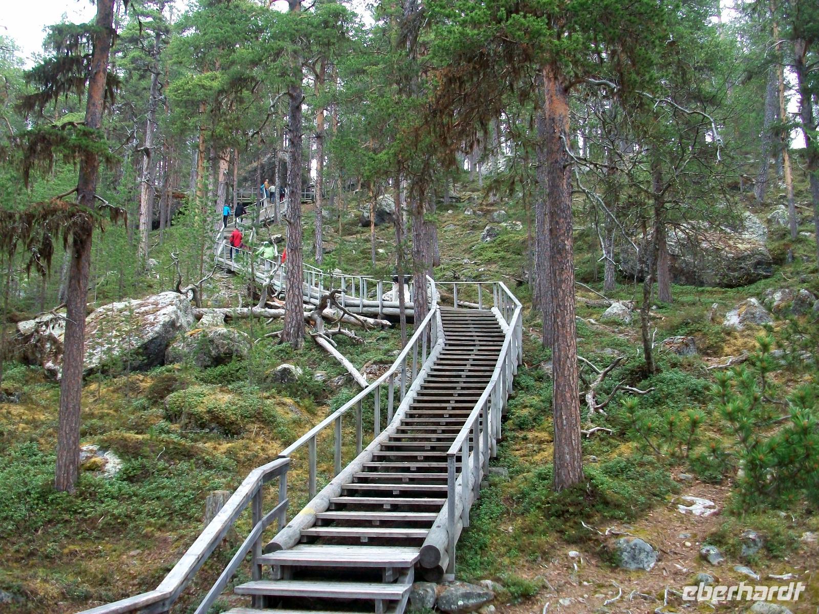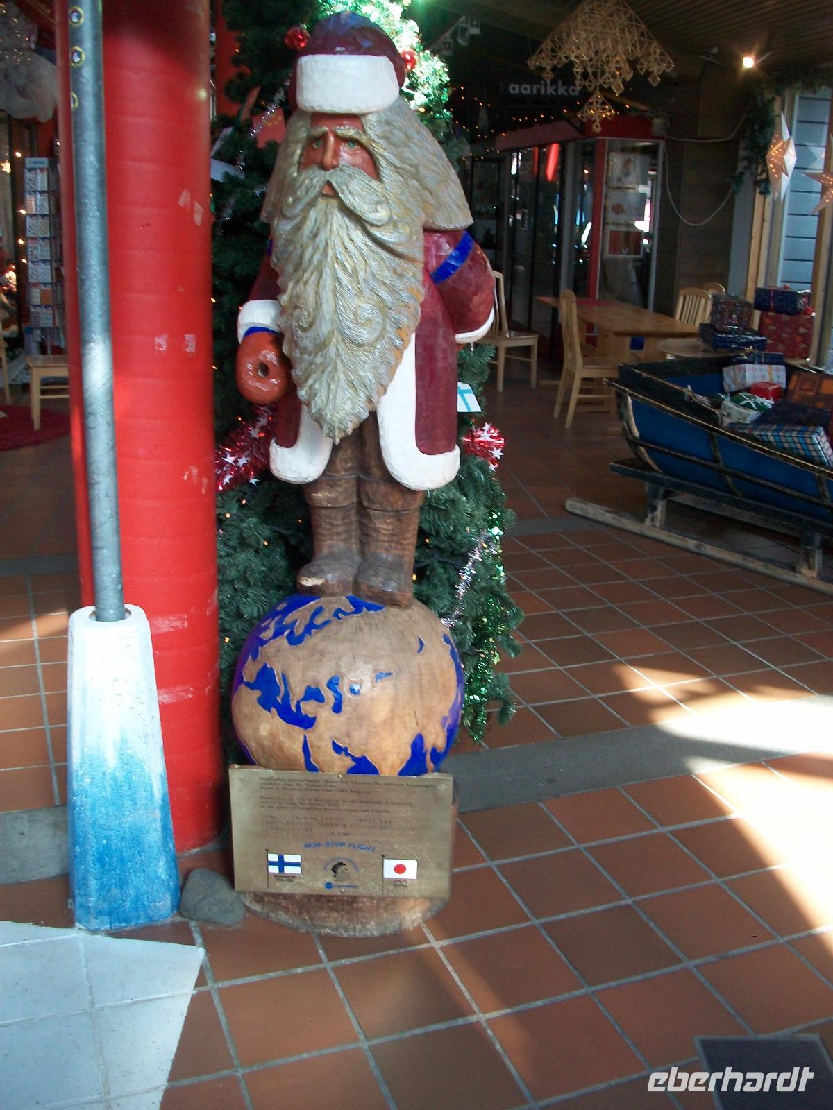 9.6.2017. Ein langer Tag liegt vor uns, deshalb müssen wir auch früh starten. Heute hat sich nun die Sonne herausgewagt, sie wird uns den ganzen Tag begleiten und für angenehme Temperaturen sorgen. Unser Weg führt uns nun weiter nach Norden; durch dünnbesiedelte Gebiete und unberührte Natur gelangen wir gegen Mittag zur bekannten finnischen Hafenstadt Oulu und in der Nähe des Wassers gönnen wir uns eine kurze Pause für eine Stippvisite. Es ist Markt und ein buntes Treiben empfängt uns bei sommerlichen Temperaturen. Lange können wir nicht verweilen, unser Weg ist noch weit und parallel des Bottnischen Meerbusens, es ist der nördliche Zipfel der Ostsee, gelangen wir in das Flusstal des Kemijoki. Die Kilometer verschwinden unter den Rädern des Busses, bald sehen wir die Häuser von Rovaniemi, dahinter liegt dann der Polarkreis. Es ist ein besonderer Ort denn hier wohnt der Weihnachtsmann. Als wir aussteigen werden wir von weihnachtlichen Klängen empfangen, bei über 20° Celsius ein eigenartiges Gefühl. Hier gönnen wir uns nun ein Stündchen Zeit; quer über den Asphalt ist ein dicker Strich gezogen, er symbolisiert den Polarkreis. Mit einem großen Schritt überschreiten wir ihn und schauen uns danach die Werkstatt des Weihnachtsmanns an der sich an diesem Ort doch tatsächlich die Ehre gibt! Wer möchte lässt sich mit ihm und den Wichteln fotografieren; während hier leise der Schnee rieselt haben wir draußen sommerliche Temperaturen. Hier gibt es auch ein Postamt und wer will kann schon heute die Weihnachtspost erledigen, ein besonderer Stempel kommt noch direkt vom Weihnachtsmann darauf.