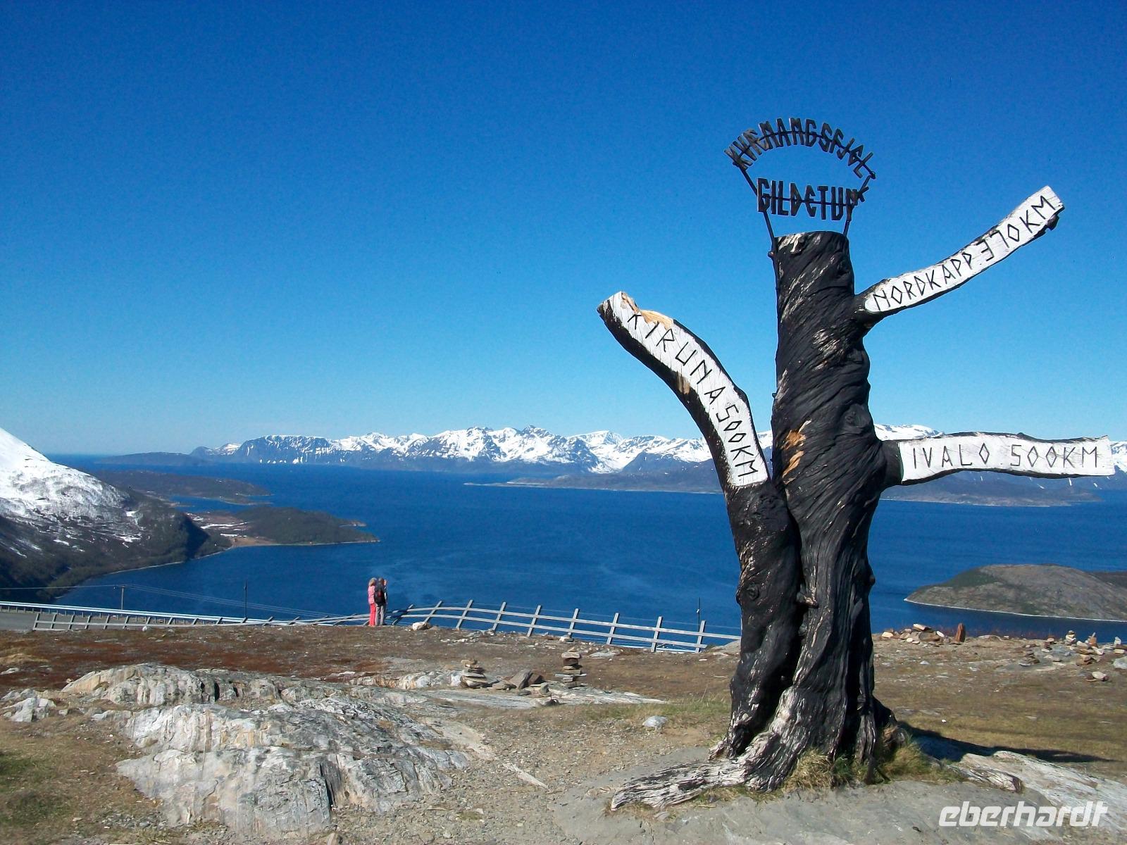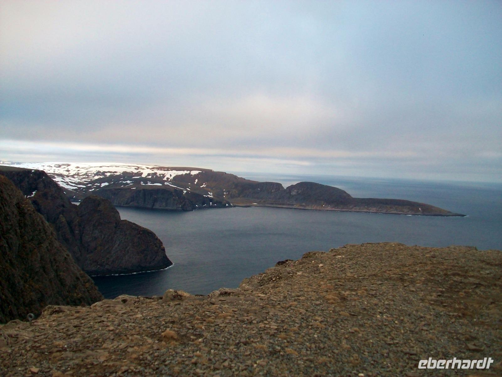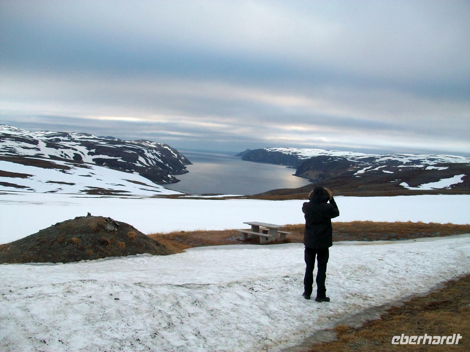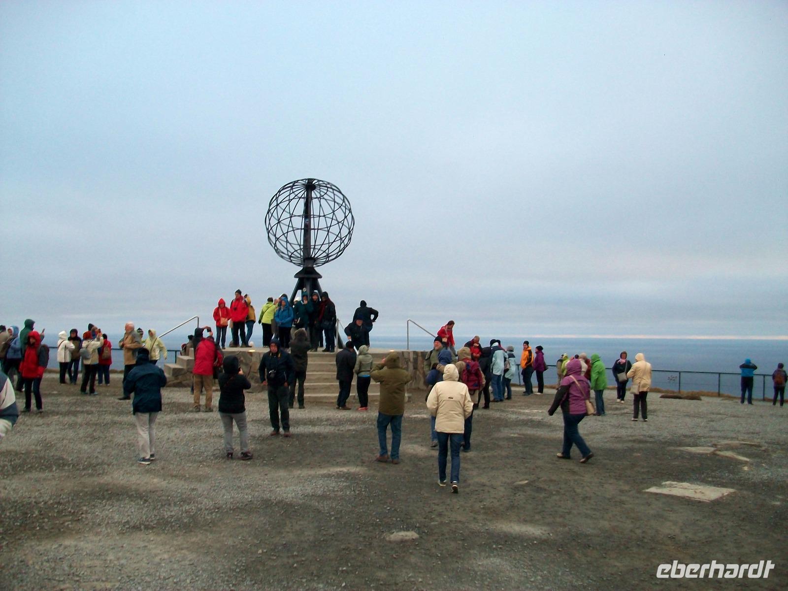 Dennoch starten wir gegen halb zehn; ein norwegischer Fahrer bringt uns nun zu Nordkap. Bis zur Mitternacht ist es noch etwas Zeit zum Besuch der zahlreichen Ausstellungen und dem Betrachten eines wirklich sehenswerten Filmes. Als es dann Mitternacht ist möchte sich uns die Sonne nicht zeigen, nur einen hellen Streifen sehen wir am Horizont, schade. Dennoch war es ein schöner Tag in einer sehenswerten Natur!