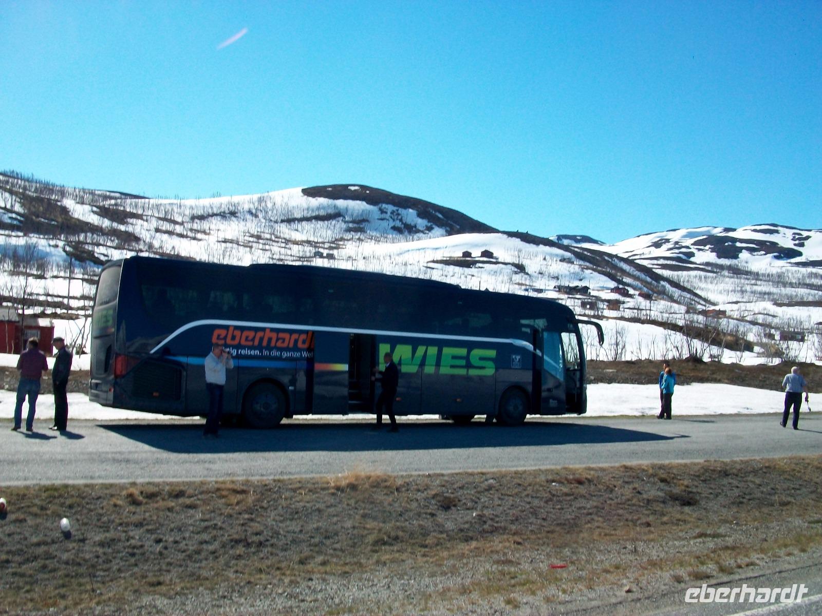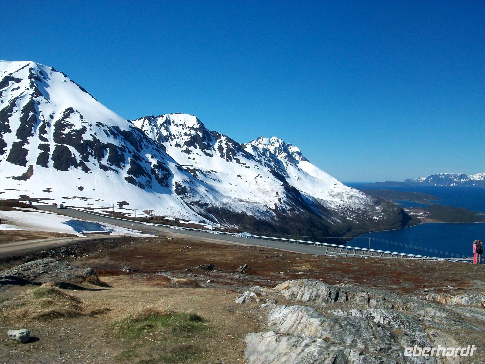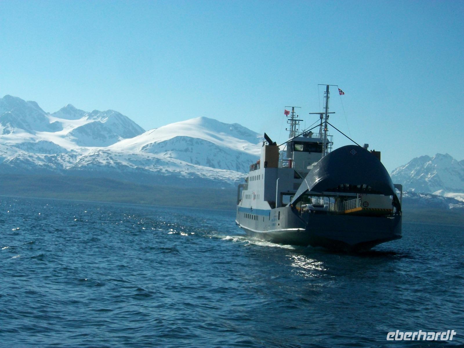 Wir müssen gar nicht lange auf das Schiff warten, schnell sind wir an Bord und nehmen oben im Salon Platz. Pünktlich geht es los und als wir den schützenden Hafen verlassen, macht sich doch ein kräftiger Seegang bemerkbar, doch bald haben wir uns an das Schaukeln gewöhnt, nur das Wetter bleibt leider regnerisch. Aber hier oben sitzen wir gut und trocken und genießen dennoch die schöne Überfahrt die dann im Ort Skutvik endet. Ab hier geht es nun mit dem Bus weiter und bald können wir von der Küstenstraße die schönen Ausblicke genießen die uns das Land Norwegen bietet. Unsere Fahrt führt uns auch über die Fjelle und eines der eindrucksvollsten ist das Saltfjell, bei unserer Fahrt hinauf sind wir im Winter. Hier oben verläuft der Polarkreis den wir nun, auf norwegischer Seite, in umgekehrter Richtung erneut passieren. Hier oben haben sich noch meterhohe Schneewehen erhalten, ein komisches Gefühl im Juni.