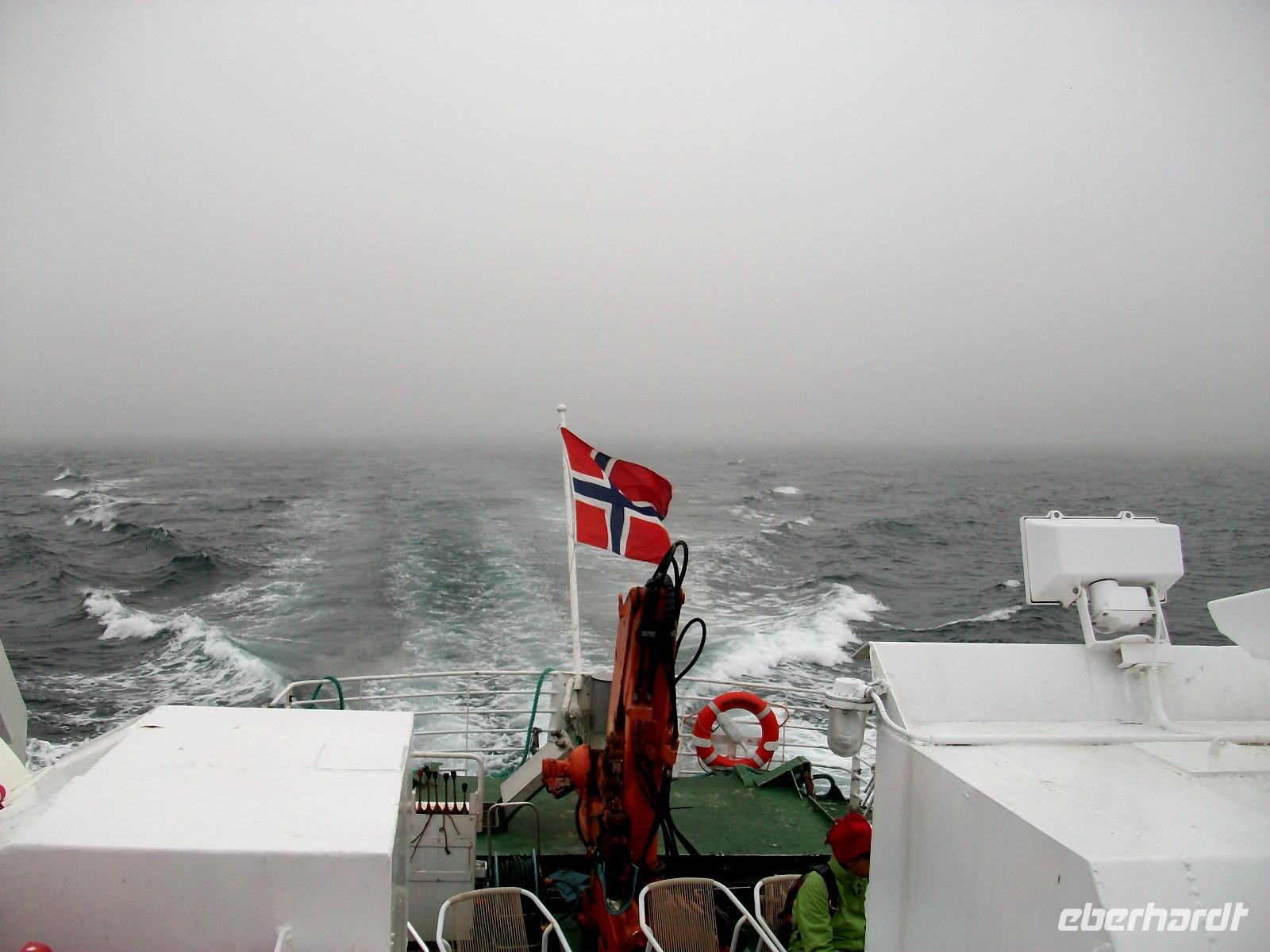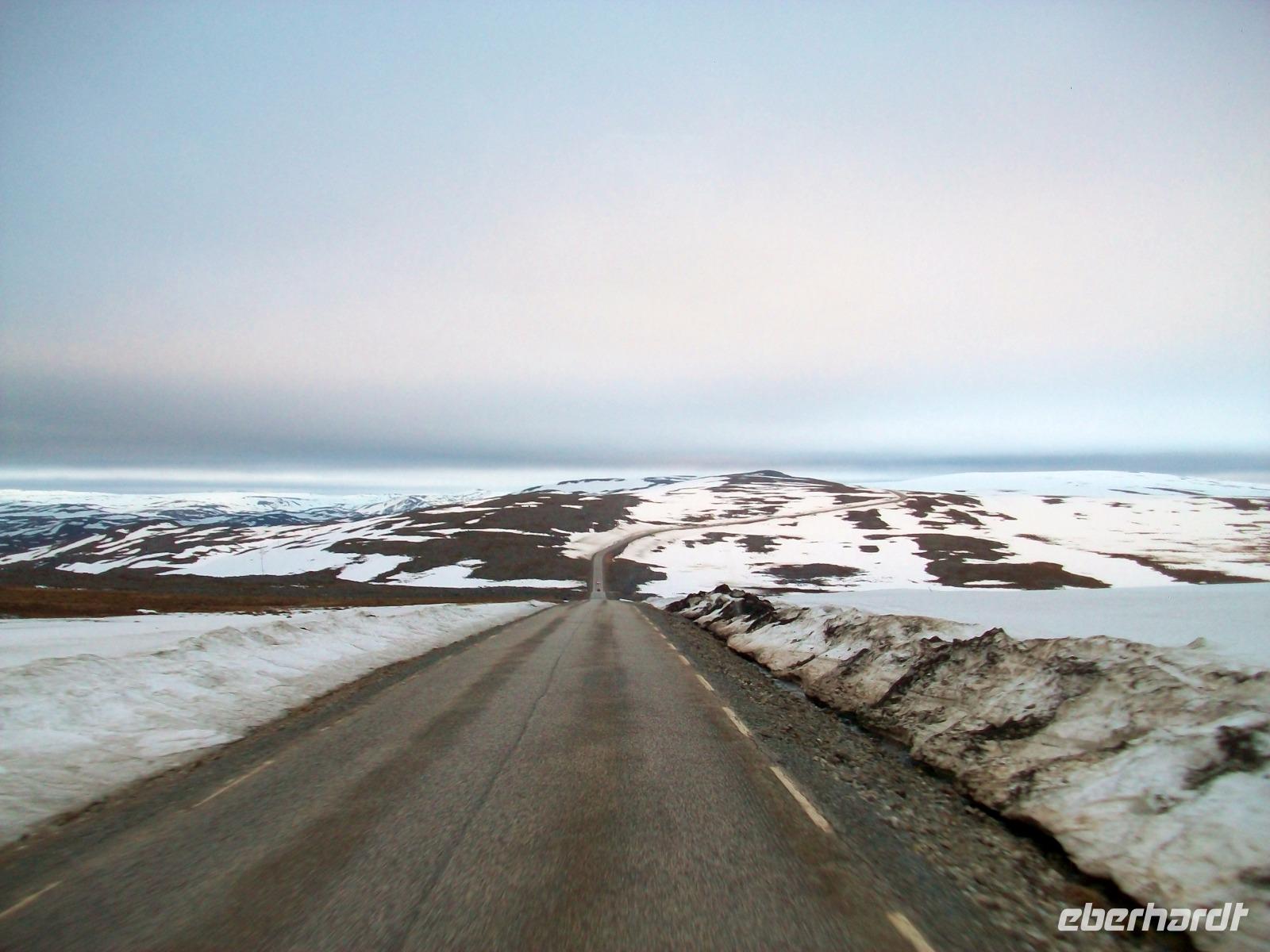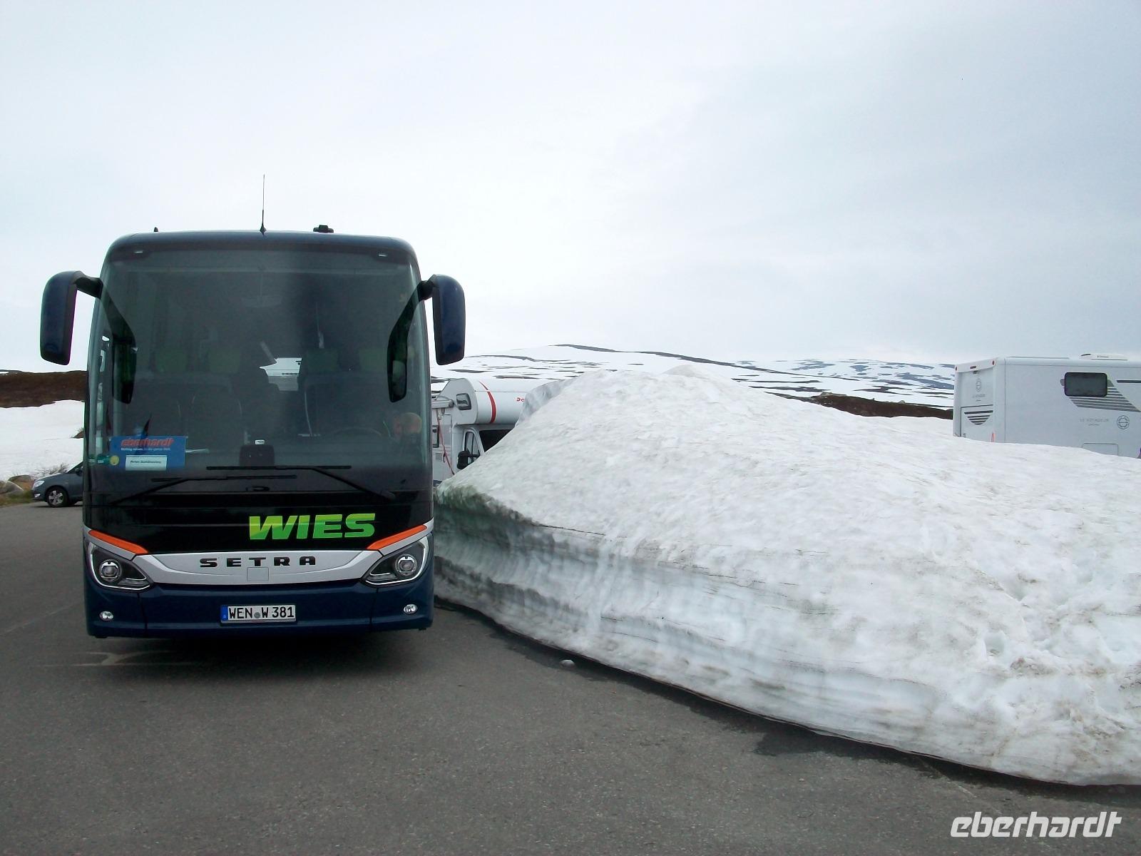 Wir müssen gar nicht lange auf das Schiff warten, schnell sind wir an Bord und nehmen oben im Salon Platz. Pünktlich geht es los und als wir den schützenden Hafen verlassen, macht sich doch ein kräftiger Seegang bemerkbar, doch bald haben wir uns an das Schaukeln gewöhnt, nur das Wetter bleibt leider regnerisch. Aber hier oben sitzen wir gut und trocken und genießen dennoch die schöne Überfahrt die dann im Ort Skutvik endet. Ab hier geht es nun mit dem Bus weiter und bald können wir von der Küstenstraße die schönen Ausblicke genießen die uns das Land Norwegen bietet. Unsere Fahrt führt uns auch über die Fjelle und eines der eindrucksvollsten ist das Saltfjell, bei unserer Fahrt hinauf sind wir im Winter. Hier oben verläuft der Polarkreis den wir nun, auf norwegischer Seite, in umgekehrter Richtung erneut passieren. Hier oben haben sich noch meterhohe Schneewehen erhalten, ein komisches Gefühl im Juni.