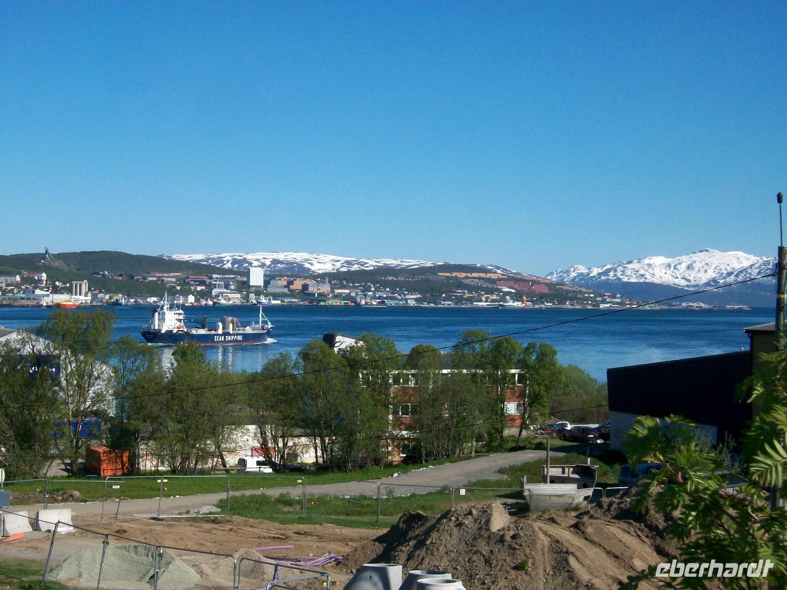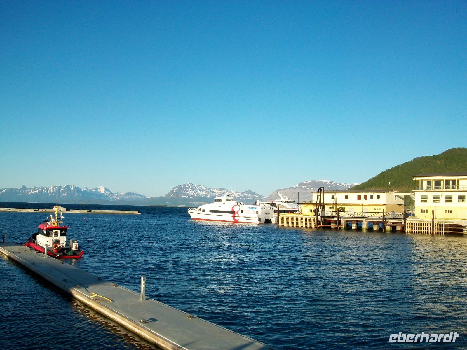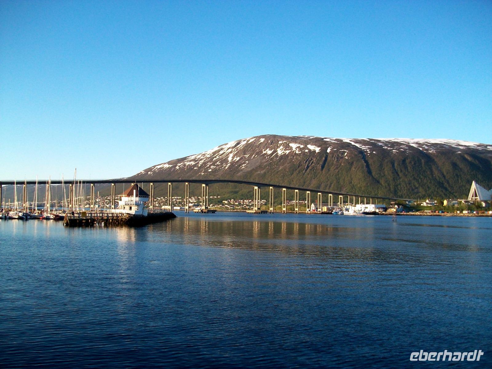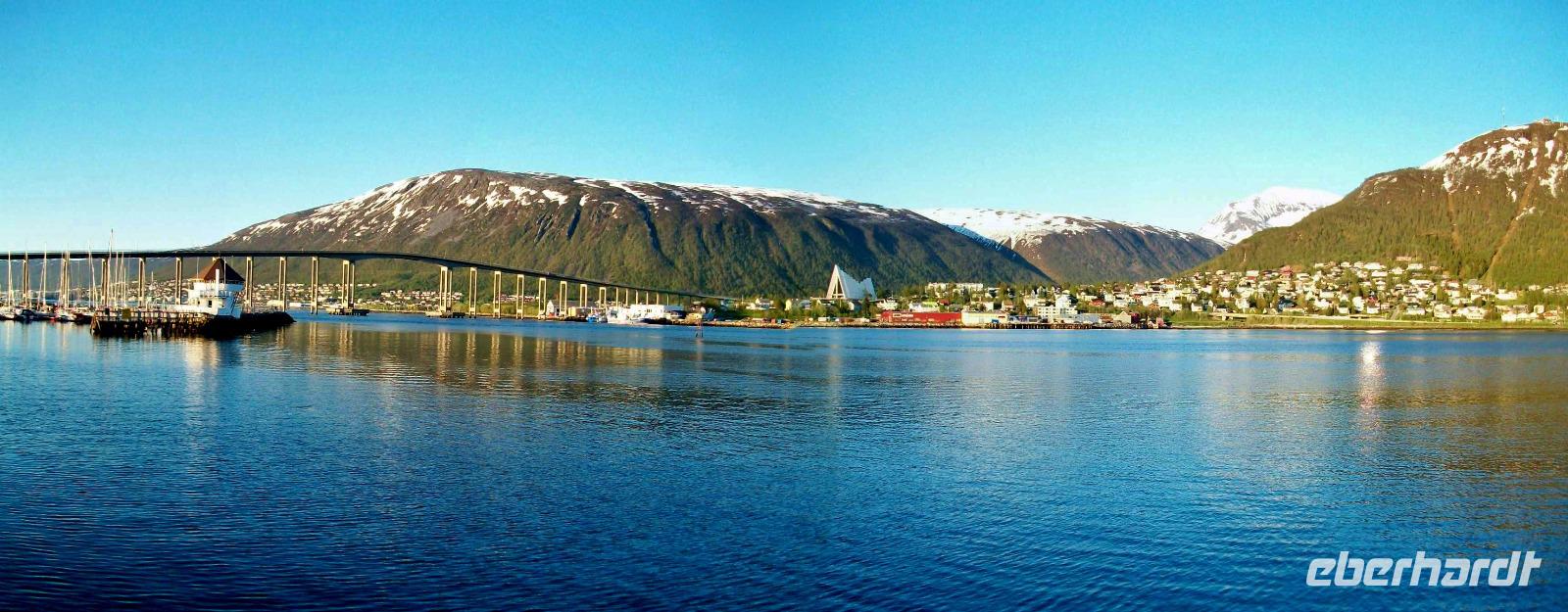 Fortan führt uns die Fahrt entlang des Wassers; wir sehen die Fjorde die in direkter Verbindung mit dem Eismeer stehen; überall grünt es und zusammen mit dem blauen Himmel und den schneebedeckten Bergen wird diese Fahrt zum Hochgenuss. Mit jedem Kilometer den wir zurücklegen offenbaren sich uns neue gigantische Blicke, dabei vergeht die Zeit wie im Flug. Dennoch dürfen wir nicht trödeln, wir haben heute noch zwei Fährüberfahrten vor uns um zu unserem Ziel zu kommen. Pünktlich langen wir auch in Olderdalen an, bald kommt die Fähre herüber und wir gelangen mit dem Bus an Bord. Nun steht uns eine schöne Überfahrt bevor und nur leicht schaukelnd erreichen wir das gegenüberliegende Ufer. Noch eine Etappe mit dem Bus eine erneute Überfahrt und schließlich kommen wir dann gegen halb acht in Tromsø an. Dieser Ort hat eine wunderschöne Lage auf einer Insel die mit einer beeindruckenden Brücke verbunden ist. Nach dem Abendessen gibt es Zeit für Erkundungen in dieser schönen Stadt, dabei scheint auch noch gegen elf die Sonne, es ist schon ein komisches Gefühl, denn in der Heimat ist es nun schon längst dunkel geworden. Und so klingt dieser Tag recht ruhig aus.