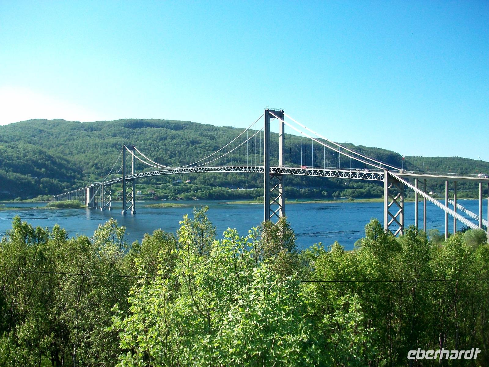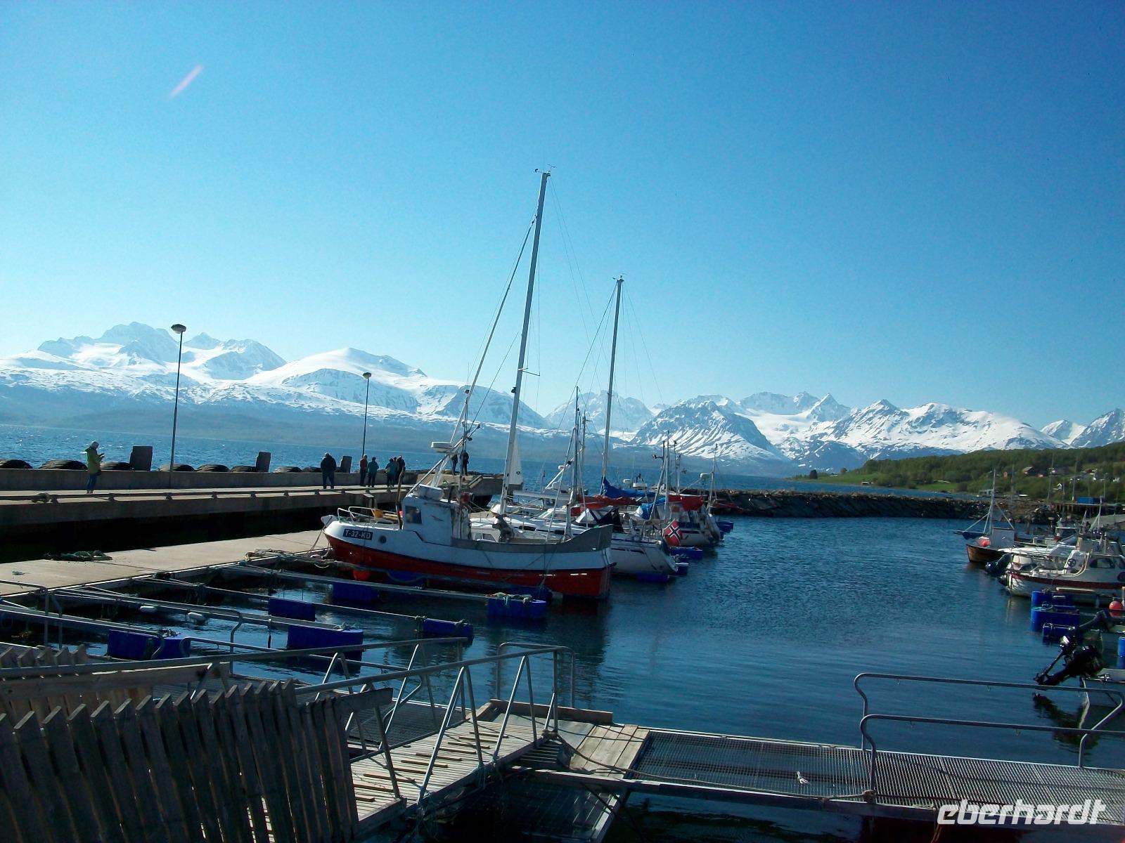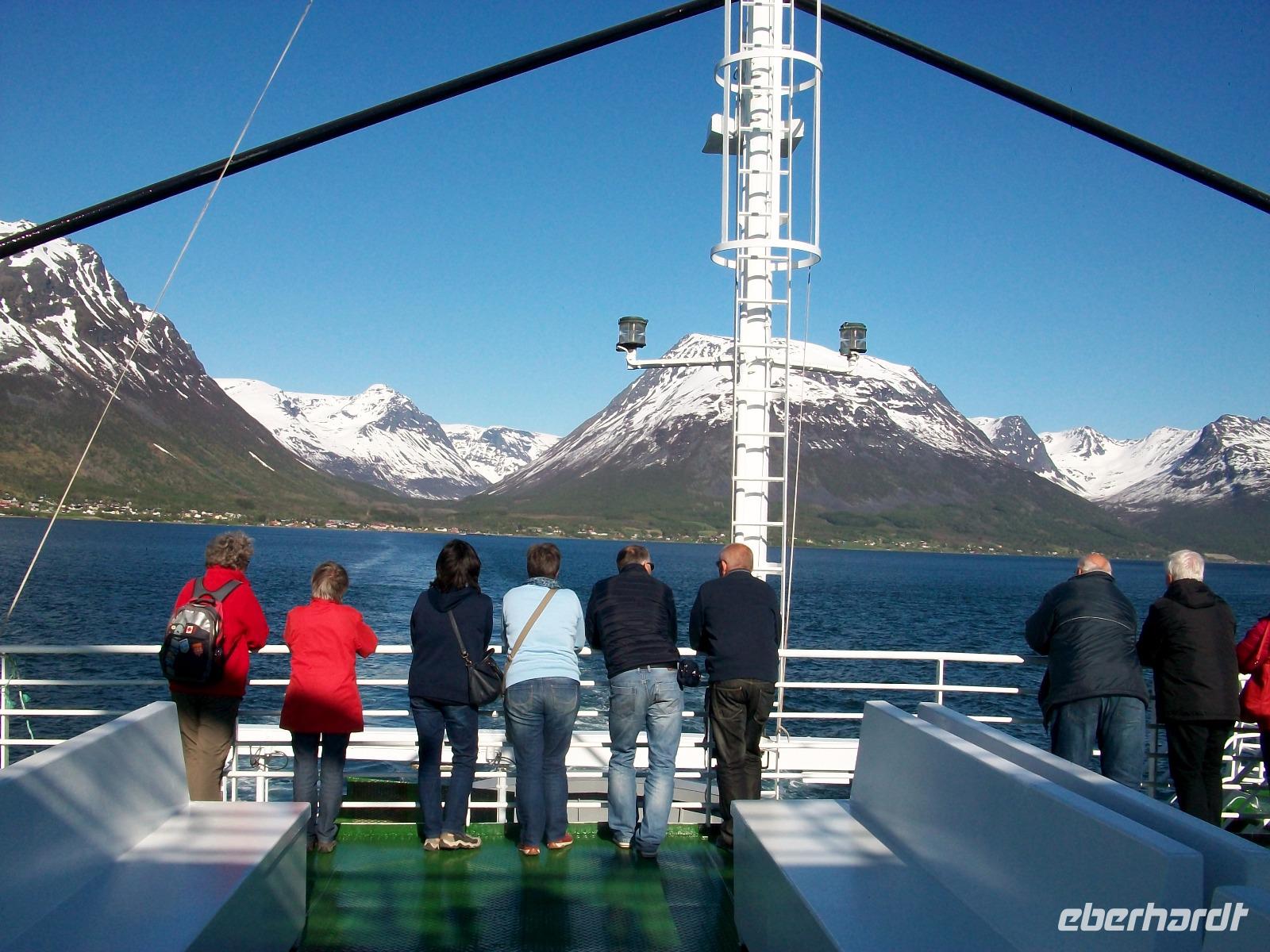 Fortan führt uns die Fahrt entlang des Wassers; wir sehen die Fjorde die in direkter Verbindung mit dem Eismeer stehen; überall grünt es und zusammen mit dem blauen Himmel und den schneebedeckten Bergen wird diese Fahrt zum Hochgenuss. Mit jedem Kilometer den wir zurücklegen offenbaren sich uns neue gigantische Blicke, dabei vergeht die Zeit wie im Flug. Dennoch dürfen wir nicht trödeln, wir haben heute noch zwei Fährüberfahrten vor uns um zu unserem Ziel zu kommen. Pünktlich langen wir auch in Olderdalen an, bald kommt die Fähre herüber und wir gelangen mit dem Bus an Bord. Nun steht uns eine schöne Überfahrt bevor und nur leicht schaukelnd erreichen wir das gegenüberliegende Ufer. Noch eine Etappe mit dem Bus eine erneute Überfahrt und schließlich kommen wir dann gegen halb acht in Tromsø an. Dieser Ort hat eine wunderschöne Lage auf einer Insel die mit einer beeindruckenden Brücke verbunden ist. Nach dem Abendessen gibt es Zeit für Erkundungen in dieser schönen Stadt, dabei scheint auch noch gegen elf die Sonne, es ist schon ein komisches Gefühl, denn in der Heimat ist es nun schon längst dunkel geworden. Und so klingt dieser Tag recht ruhig aus.