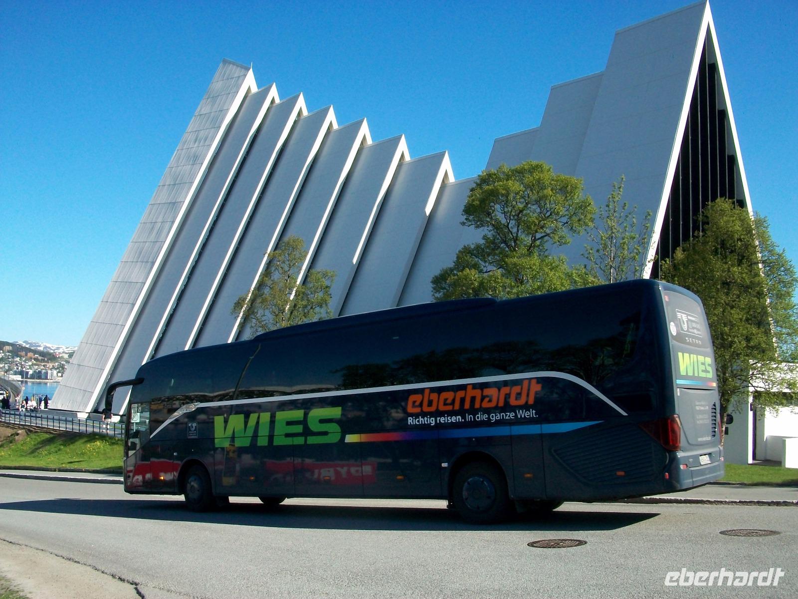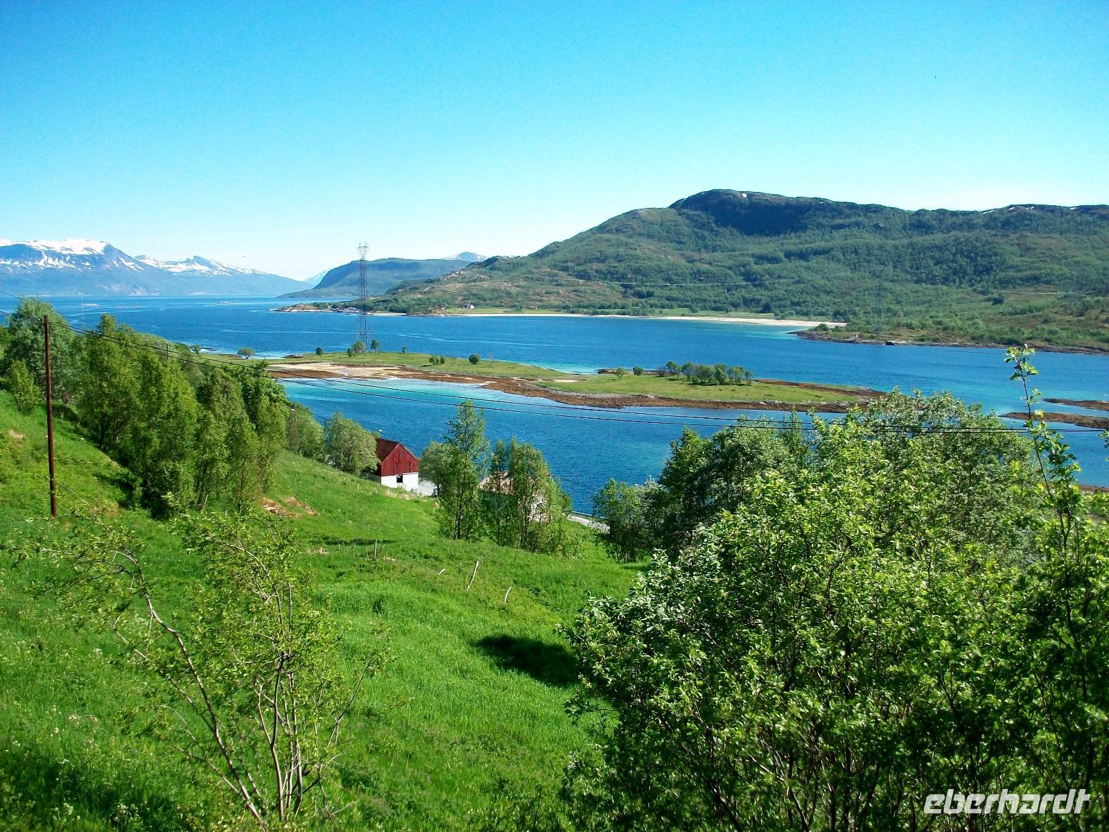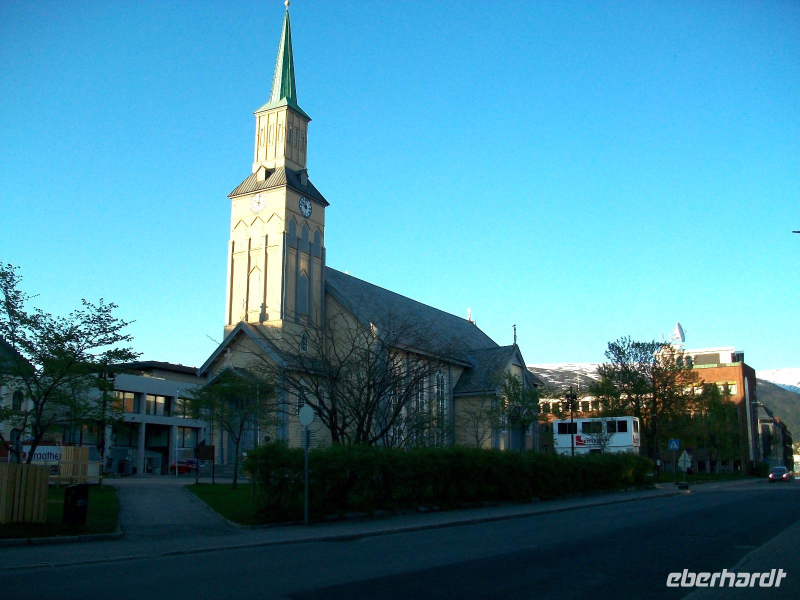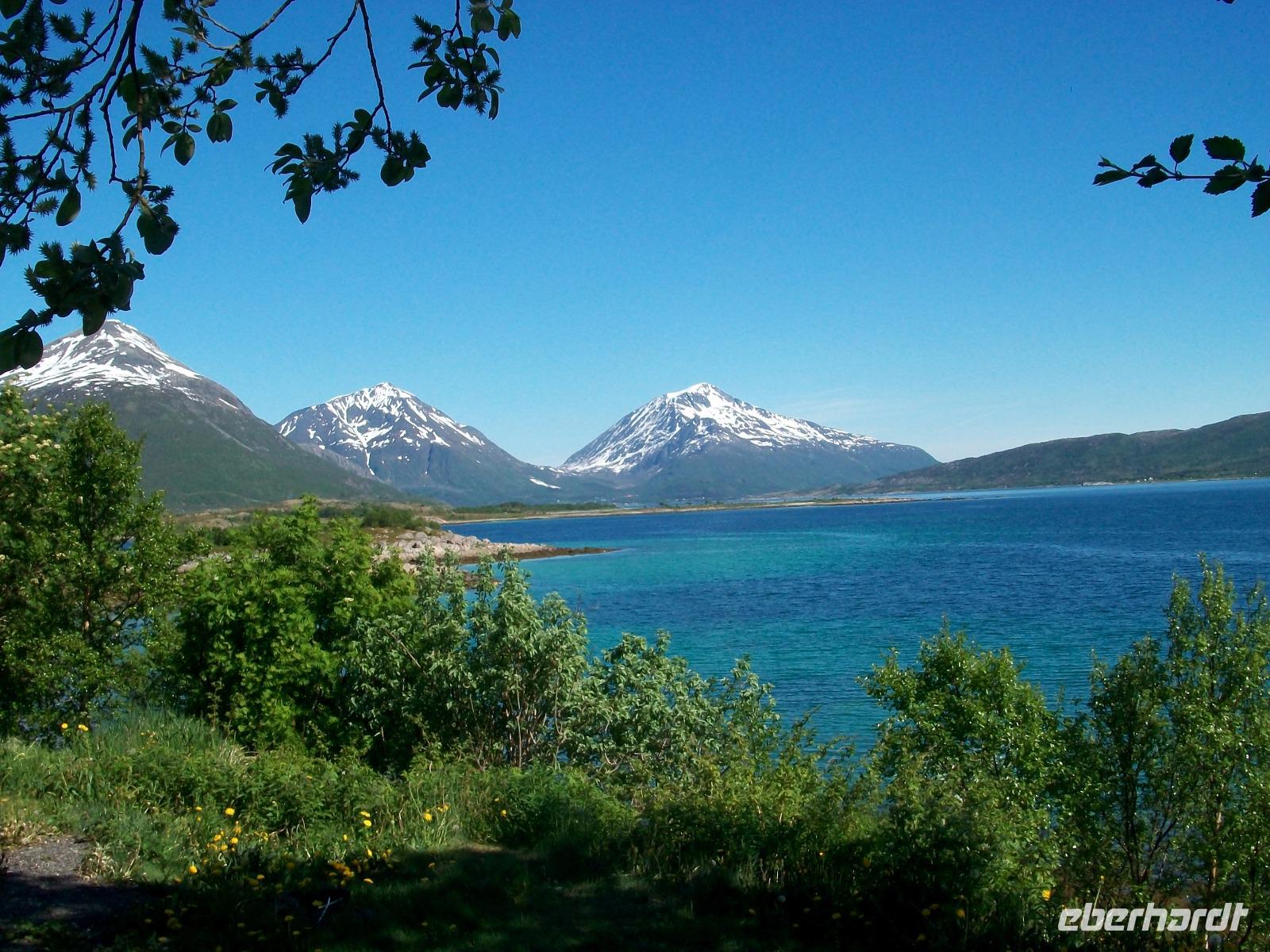 Fortan führt uns die Fahrt entlang des Wassers; wir sehen die Fjorde die in direkter Verbindung mit dem Eismeer stehen; überall grünt es und zusammen mit dem blauen Himmel und den schneebedeckten Bergen wird diese Fahrt zum Hochgenuss. Mit jedem Kilometer den wir zurücklegen offenbaren sich uns neue gigantische Blicke, dabei vergeht die Zeit wie im Flug. Dennoch dürfen wir nicht trödeln, wir haben heute noch zwei Fährüberfahrten vor uns um zu unserem Ziel zu kommen. Pünktlich langen wir auch in Olderdalen an, bald kommt die Fähre herüber und wir gelangen mit dem Bus an Bord. Nun steht uns eine schöne Überfahrt bevor und nur leicht schaukelnd erreichen wir das gegenüberliegende Ufer. Noch eine Etappe mit dem Bus eine erneute Überfahrt und schließlich kommen wir dann gegen halb acht in Tromsø an. Dieser Ort hat eine wunderschöne Lage auf einer Insel die mit einer beeindruckenden Brücke verbunden ist. Nach dem Abendessen gibt es Zeit für Erkundungen in dieser schönen Stadt, dabei scheint auch noch gegen elf die Sonne, es ist schon ein komisches Gefühl, denn in der Heimat ist es nun schon längst dunkel geworden. Und so klingt dieser Tag recht ruhig aus.