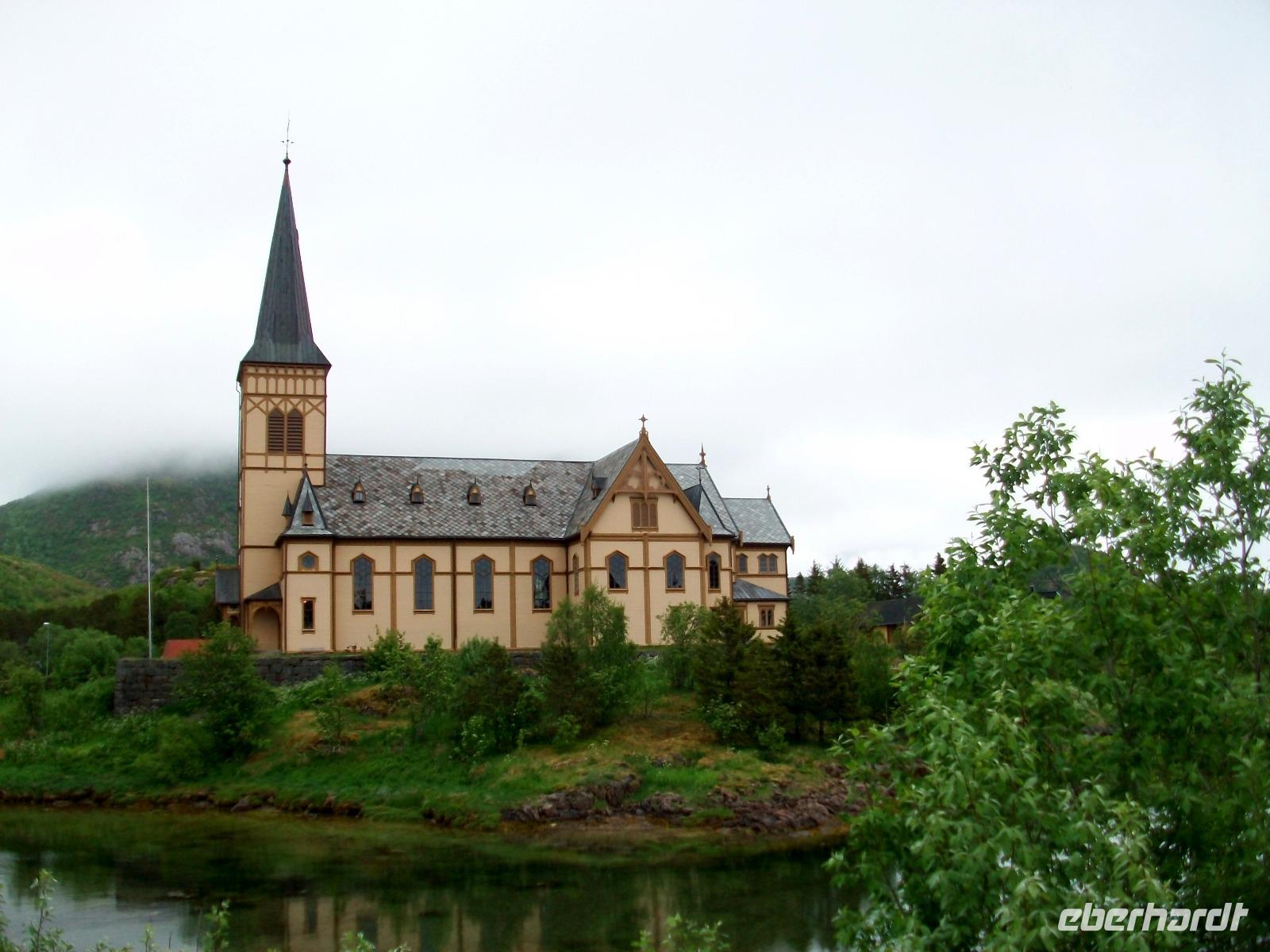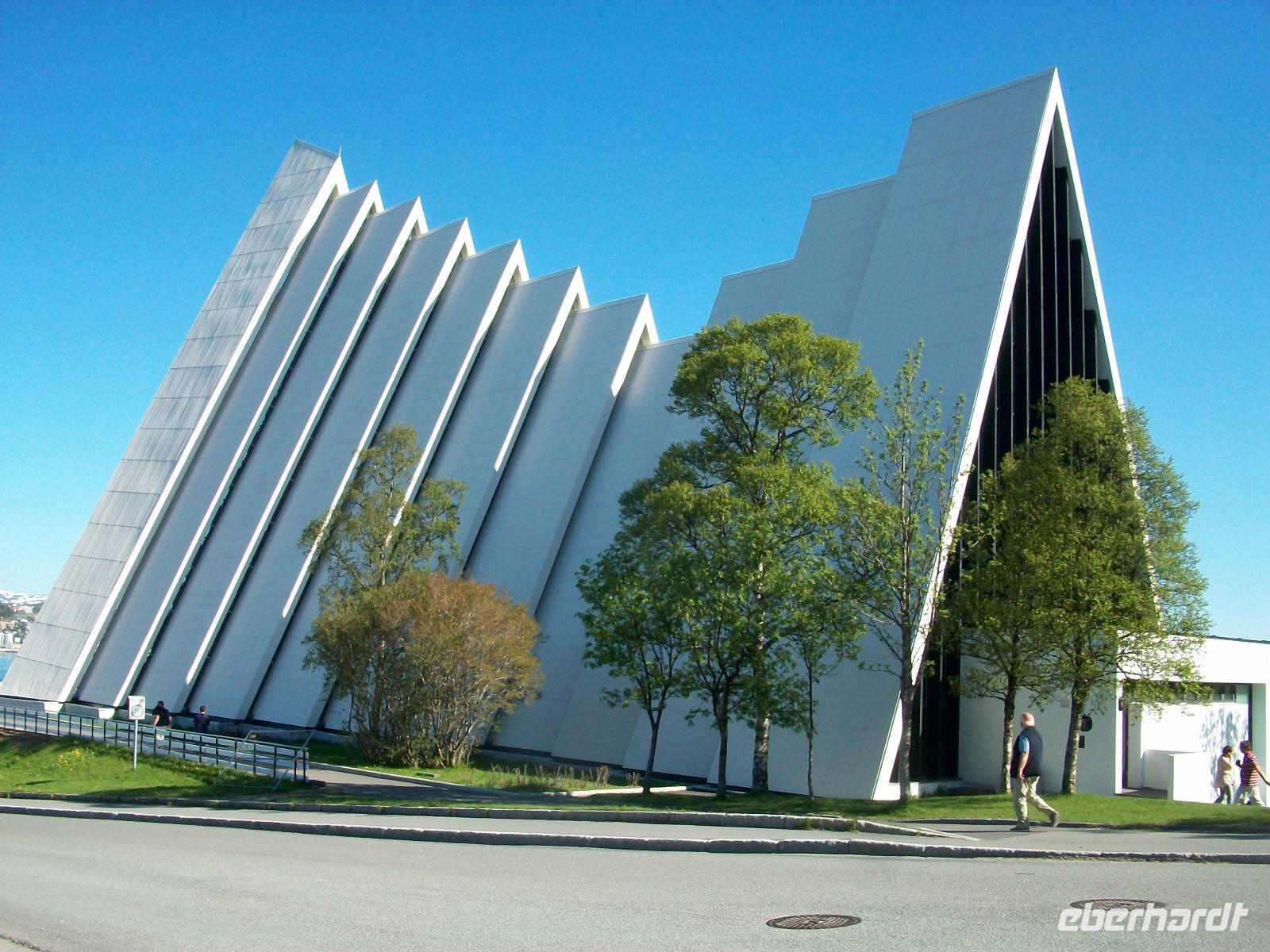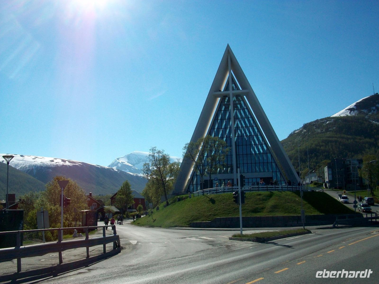 12.6.2017. Die Sonne lacht vom blauen Himmel herab als wir Tromsø über die Brücke verlassen und der sehenswerten Eismeerkathedrale einen Besuch abstatten. Es ist ein moderner Bau und im Inneren beeindrucken uns die schönen und bunt gestalteten Glasfenster.