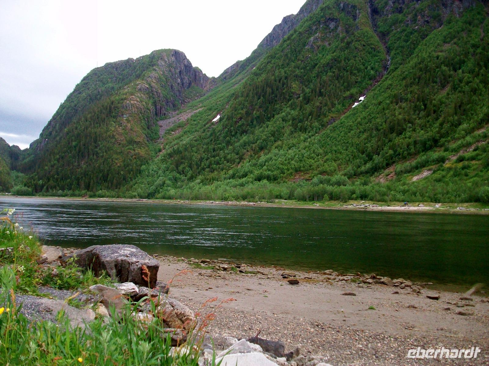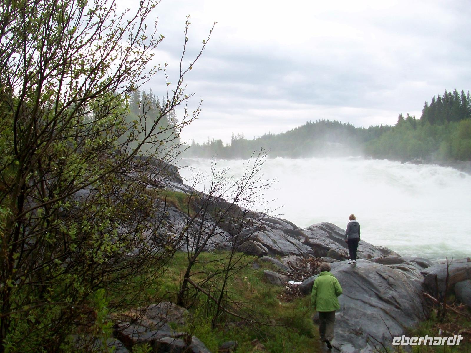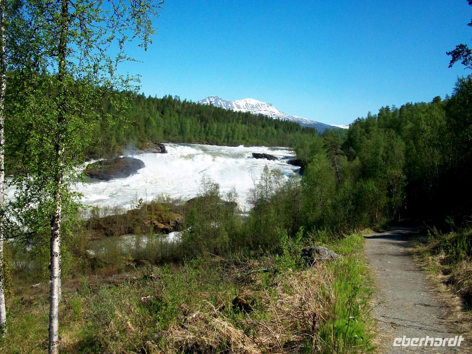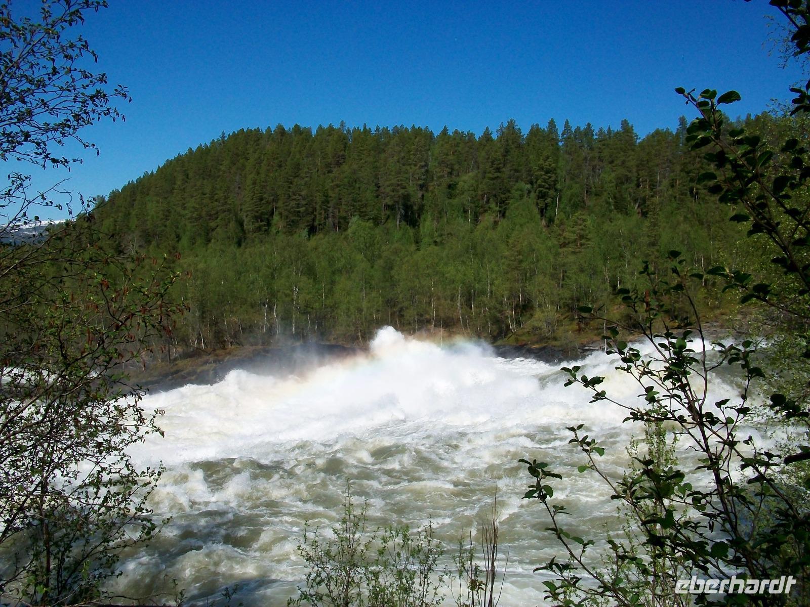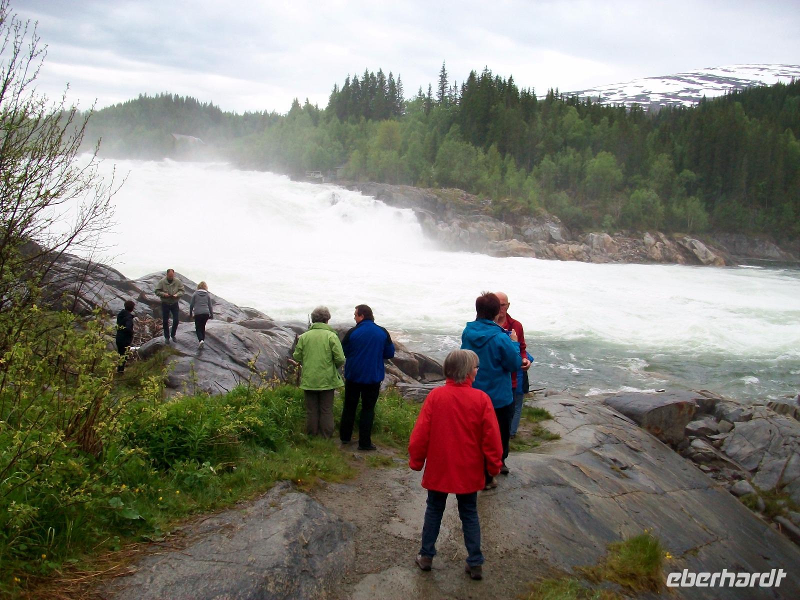 Weiter geht unsere Tour durch die schöne norwegische Landschaft der Fjorde, entlang von grünen Wiesen und schneebedeckten Berge einem grandiosen Naturereignis entgegen. Etwas im Hinterland gibt es einen Wasserfall dessen Besuch zu den beeindrucktesten Erlebnissen unserer Reise zählen wird, es ist der Målselvfossen. Gebildet von dem gleichnamigen Fluss der auch ein Lachsfluss ist, wird er uns hier ein Beispiel für die Macht der Natur gegeben. Am oberen Ufer befindet sich ein schönes Restaurant, hier genehmigen wir uns erst einmal eine leckere Lachssuppe. Danach geht es auf Erkundung zu dieser Stromschnelle. Die Wassermassen donnern über zahlreiche Barrieren rauschend zu Tal; direkt am Wasser müssen wir die Luft anhalten, welche Macht hier ungebändigt losgelassen ist und wie zerbrechlich wir doch in Anbetracht dieser Kraft sind.