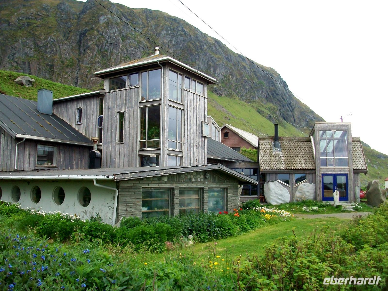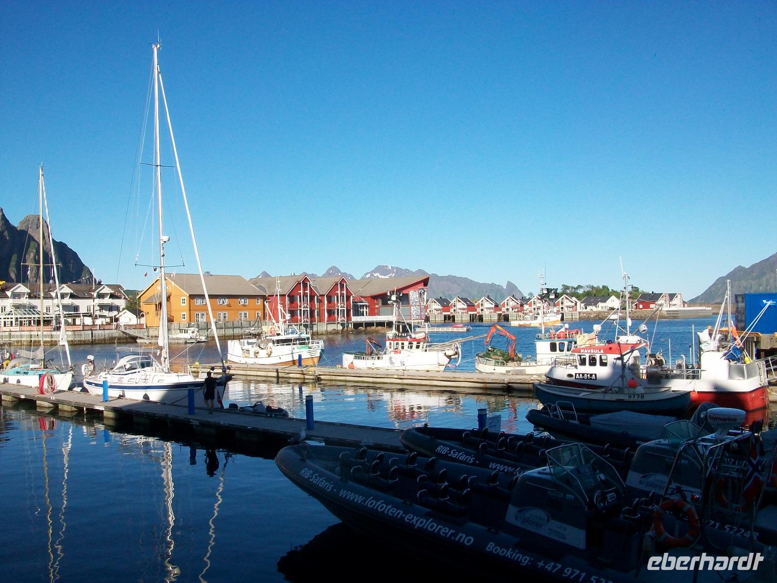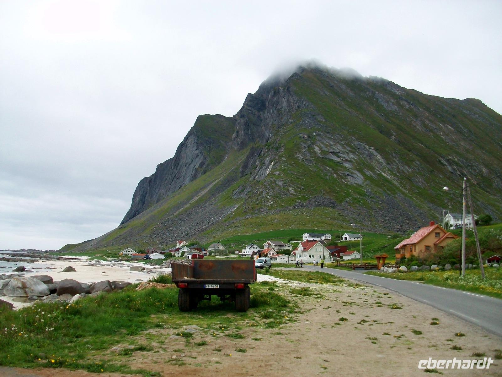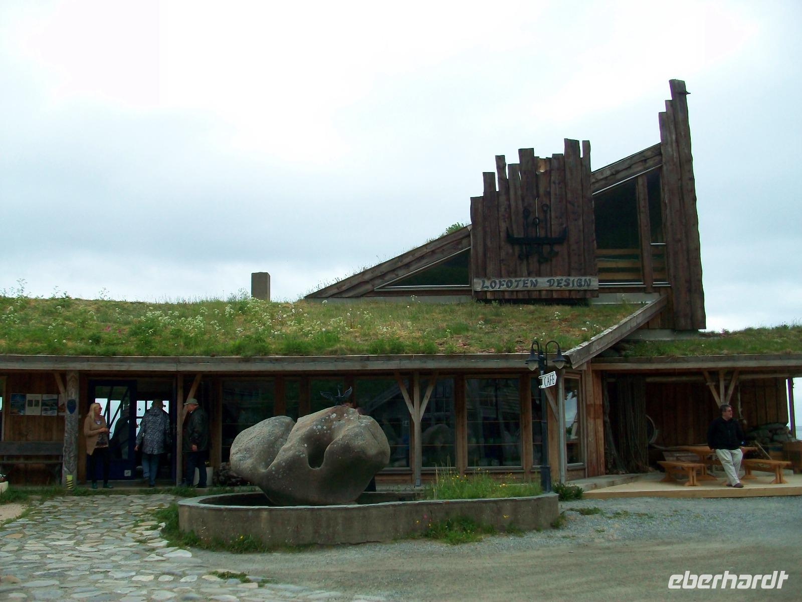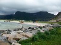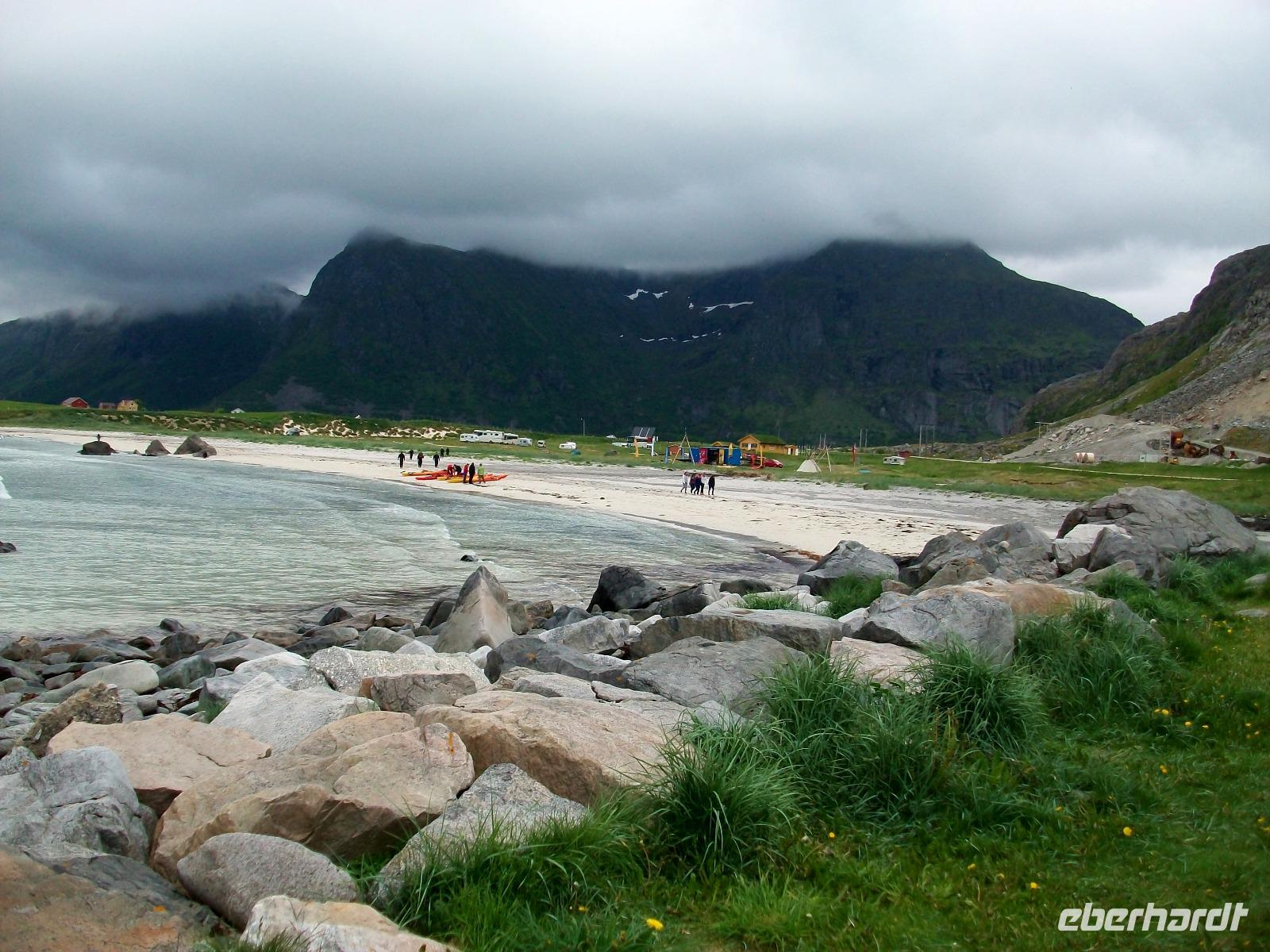 Dann geht es weiter mit der Erkundung der Lofoten; entlang einer schmalen Straße kommen uns bald die Häuser des Ortes Vikten entgegen, hier wird seit langer Zeit Töpferei und Glasbläserei betrieben. Wir betrachten uns die wirklich schönen und kunstvoll gearbeiteten Stücke, eine gute Möglichkeit ein geschmackvolles Souvenir mit nach Hause zu nehmen. Dann führt uns der Weg noch nach Flakstad; hier gibt es den bekannten weißen Stand zu bewundern an welchem gerade einige Kanus anlegen um hier ihren Ausflug zu beenden.