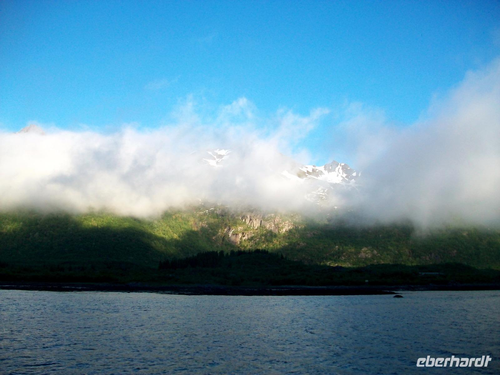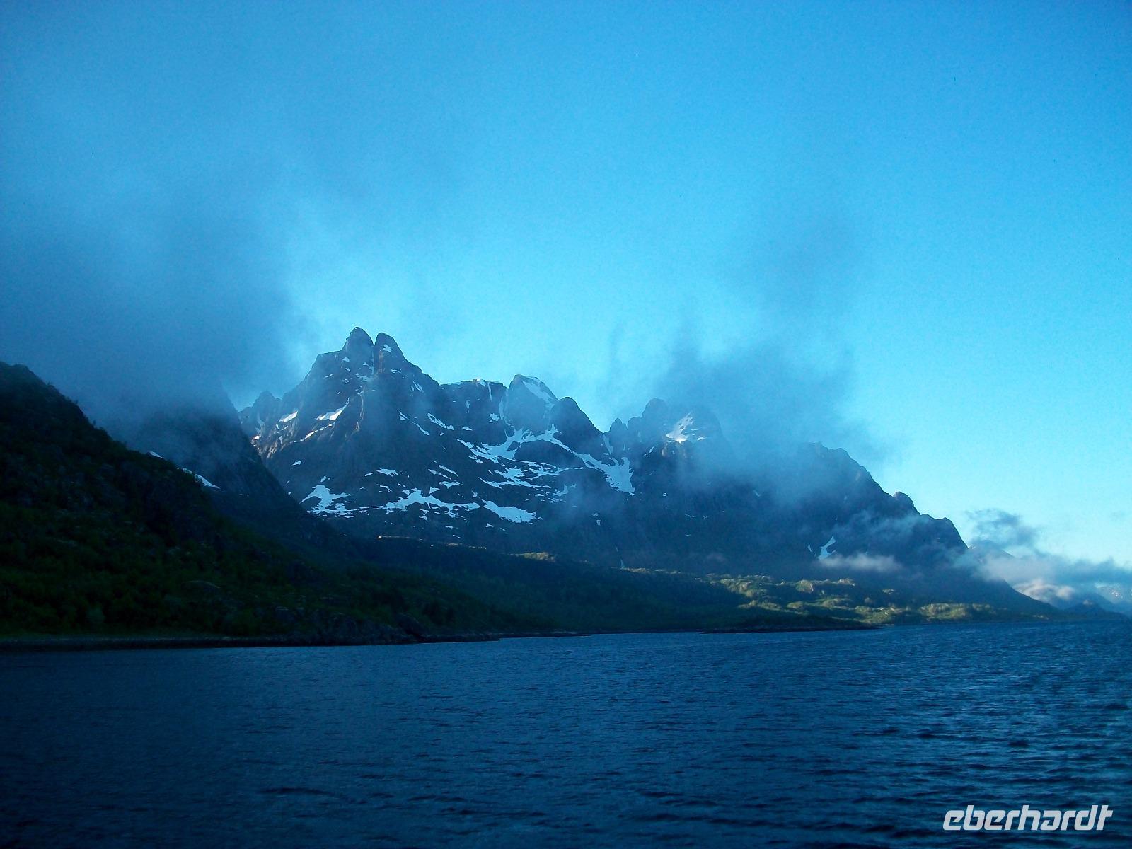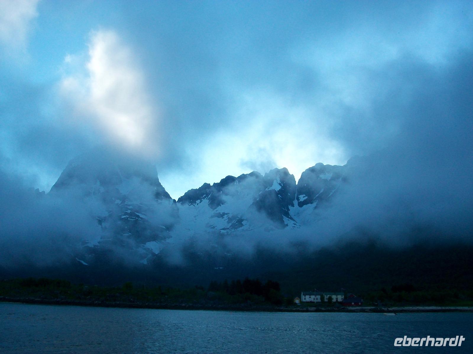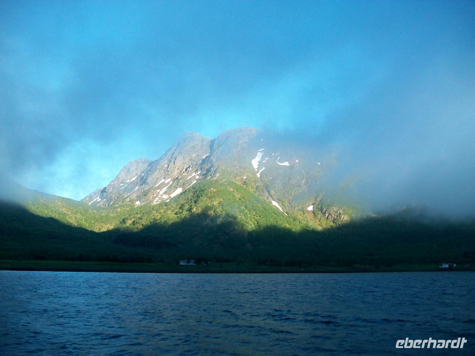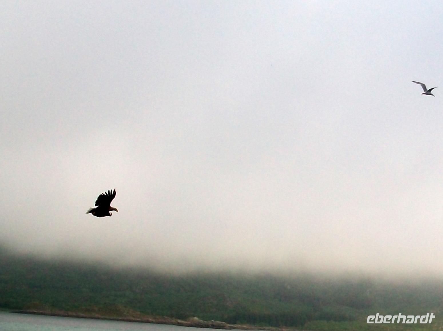 Am zeitigen Nachmittag gelangen wir zum vereinbarten Treffpunkt in unberührter Natur und fast am Ende der Welt. Als die Zeit heran ist fehlt das Schiff; nach einer Viertelstunde versuche ich Kontakt aufzunehmen, der Partner vor Ort kommt wenig später mit der Nachricht, dass es vorerst keine Bootsfahrt geben kann, schade. Mit dem Bus gelangen wir dann zum Hotel in Svolvær, kurz vorher erfahre ich, dass wir dann nach dem Abendessen die Seeadlersafari nachholen können, eine gute Nachricht! Da lassen wir uns auch nicht lange bitten und starten gegen acht, leider kommen gerade jetzt tiefliegende Wolken hereingeschwebt und nehmen uns vorerst die Sicht.