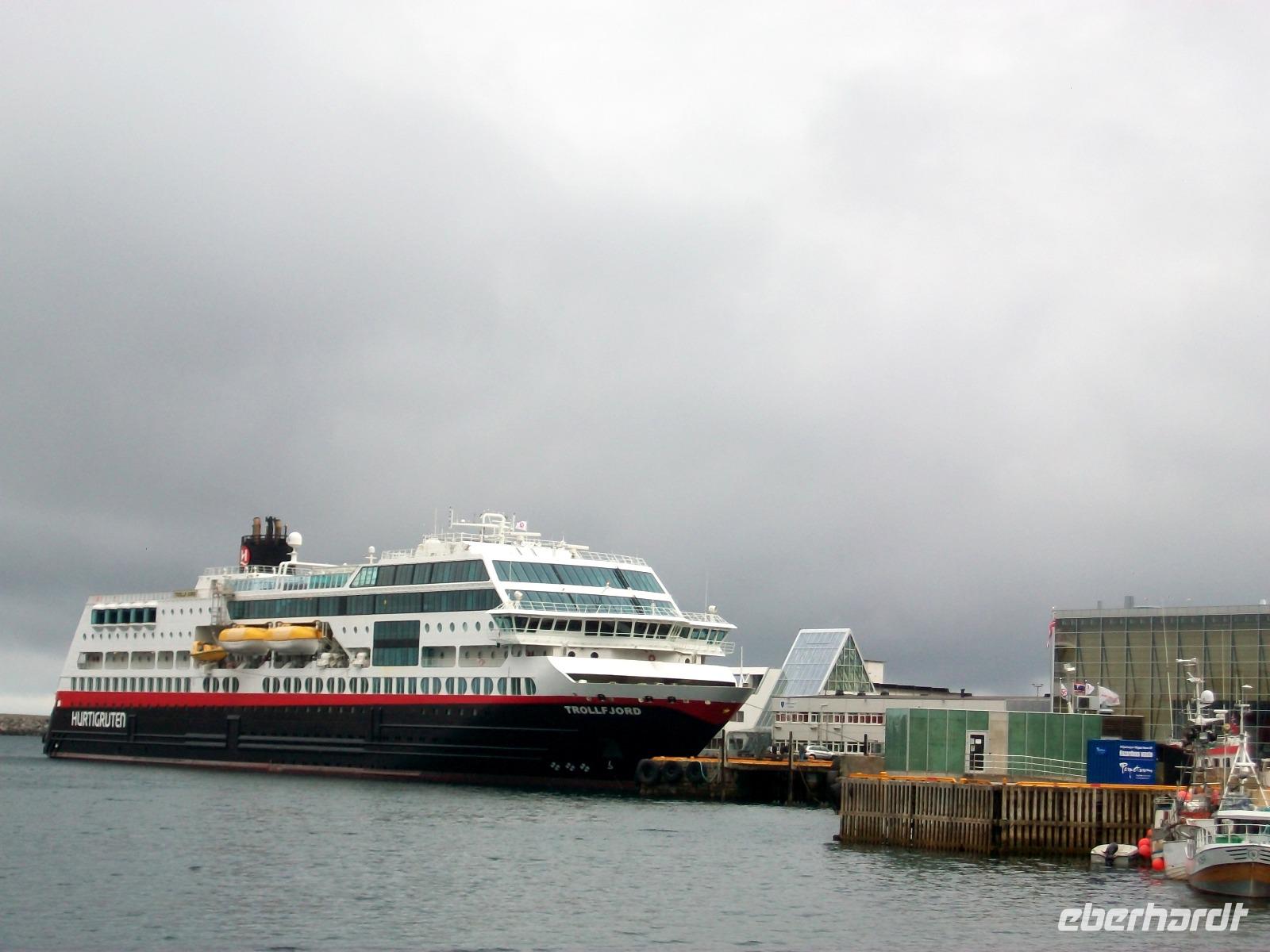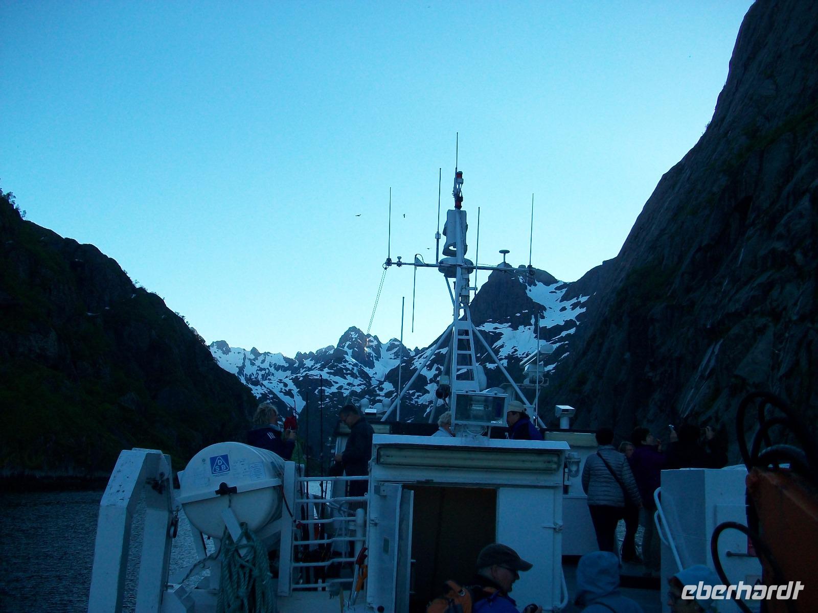 Das Schiff nimmt Fahrt auf und bald kommt ein erster Seeadler in unser Blickfeld. Mit einem Fisch wird er angelockt und umschwebt elegant das Boot, die Kameras klicken. Dann geht es weiter und wie von Geisterhand reißt der Himmel auf; die Sonne schickt ihre goldenen Strahlen und beleuchtet unsere Expedition. Dann gelangen wir noch in den beeindruckenden Trollfjord mit seinen steil ansteigenden Wänden; die Bootsbesatzung verteilt zur Stärkung eine leckere Fischsuppe und weiter geht die schöne Fahrt. Kurz vor Ende des Ausflugs sehen wir noch einen Seeadler und nach kurzer Zeit beschließen wir den schönen Ausflug dort wo er begann.