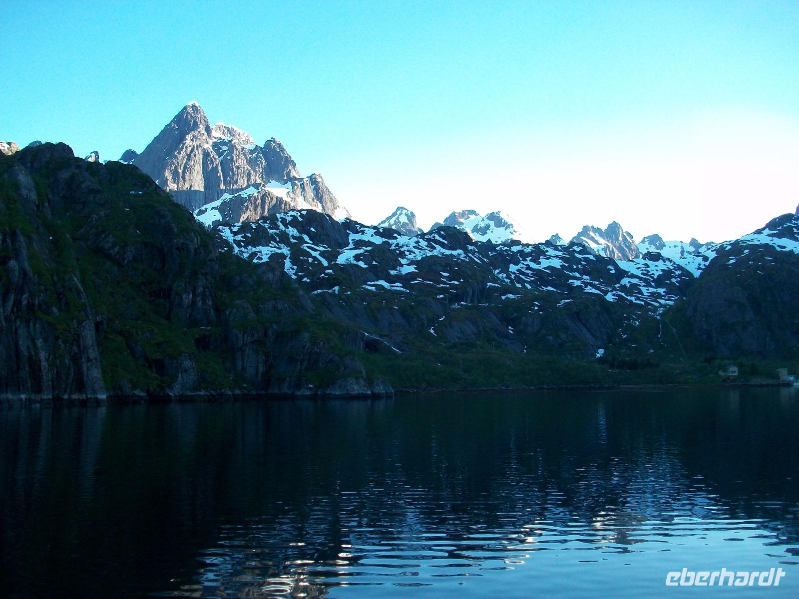 Nun geht es zurück; auf einer schmalen Küstenstraße wird es noch einmal so richtig romantisch; die Berge fallen steil zum Wasser ab und vermitteln uns einen grandiosen Eindruck den es nur hier auf den Lofoten gibt.