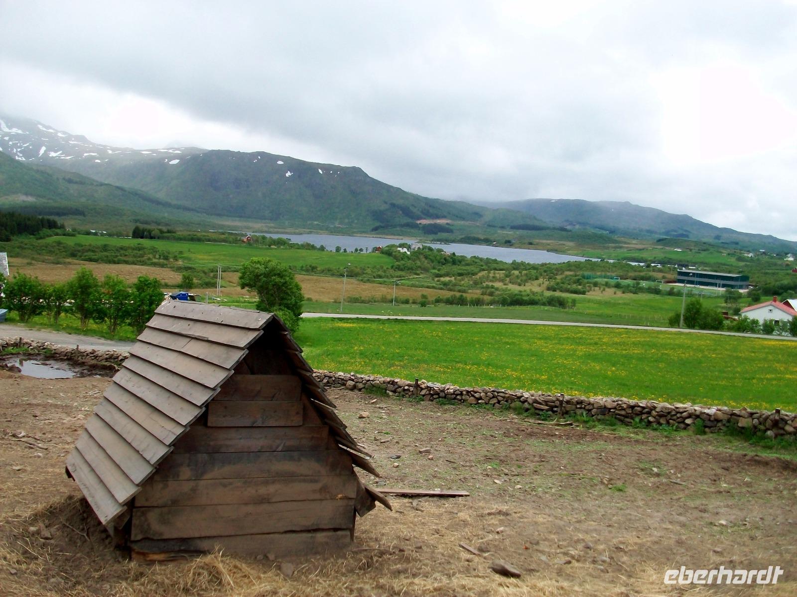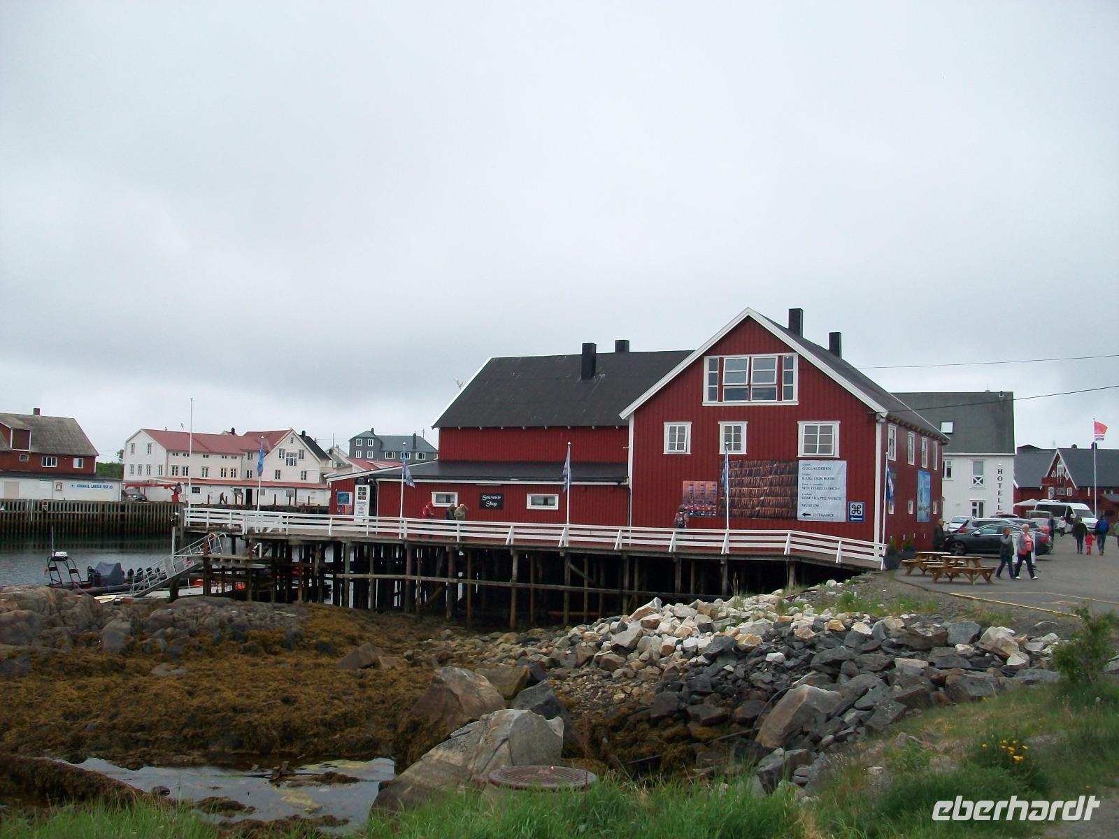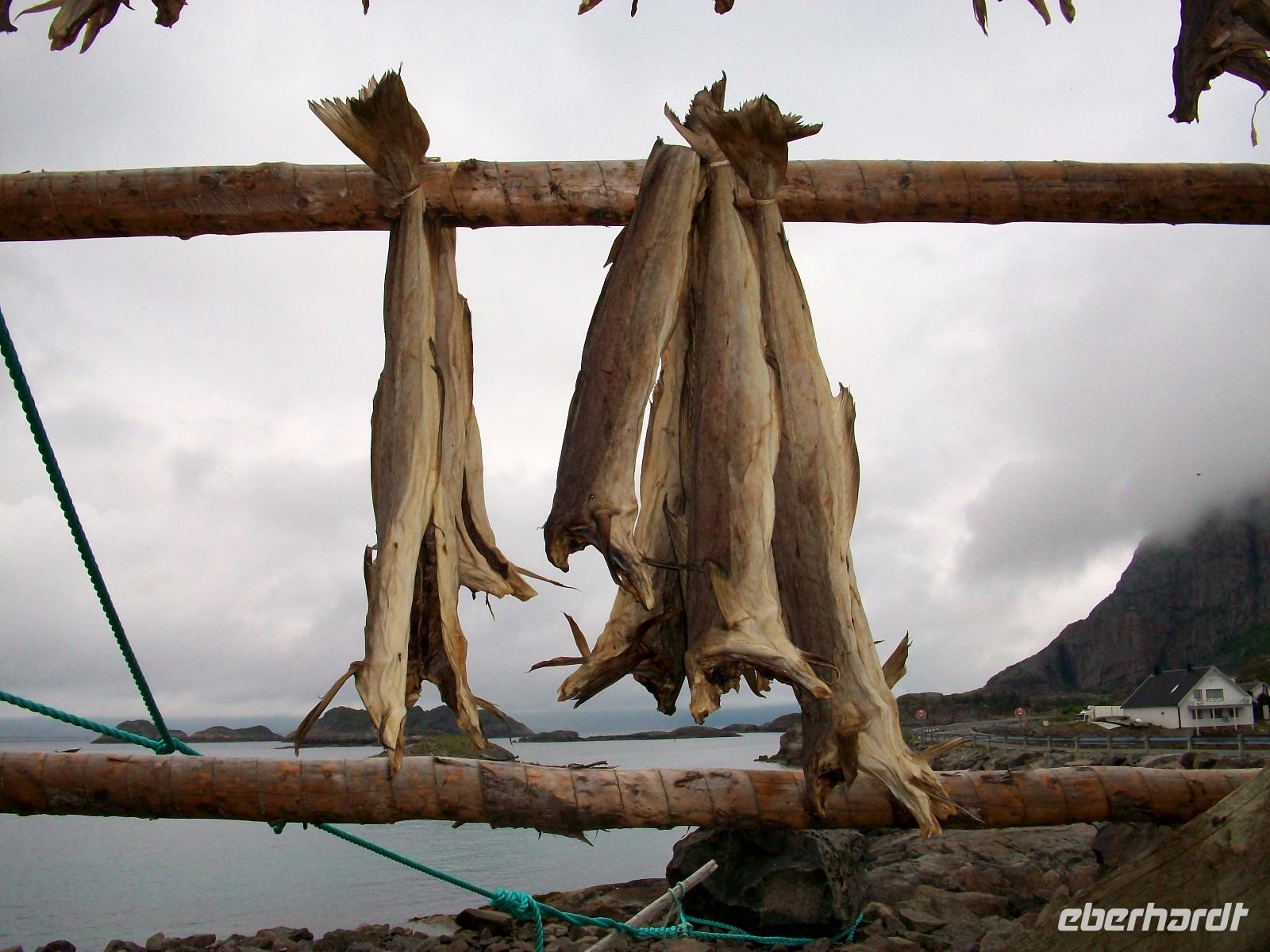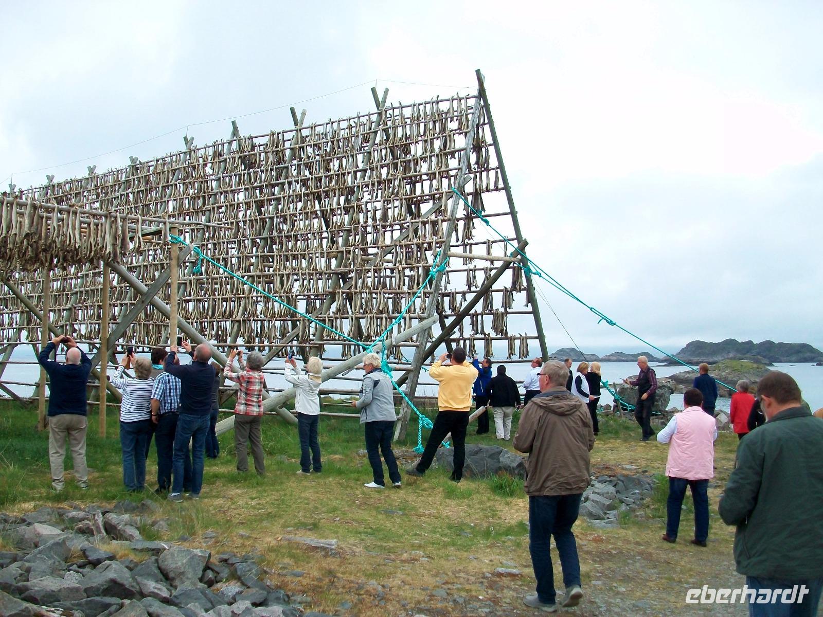 14.6.2017. Leider hat uns Petrus heute kein schönes Wetter geschickt. Als wir starten hängen dicke Wolken an den Bergen und es tröpfelt leicht. Das hindert uns aber nicht den schönen Archipel der Lofoten heute mit dem Bus zu erkunden; gar nicht weit und wir gelangen nach Hennigsvær. Dieses uralte Fischernest mit seinen reizvollen Häusern zeigt uns wie die Fischer hier auf den Lofoten leben. Auf Gestellen hängt der Kabeljau zum trocknen, auch heute noch eine wichtige Einnahmequelle der hier lebenden Menschen.