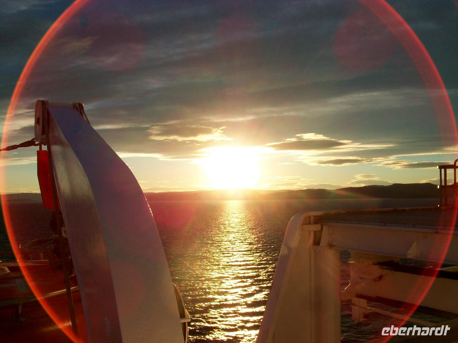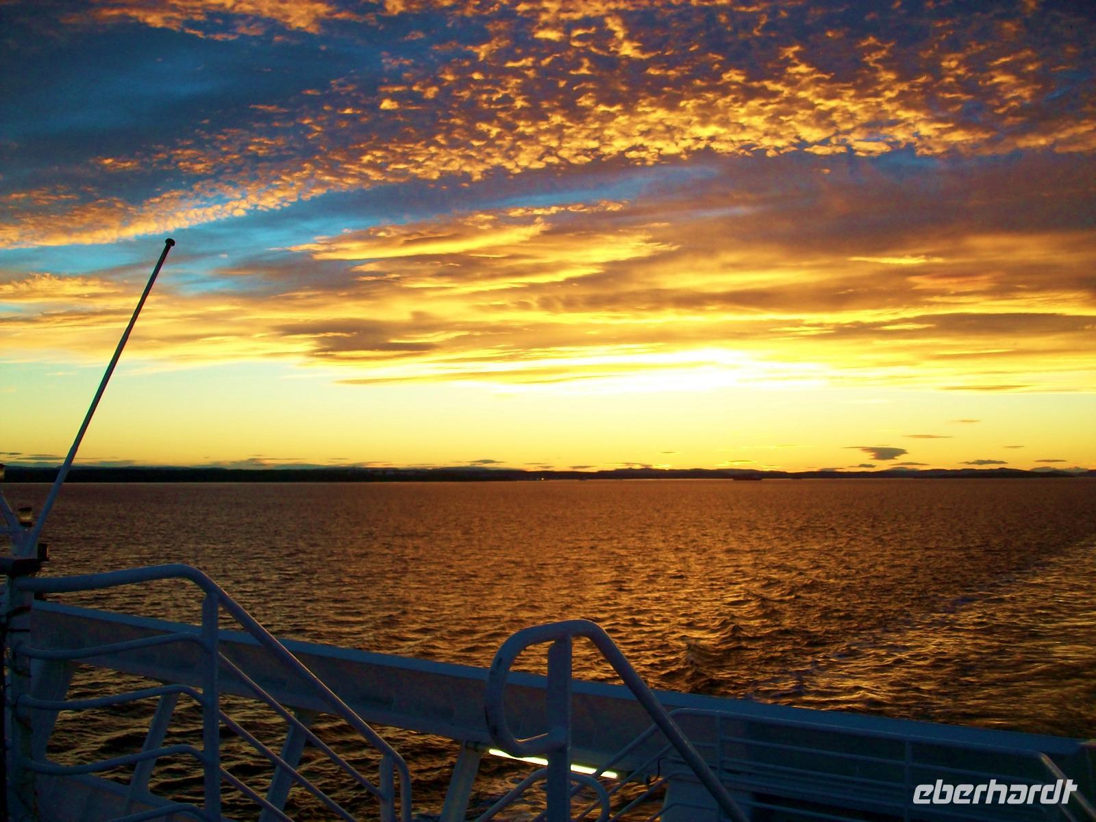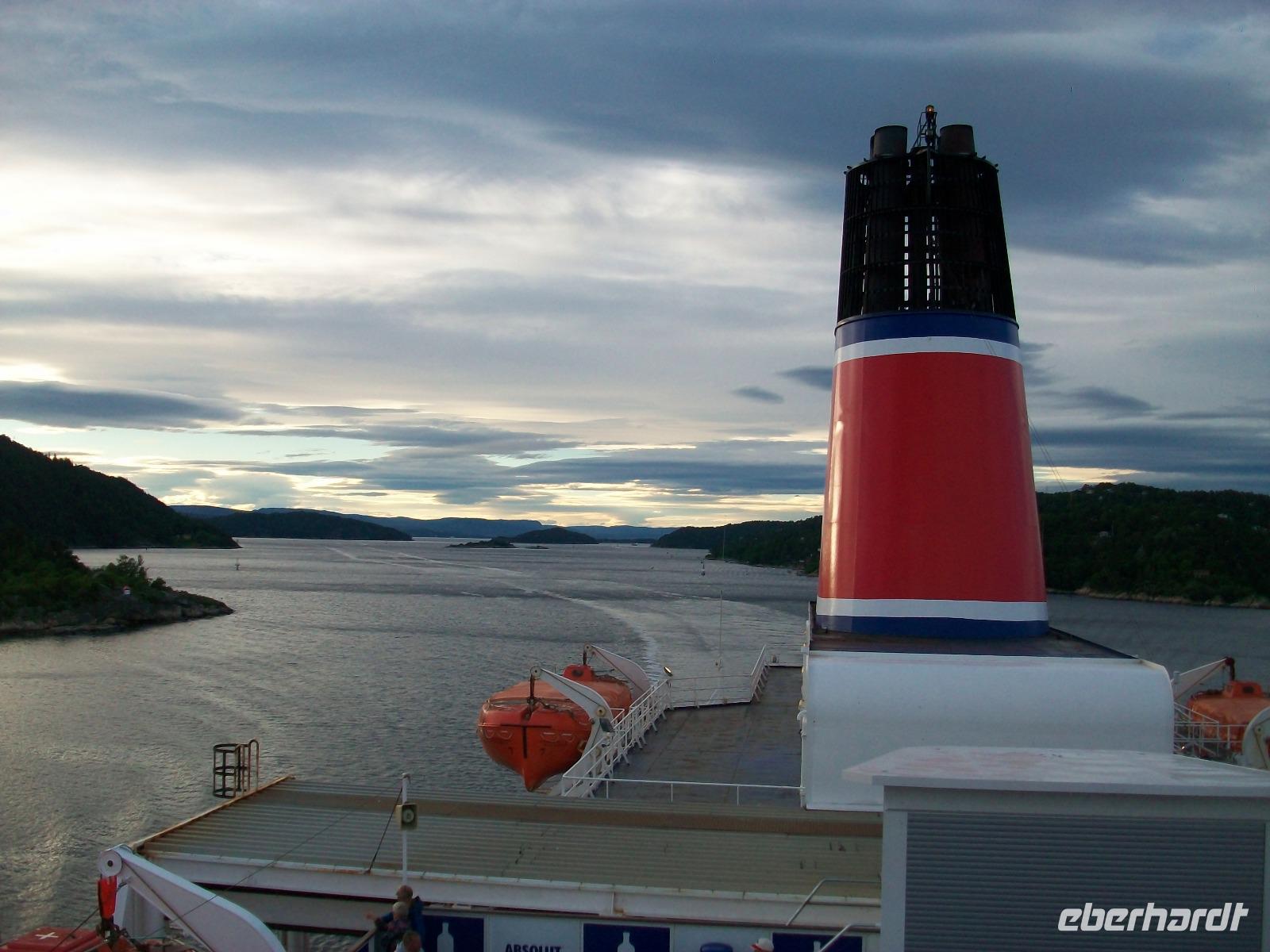 Als wir uns zum letzten gemeinsamen Abendessen im schönen Restaurant eingefunden haben legt das Schiff ab, wir durchfahren den Oslofjord mit seinen malerischen Inseln, von hier oben ein letzter schöner Blick auf Norwegen was in der Abenddämmerung langsam unseren Blicken entschwindet.