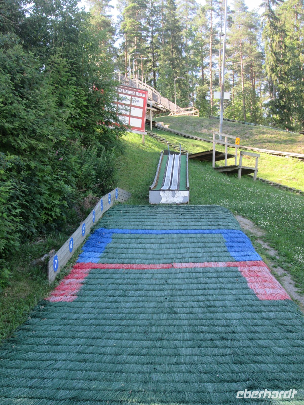 7 Schanzen, von klein bis groß, d.h. exakt von 7 Meter bis 130 Meter, prägen das Sportzentrum, zu dem ebenfalls ein Museum, die Langlauf- und die Eislaufarena gehören. Da sich unterhalb der großen Schanze im Auslauf im Sommer ein Schwimmbad befindet, war der Wunsch groß, bei 30 Grad Außentemperatur sich abzukühlen. Aber die Weiterfahrt war notwendig, denn bis Laukaa zu unserem Hotel waren es noch ca. 2 Stunden Fahrzeit.