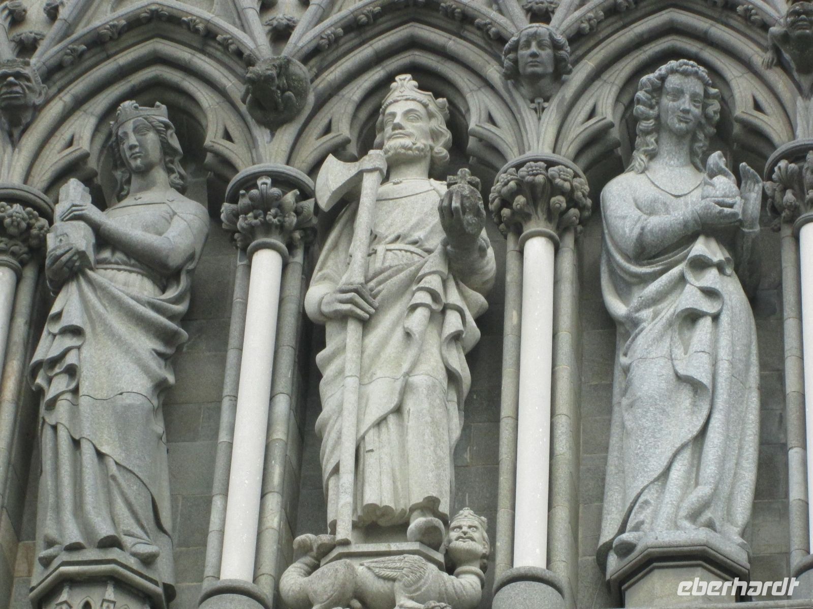 Die 3.größte Stadt Norwegens liegt am kleinen Fluss Nidelva und am Trondheimfjord, der sich insgesamt 130 Kilometer in das Landesinnere erstreckt. Bekannt für seine Sehenswürdigkeiten, seine zahlreiche Feste und den Hafen, der Anlegeplatz der Hurtigrute und anderer Kreuzfahrtschiffe ist, zieht die Stadt viele Besucher an. Auch wir verschafften uns einen Überblick und besuchten die wohl bekannteste Sehenswürdigkeit, den Nidarosdom. Ende des 10. Jahrhunderts wird Olav Haraldsson in Südnorwegen geboren und geht auf Wikingerfahrten. Nach seiner Rückkehr wird er als König Olav I. zum König gewählt, aber einige Zeit später aus dem Land vertrieben. Nach seiner erneuten Rückkehr wird er jedoch am 29.07.1030 bei Stiklestad von seinen Feinden ermordet. Da sich schon kurze Zeit nach seinem Tod Wunder ereignet haben sollen, wird sein Leichnam in eine eigens erbaute kleine Holzkirche nach Nidaros gebracht. Dies war die frühere Bezeichnung von Trondheim. Aus dieser kleinen Kapelle entstand in fast 7 Jahrhunderten (Um-und Weiterbauten sowie Brände waren die Ursachen für diese lange Bauzeit) eines der größten Gotteshäuser Nordeuropas. Der Nidarosdom war im Mittelalter eines der wichtigsten Pilgerziele, und heute ist er das norwegische Nationalheiligtum und die Königssegnungkathedrale.