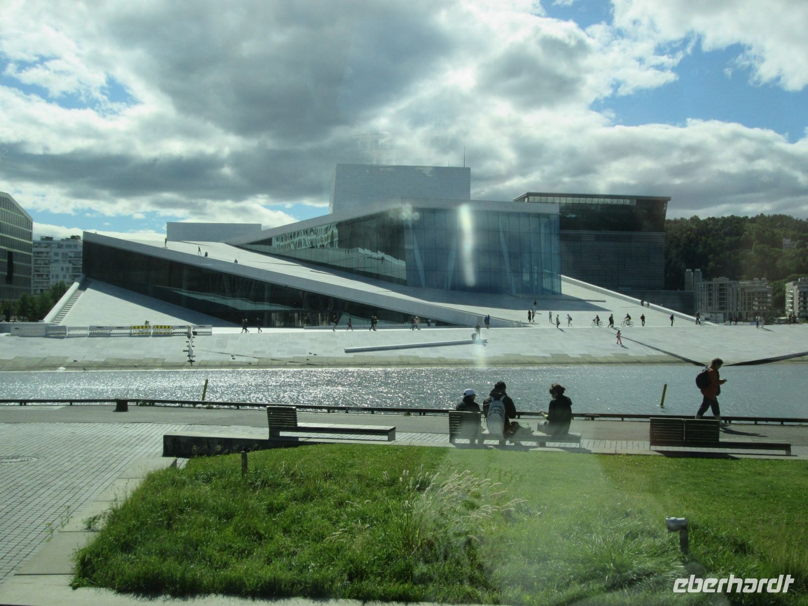 Auch an der Oper ging es für uns vorbei. Ein Spaziergang auf dem Dach der Oper ist bei längerem Aufenthalt in der Stadt durchaus ein Muss, hat man doch von ihm einen schönen Blick. Seit 2008 verschönert die aus weißen Carrara-Marmor und norwegischem Granit bestehende Oper den Osloer Hafen.