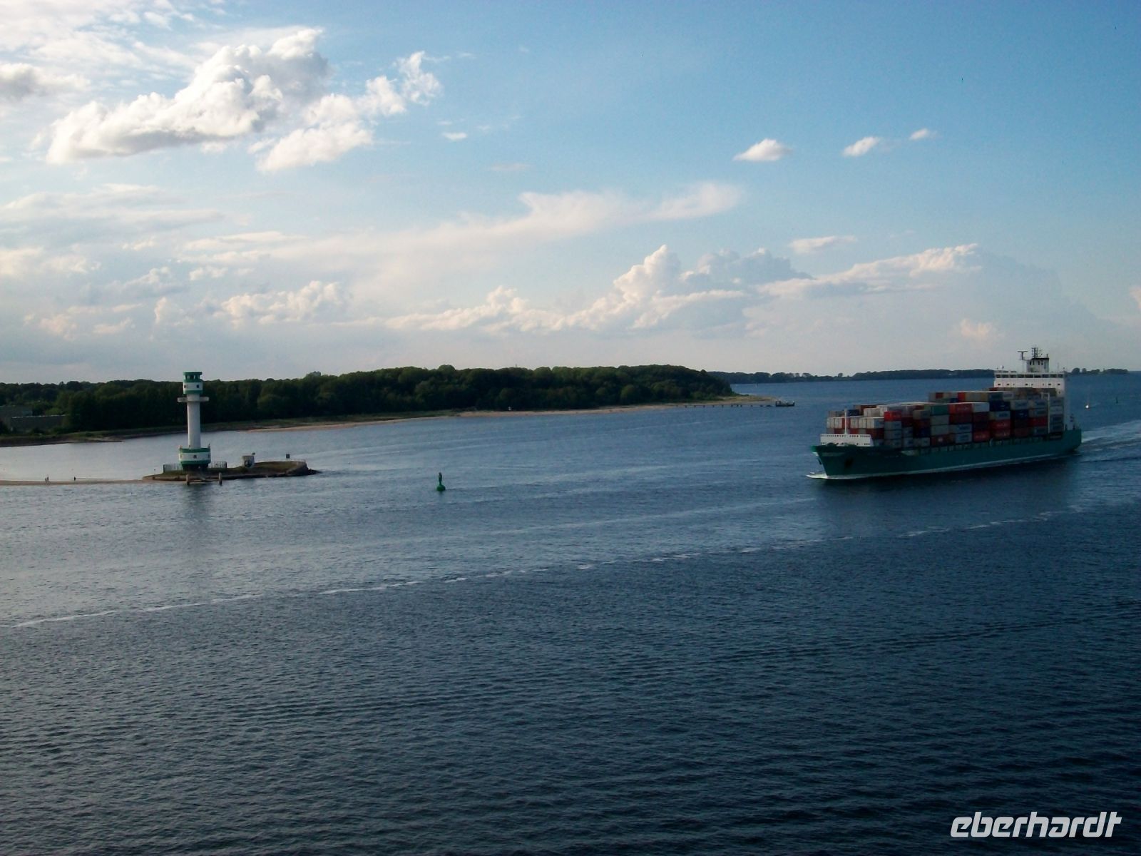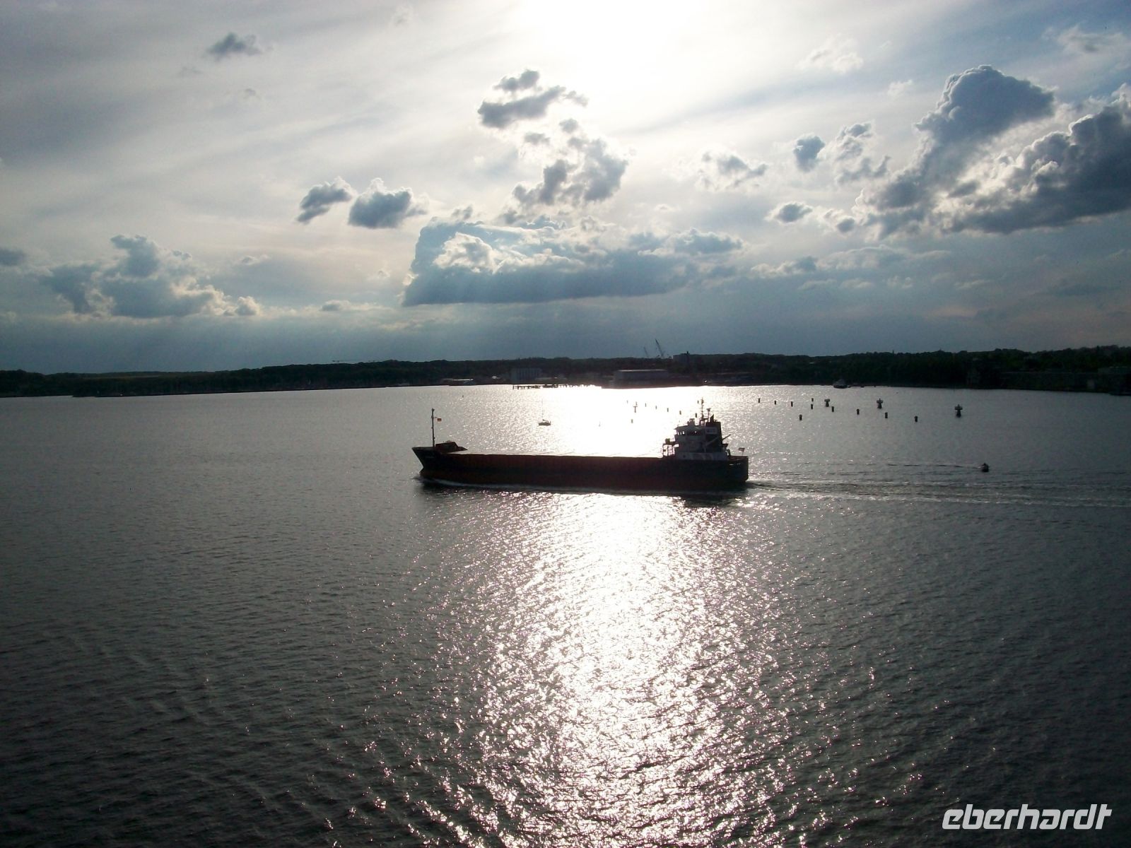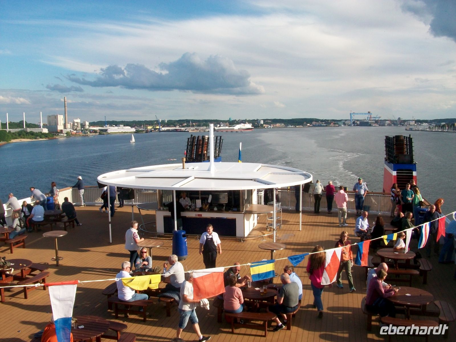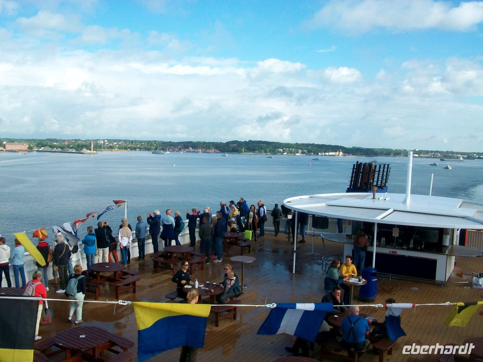 Der Nachmittag gehört Kiel; bei einem Bummel erkunden wir diese interessante Stadt, aber gegen fünf hat sich unserer Gruppe wieder versammelt um an Bord der Fähre zu gehen. Eine lange Gangway bringt uns hinauf und schon eine Stunde später dürfen wir uns am reichhaltigen Buffet laben. Unterdessen legt das Schiff ab; die Stadtsilhouette Kiels entschwindet unseren Augen und bald sind wir auf dem offenem Meer angelangt. Oben vom Deck kann der Blick bei angenehmen Temperaturen weit schweifen; ruhig und erholsam beschließen wir diesen ersten Tag unserer Reise.