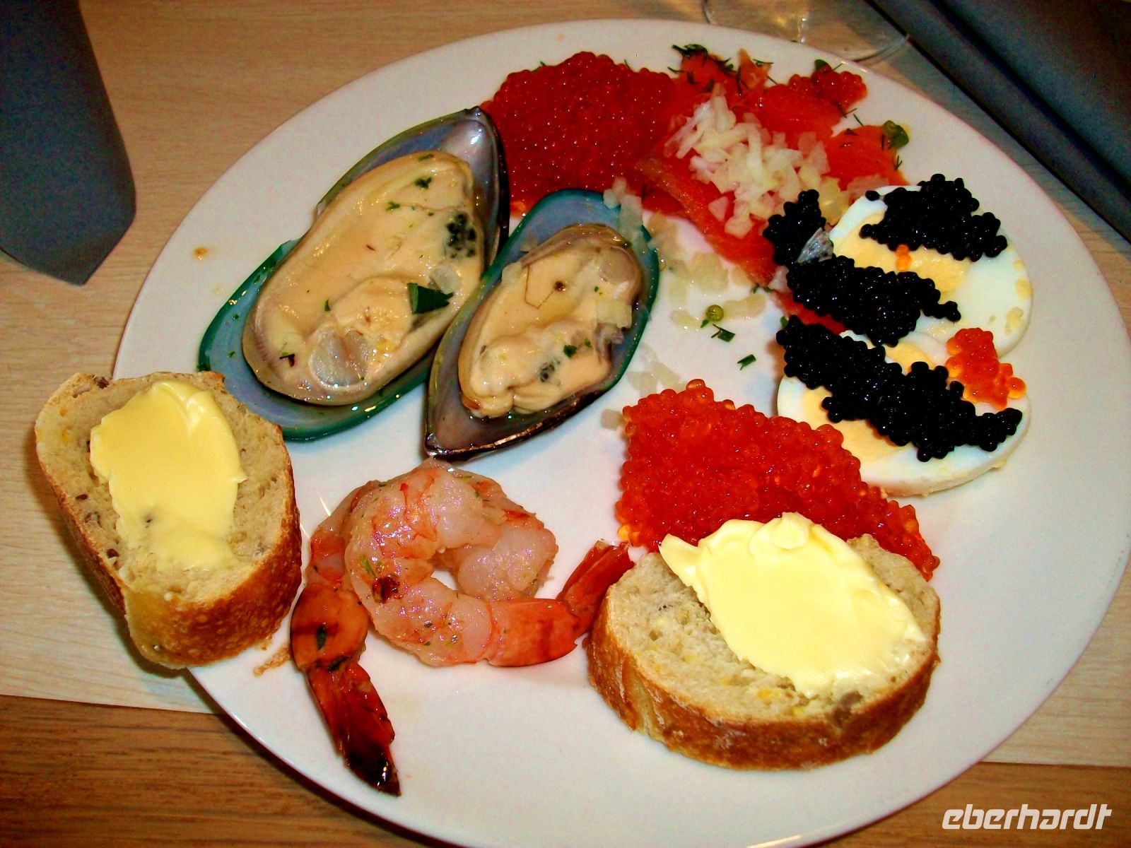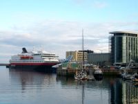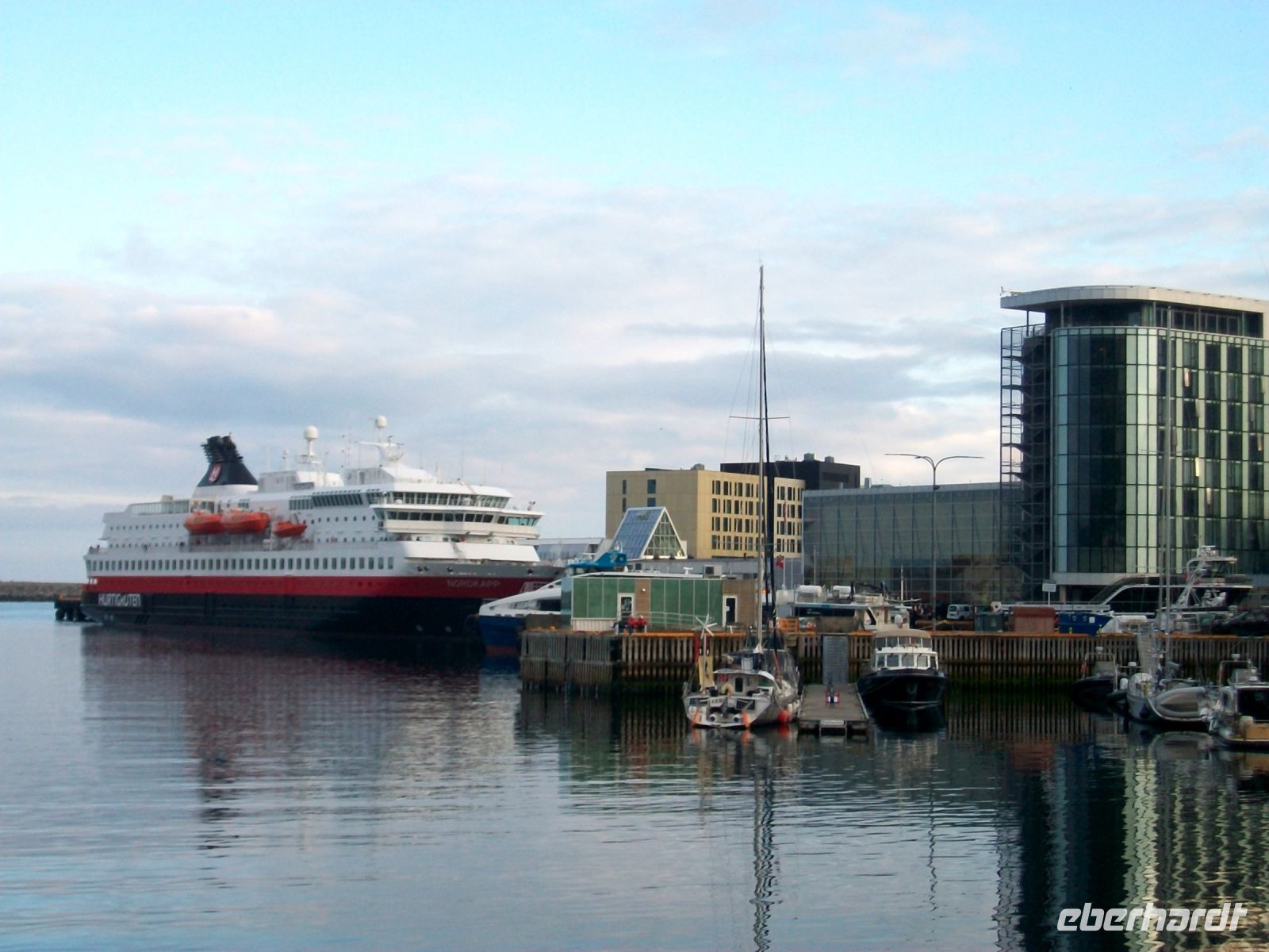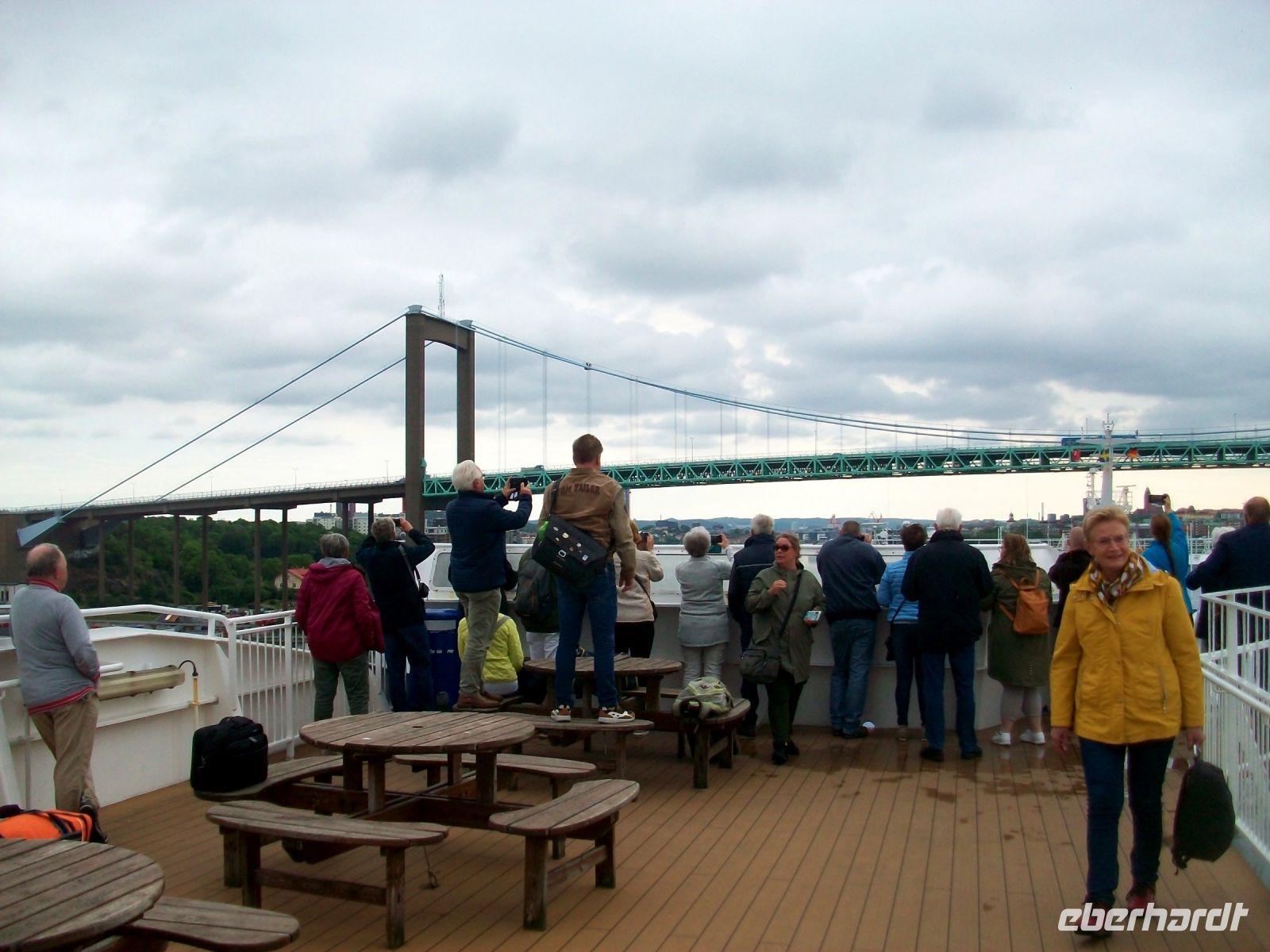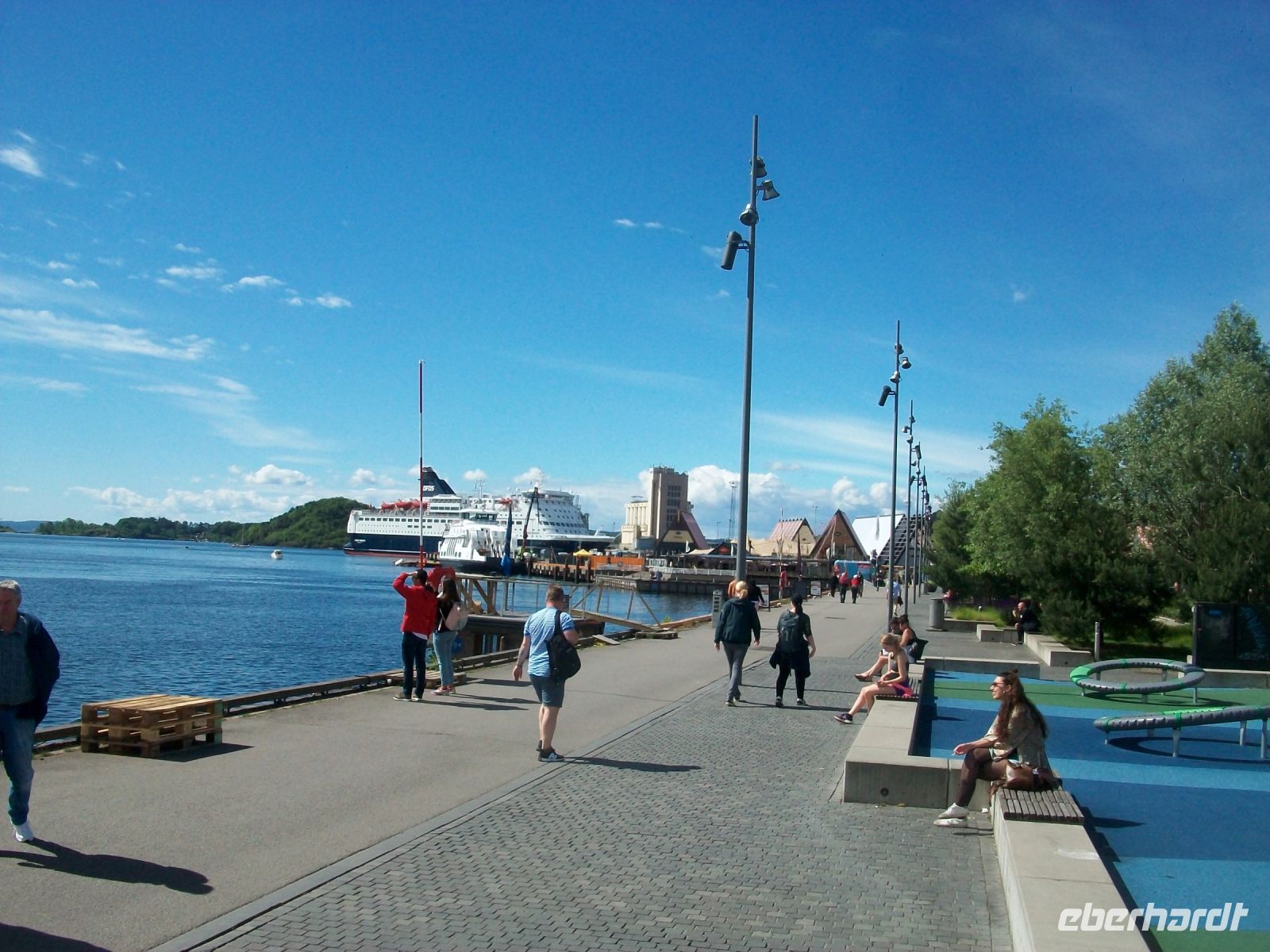 Der Nachmittag gehört Kiel; bei einem Bummel erkunden wir diese interessante Stadt, aber gegen fünf hat sich unserer Gruppe wieder versammelt um an Bord der Fähre zu gehen. Eine lange Gangway bringt uns hinauf und schon eine Stunde später dürfen wir uns am reichhaltigen Buffet laben. Unterdessen legt das Schiff ab; die Stadtsilhouette Kiels entschwindet unseren Augen und bald sind wir auf dem offenem Meer angelangt. Oben vom Deck kann der Blick bei angenehmen Temperaturen weit schweifen; ruhig und erholsam beschließen wir diesen ersten Tag unserer Reise.