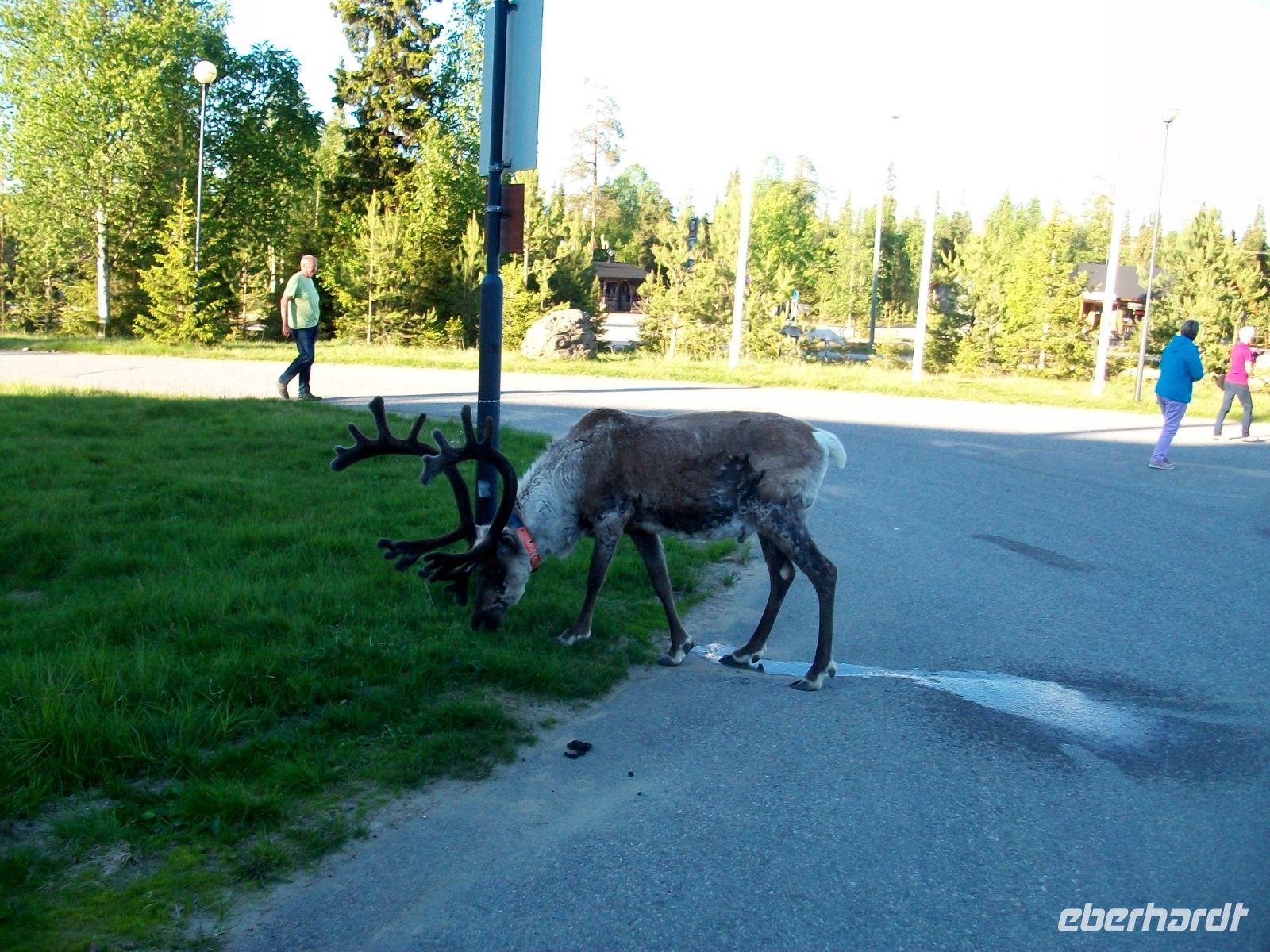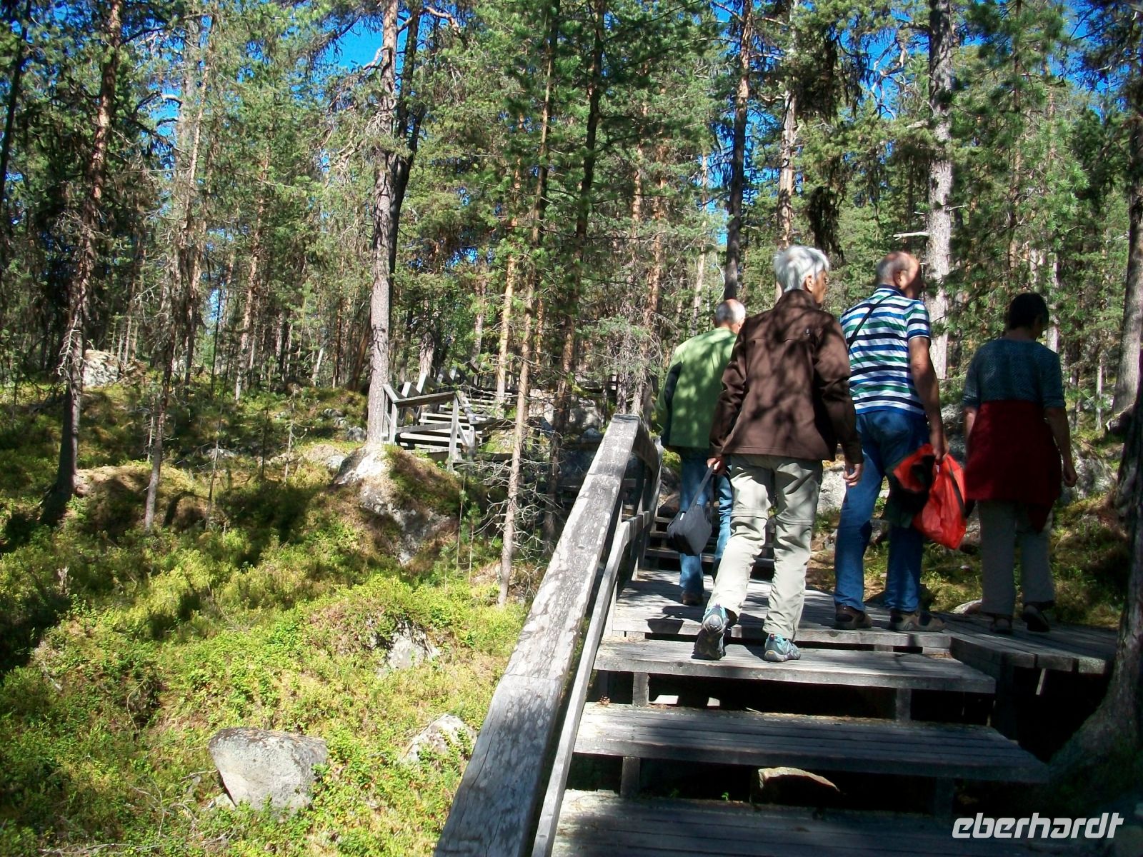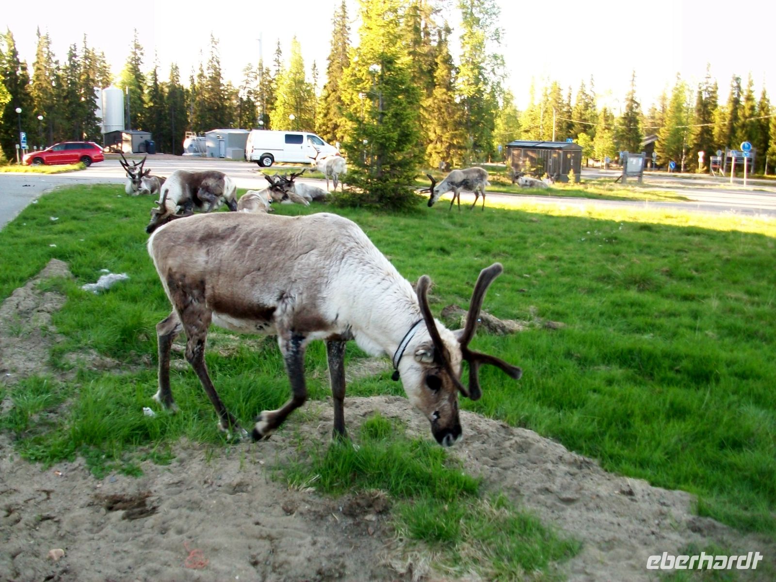 Doch nun müssen wir uns aufmachen, uns steht noch ein Stück Weg bevor. Aber auch das schaffen wir und bei strahlendem Sonnenschein gelangen wir in den Luosto - Nationalpark und zu unserem Hotel inmitten von Natur. Weit und breit ist nichts von Zivilisation zu sehen nur Mücken und nach dem Abendessen eine Herde Rentiere welche uns besuchen kommt.