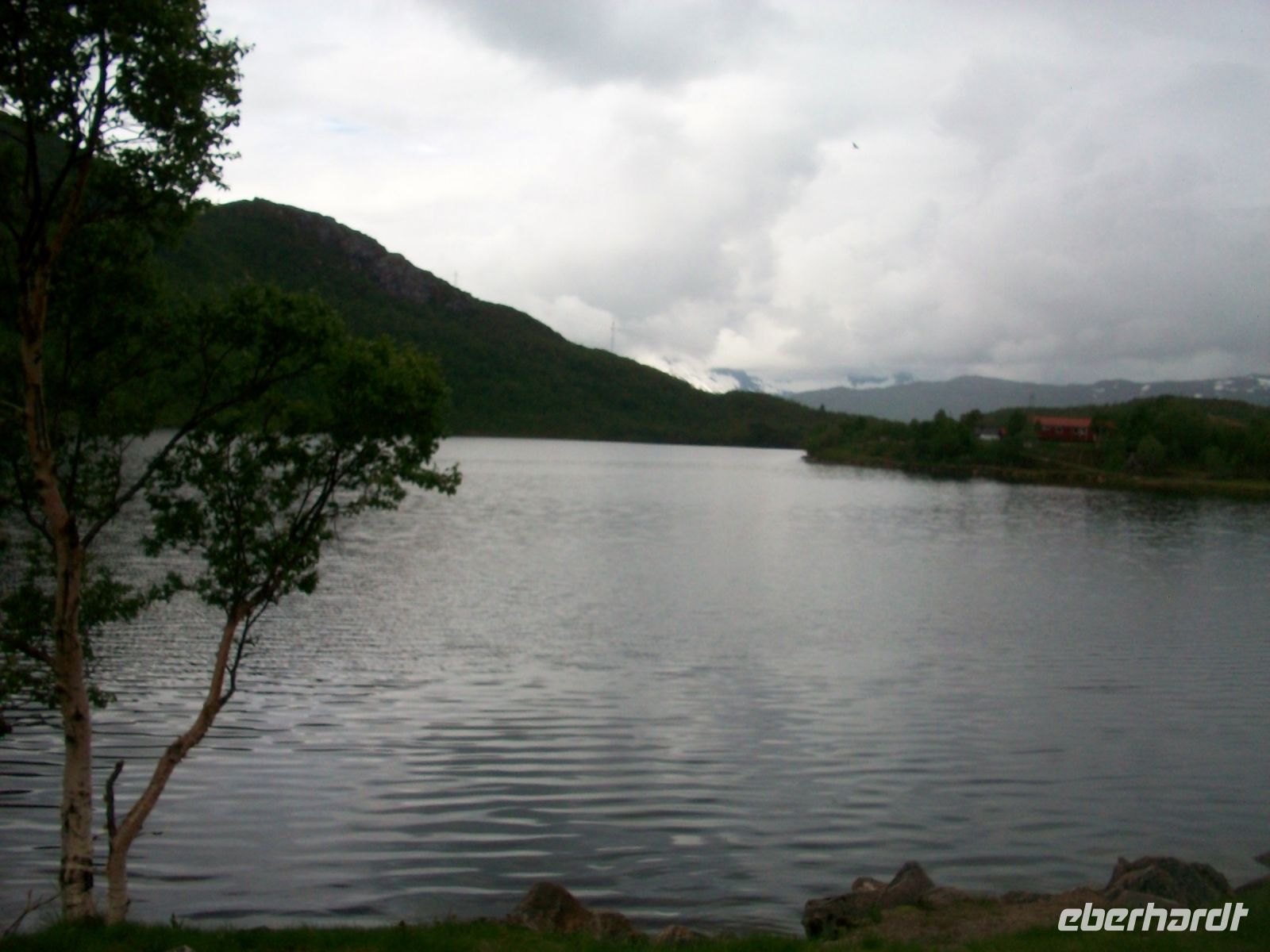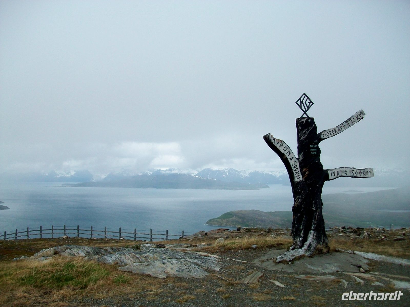 Bleigraue Wolken hängen regenschwer an den Bergen die Honningsvåg umgeben, sie begleiten unseren Aufbruch. Aber als wir, nun in südlicher Richtung, unterwegs sind bessert sich das Wetter. Wir legen eine Mittagspause in Alta ein und sind fortan an der Küste unterwegs. Am Nachmittag weichen wir kurz vom Weg ab um oben auf dem Hügel von Gildetun einen besonderen Ausblick zu genießen. Aber eine Wolke hängt davor und taucht alles in einen feuchten Nebel. Kurz reißt er aber auf und gibt für wenige Augenblicke den Blick zum Meer und den schneebedeckte Bergen frei.