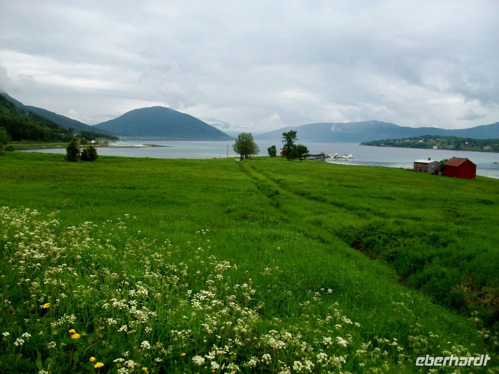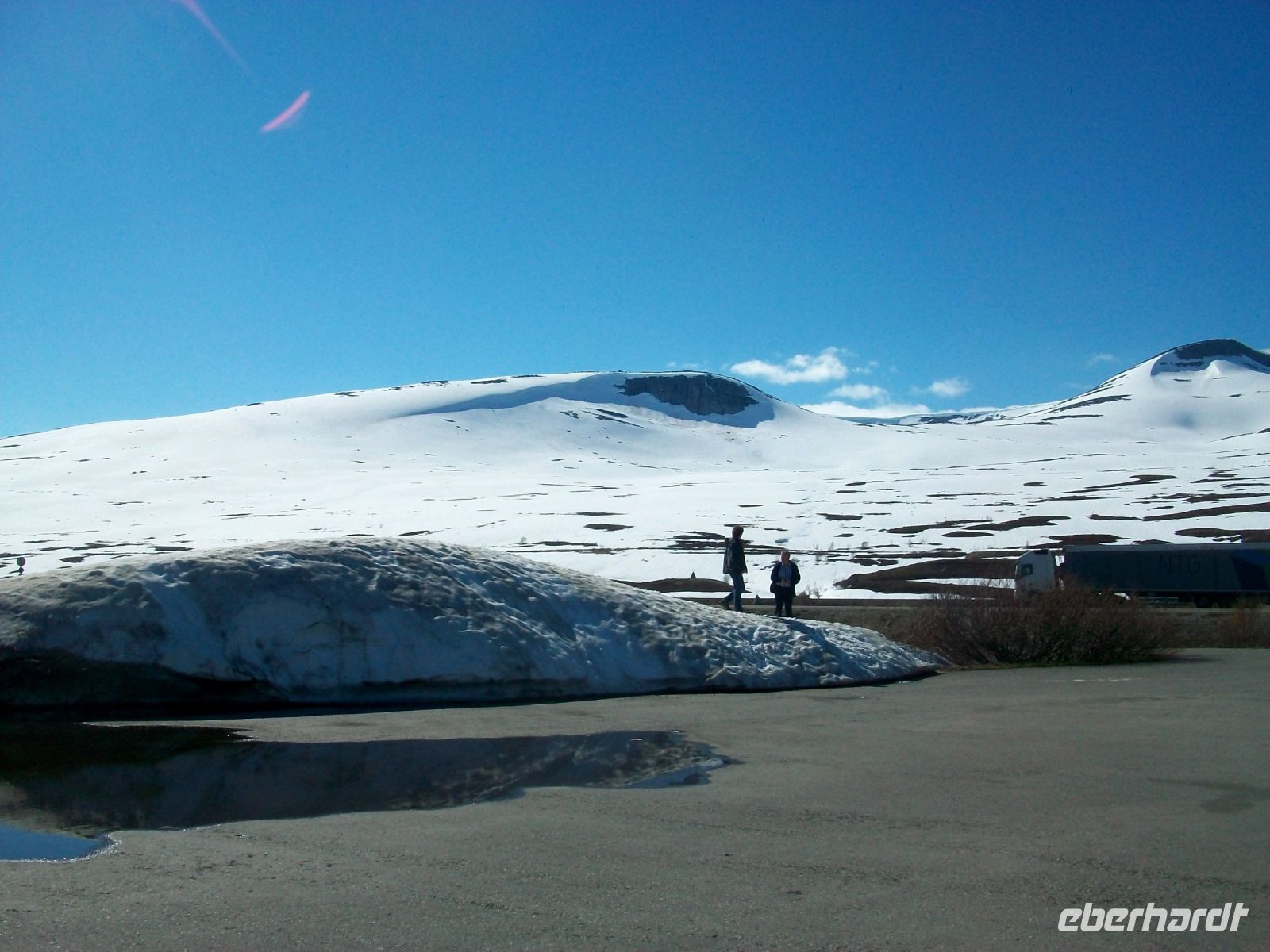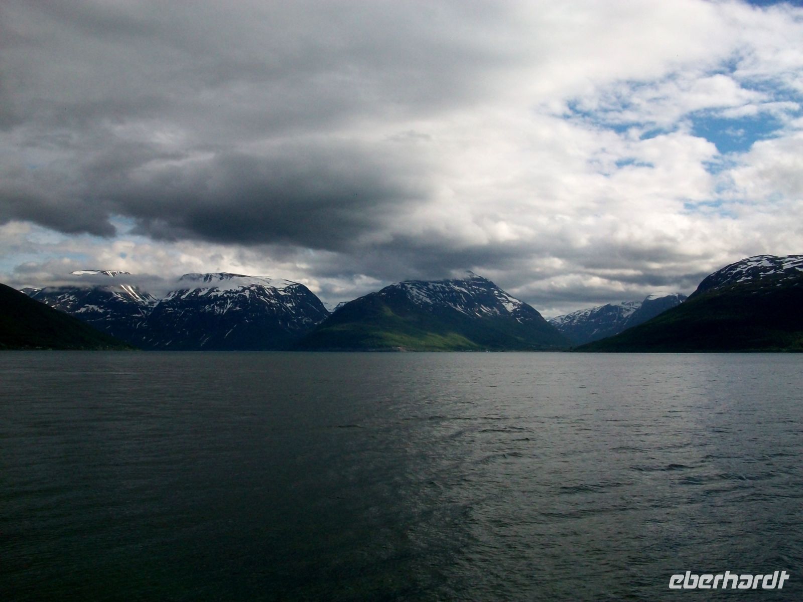 16.6.2022. Nach den etwas ruhigeren Tagen stehen heute nun wieder einige Kilometer mehr auf dem Programm, allerdings durch eine sehenswerte Natur; es wird also nicht langweilig werden. Zunächst erwartet uns eine einstündige Fährüberfahrt. Entspannt erreichen wir dann auch wieder das Festland um fortan, weiter entlang der norwegischen Küste, unseren Kurs nach Süden wieder aufzunehmen. Allerdings führt uns der Weg auch wieder über die Fjelle, schnell ändert sich hierbei die Vegetation, üppiger Baumbewuchs wechselt sich mit Tundra ab, umrahmt von weißen Schneefetzen die in der Sonne glitzern. Solche Wechselspiele gibt es nur im Norden Europas und sie faszinieren das Auge des Betrachters immer wieder.