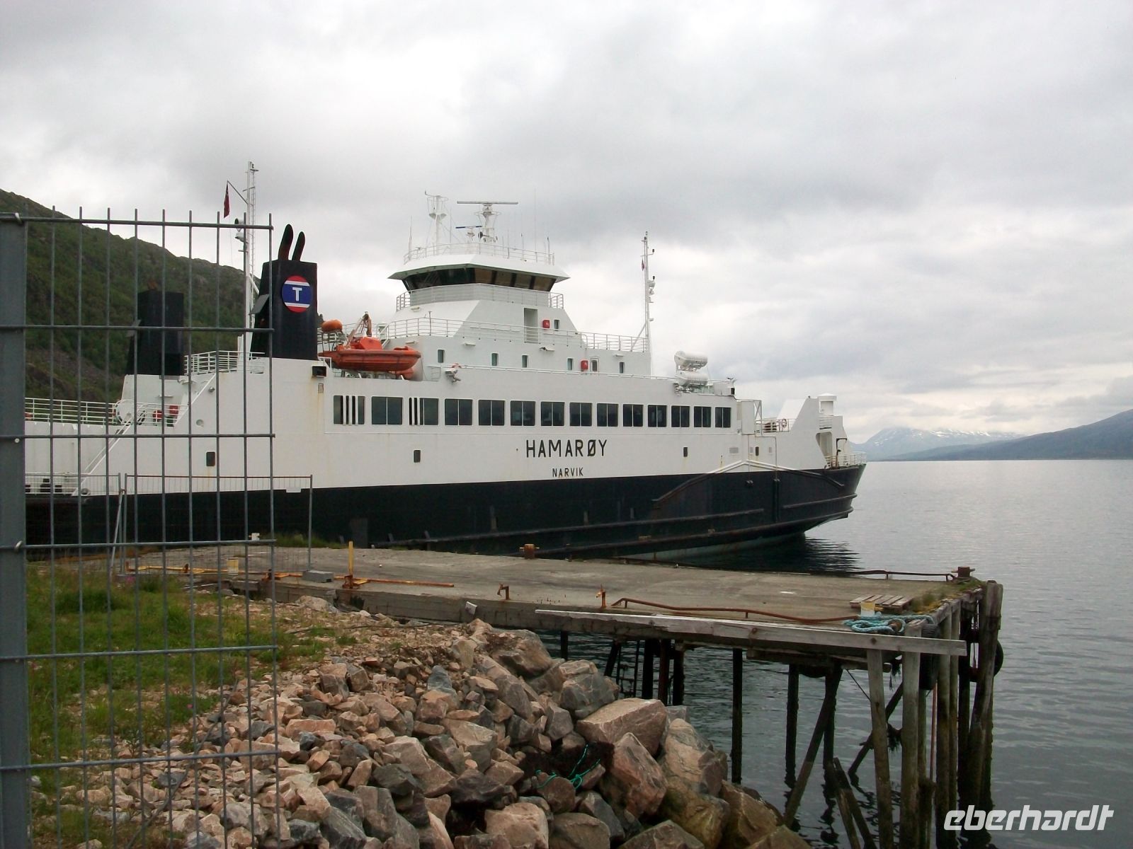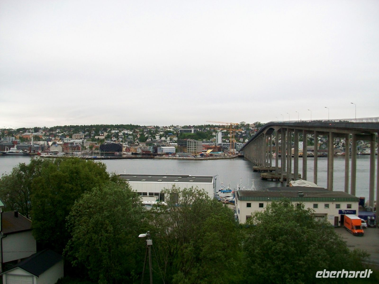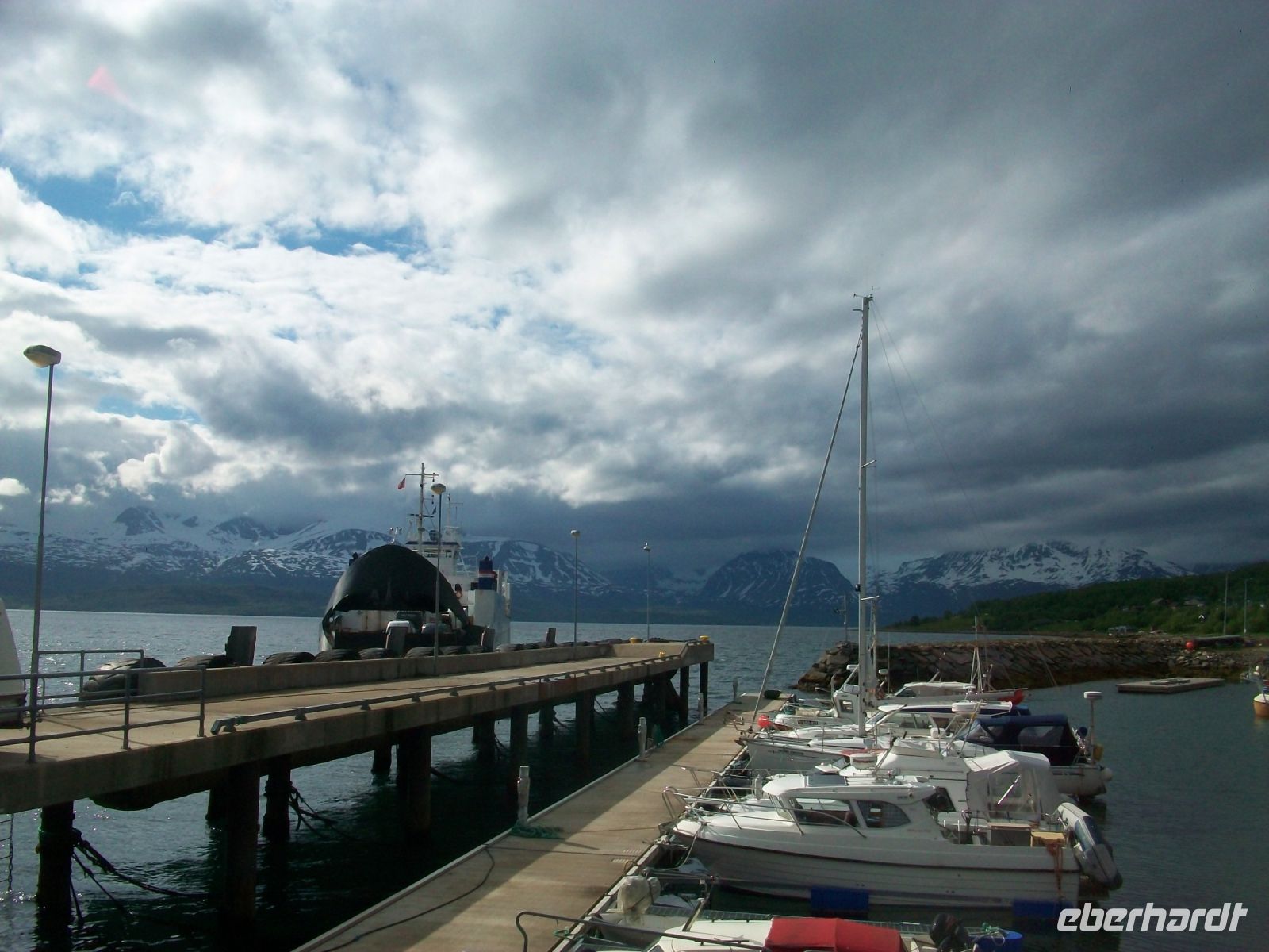 Nun müssen wir noch ein ganzes Stück rollen um zum Fährhafen nach Olderdalen zu gelangen. Pünktlich langen wir an und bei Sonnenschein genießen wir die pittoreske Überfahrt mit interessanten Kontrasten: Grüne Bergflanken, schneebedeckte Spitzen und über allem ist ein blauer Himmel gespannt. Leicht schaukelnd nimmt das Schiff seine Bahn, nach einem kurzen Stück, dann eine weitere Überfahrt und gegen halb acht haben wir den Ort Tromsø erreicht. Die Sonne steht noch hoch oben am Himmel, sie wir zu dieser Zeit hier des nachts auch nicht untergehen…