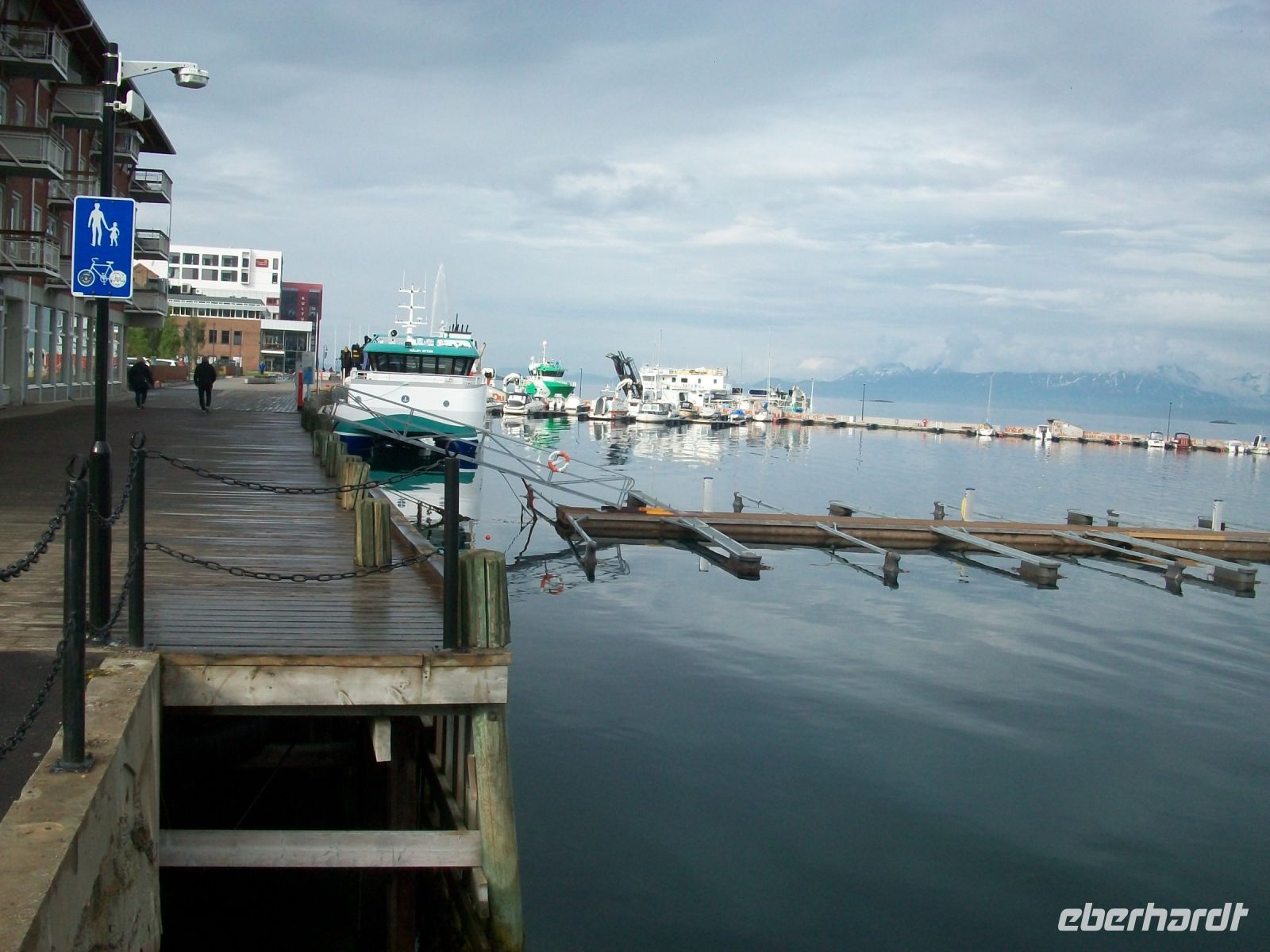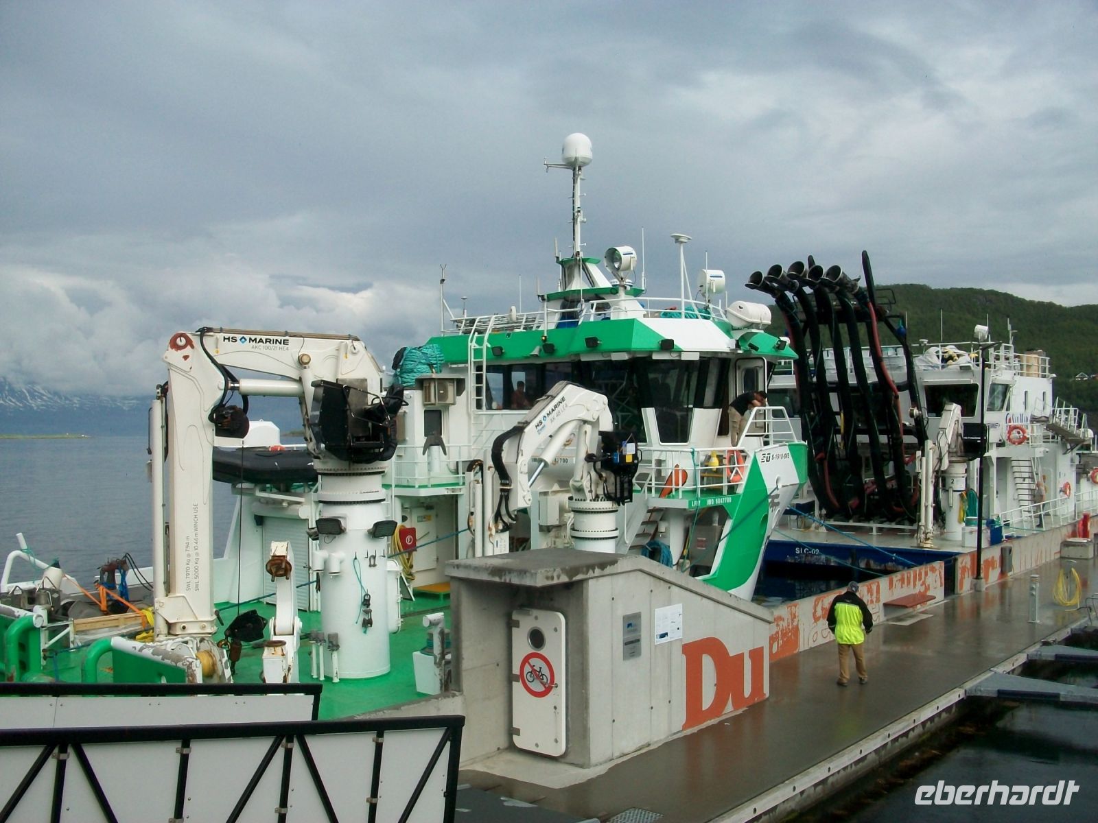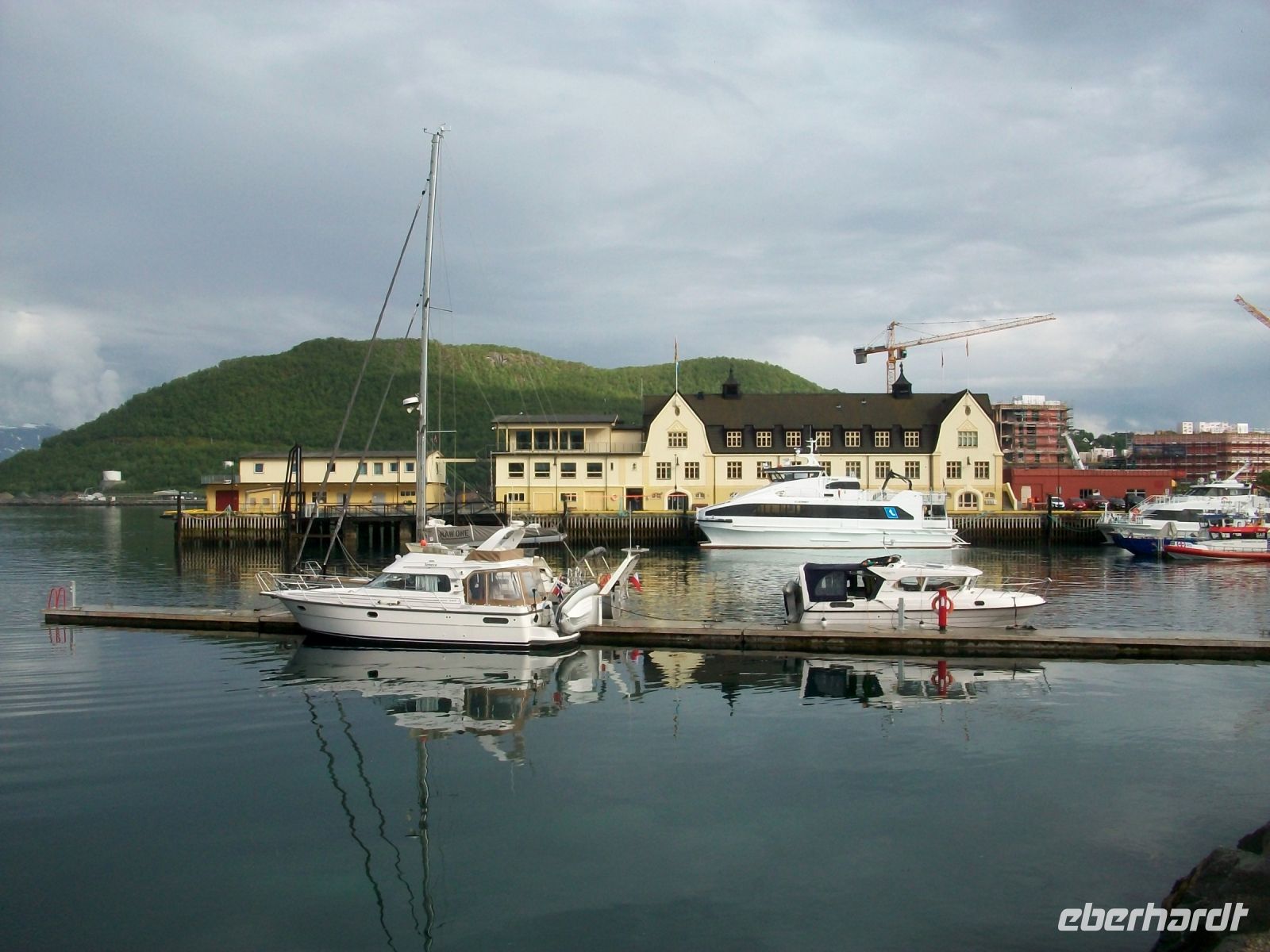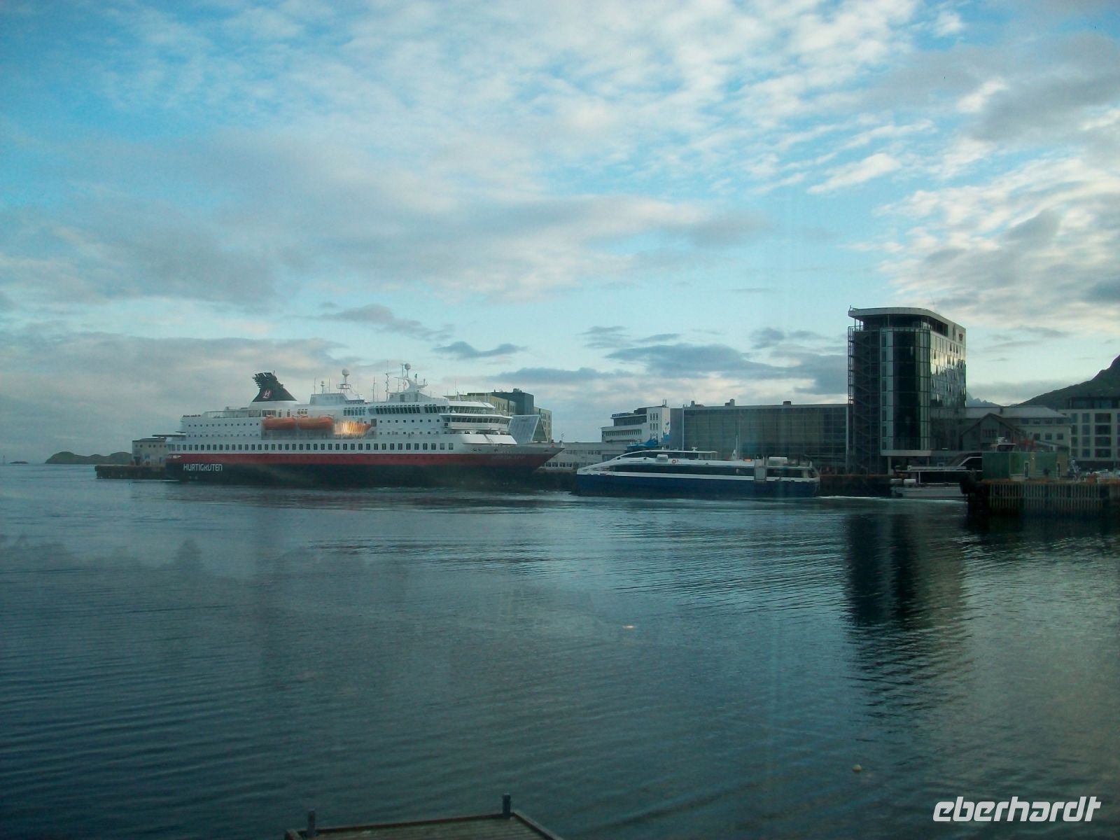 Nun müssen wir noch ein ganzes Stück rollen um zum Fährhafen nach Olderdalen zu gelangen. Pünktlich langen wir an und bei Sonnenschein genießen wir die pittoreske Überfahrt mit interessanten Kontrasten: Grüne Bergflanken, schneebedeckte Spitzen und über allem ist ein blauer Himmel gespannt. Leicht schaukelnd nimmt das Schiff seine Bahn, nach einem kurzen Stück, dann eine weitere Überfahrt und gegen halb acht haben wir den Ort Tromsø erreicht. Die Sonne steht noch hoch oben am Himmel, sie wir zu dieser Zeit hier des nachts auch nicht untergehen…