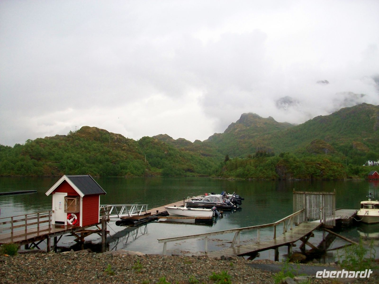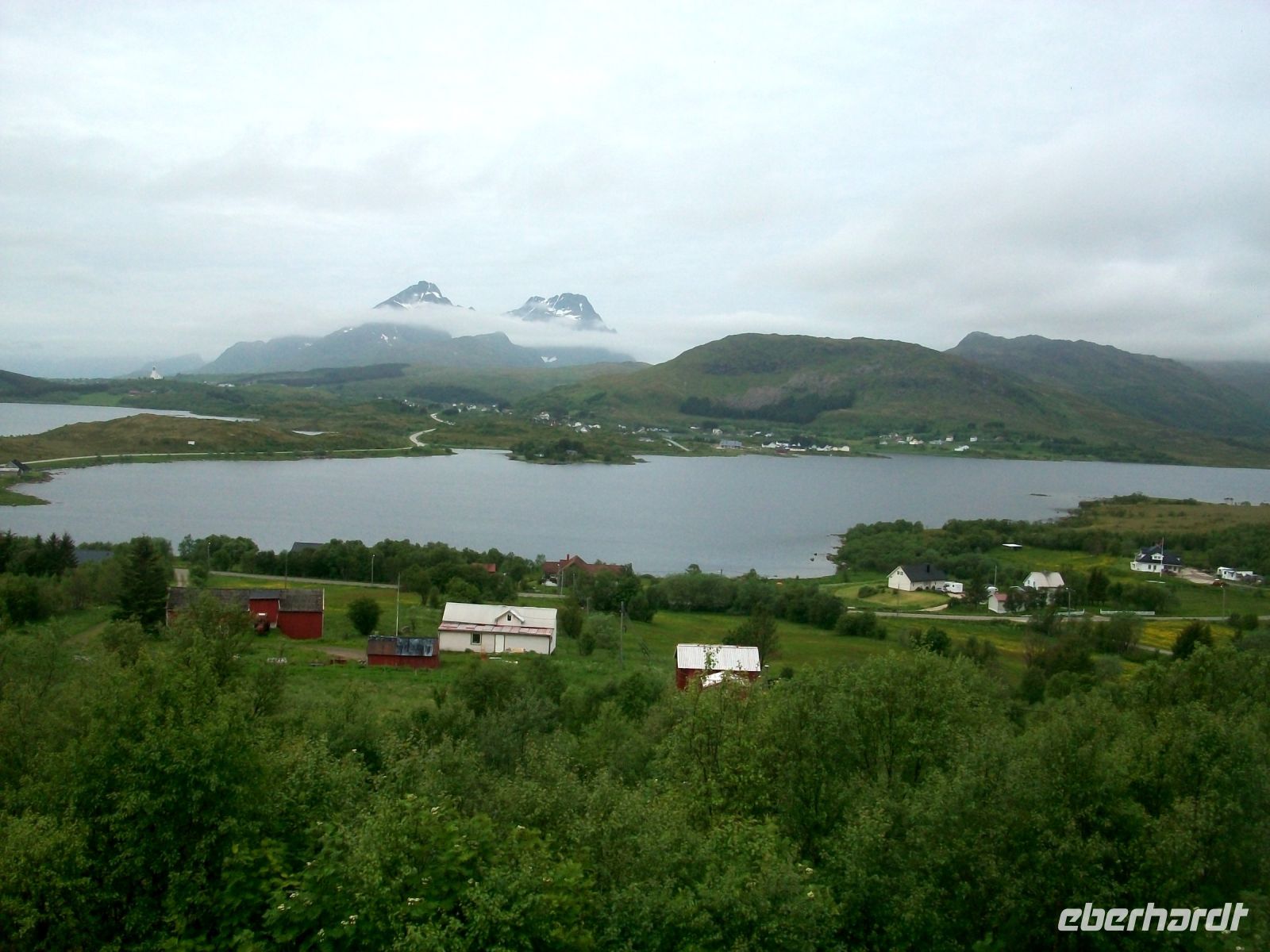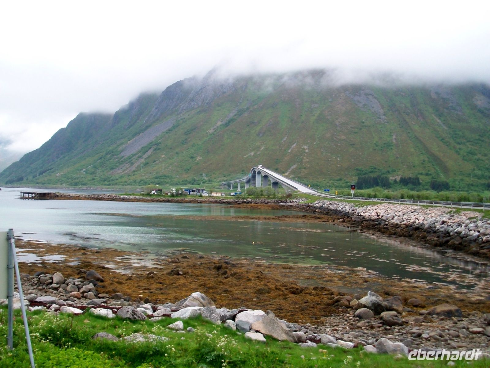 15.6.2022. Den heutigen Tag haben wir uns für die Lofoten reserviert. Hier gibt es viel zu entdecken! Leider sind zunächst die oberen Teile der Berge in Wolken gehüllt, doch unten ist die Sicht frei. Die Lofoten sind für ihren Stockfischhandel bekannt; an zahlreichen Gestellen hängt der Kabeljau zum Trocknen, ein solches Gestell schauen wir uns an bevor wir in das reizvolle kleine Fischerdorf Henningsvær gelangen. An diesem Vormittag ist alles noch ruhig und somit genießen wir hier eine schöne Zeit. Dann geht es weiter; wir gelangen über eine spektakuläre Brücke zu weiteren Inseln des Archipels und oberhalb des Ortes Borg genießen wir einen wunderbaren Ausblick auf das Tal in welchem der Ort liegt.