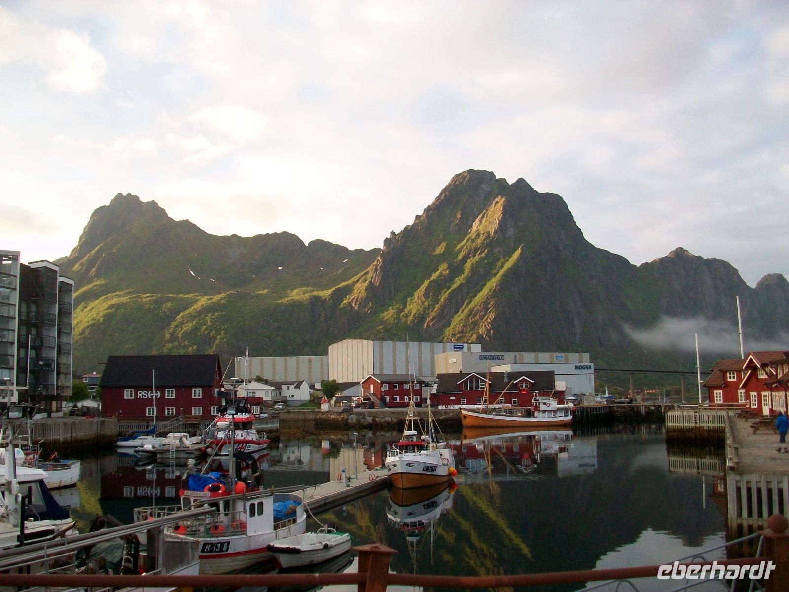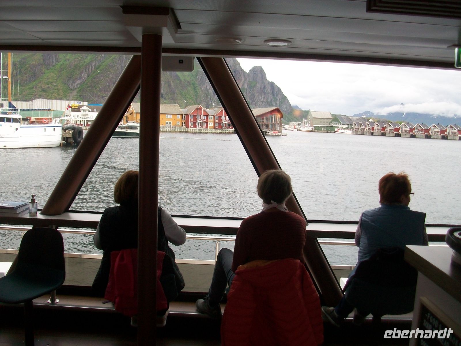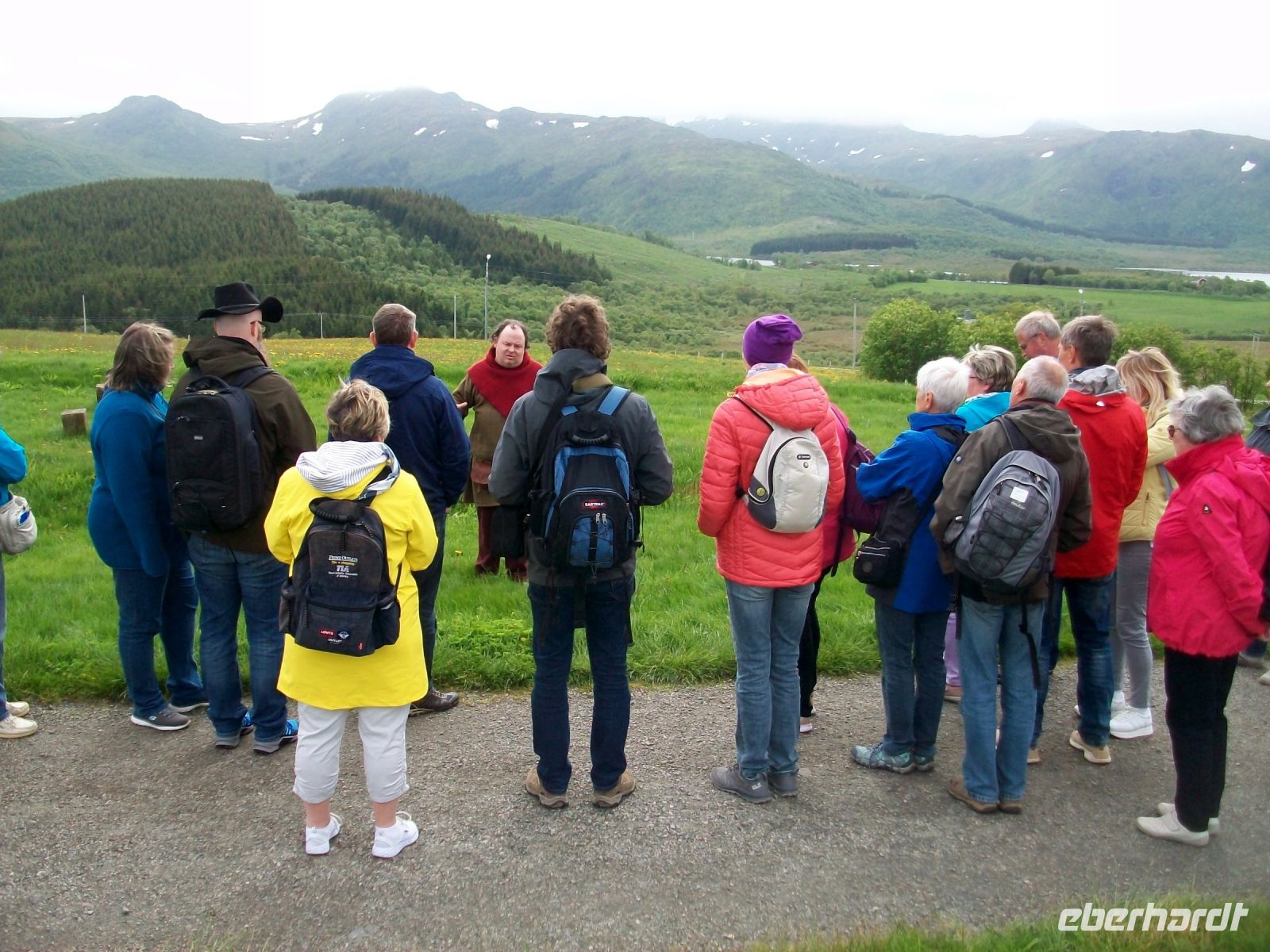 14.6.2022. Heute haben wir ein recht entspanntes Programm; somit können wir es uns leisten etwas später loszufahren als an den vorherigen Tagen. Am Vormittag verbleibt noch etwas Zeit für einen Bummel in Harstad, dann machen wir uns auf um zur reizvollen Inselgruppe der Lofoten zu gelangen. Grün zeigt sich die Natur hier im Einflussbereich des Golfstromes; das Meer, kleinere Binnenseen und eine üppige Vegetation wechseln sich harmonisch ab. Am Nachmittag gelangen wir nach Svolvær, direkt am Meer gelegen, hier werden wir nun zwei Nächte verbringen. Doch zunächst machen wir uns auf zu einem besonderen Erlebnis. Gegenüber, im Hafen, wartet schon ein recht modernes Boot um uns die Trauminselwelt der Lofoten zu zeigen. Schnell gelangen wir auf das Meer hinaus; ein kühler Wind bläst uns an Deck entgegen, aber vom Salon aus können wir die schöne Natur durch große Fenster windgeschützt genießen. Karge, wenig begrünte Inseln zeigen sich uns hier; Seevögel, vor allem die immer hungrigen Möwen verfolgen unsere Bahn. Nach etwa einer Stunde schwenken wir in den berühmten Trollfjord ein – das ist ein besonderes Erlebnis. Steil steigen die Felswände an und, klein wie wir sind, fühlen wir uns etwas verloren inmitten dieser Riesenwelt. Später, schon bei unserer Rückfahrt, zeigen sich in der Ferne auch jene majestätischeren Vögel für welche der Archipel so bekannt ist: die Seeadler.