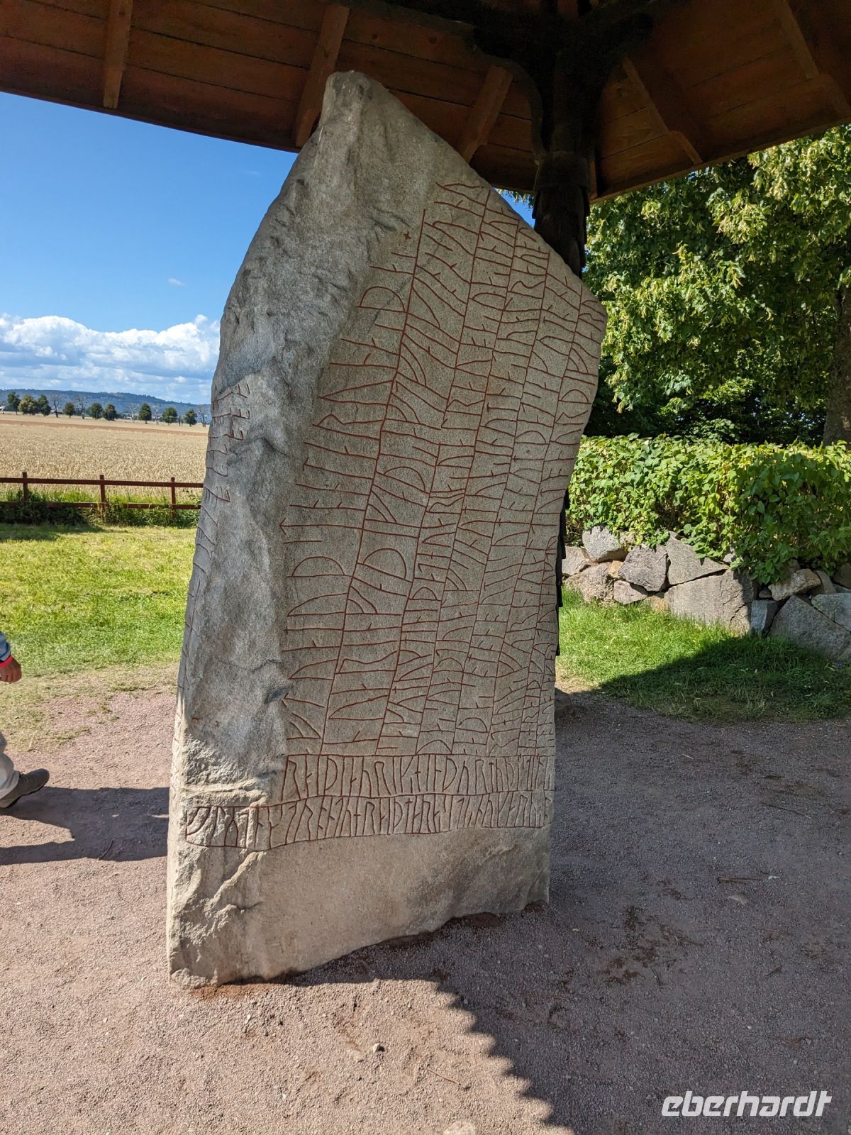 Auf unserer Route lagen die Städte Borås – bekannt für Textilproduktion – und Jönköping am Vätternsee, bekannt für seine einstige Streichholzproduktion und die Maschinenfabrik Husqvarna. Eine Rast oberhalb des Ufers des zweitgrößten schwedischen Sees lohnt vor allem an der schönen, aus einem alten Schloss entstandenen Hotel-Raststätte „Gyllene Yttern“. Hier gibt es sogar eine kleine Bonbonfabrik mit Schauwerkstatt, die „Polka-Griser“ - in Schweden beliebte rot-weiße Zuckerstangen – herstellt. Die Mittagspause hatten wir dann schon wenig später – nach einem Umweg durch kleine südschwedische Dörfer am berühmten Runenstein von Rök. Manche bezeichnen ihn als „schwedisches Nationaldenkmal“ – auf jeden Fall ist der vor der schönen weißen Dorfkirche von Rök stehende Runenstein einer der ältesten und größten seiner Art in Skandinavien. Er enthält die längste bekannte Runeninschrift und erinnert an die Frühzeit der Wikinger.