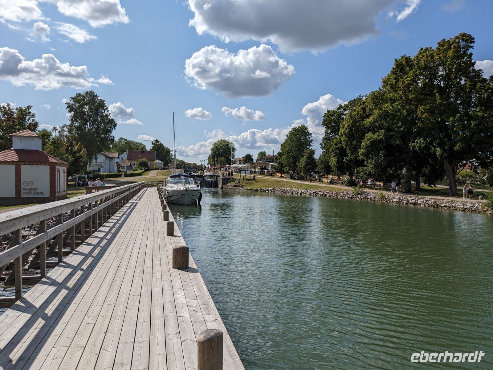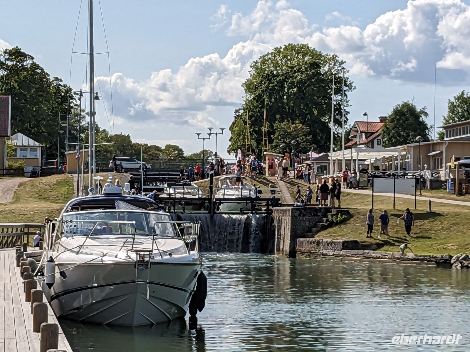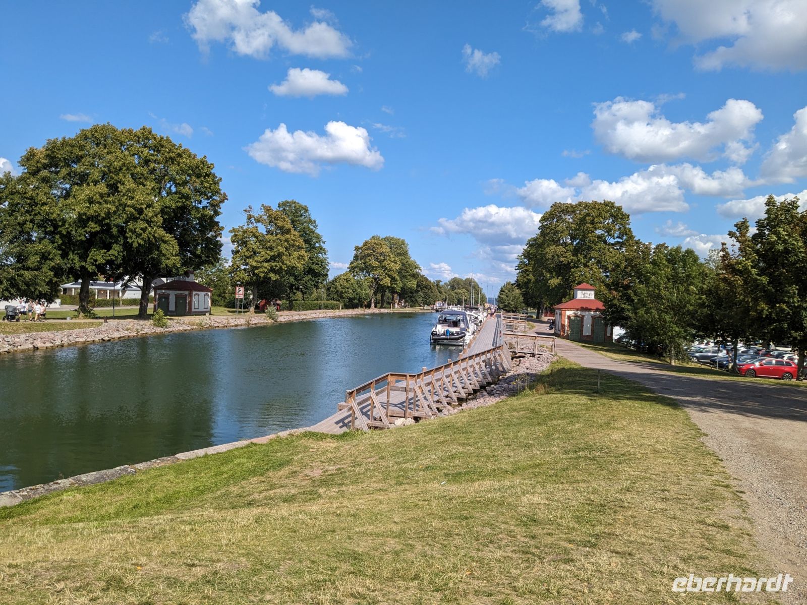 Es war von hier gar nicht weit bis zum nächsten Extra und die Zeit erlaubte noch einen Umweg. So fuhren zum berühmten Götakanal, der längsten künstlichen Wasserstraße Schwedens. Seit dem 19. Jahrhundert verbindet er die großen schwedischen Seen untereinander sowie mit der Ostsee bei Stockholm und mit der Nordsee über das Skagerrak, in das der vom Kanal erreichte Götafluss mündet. Ursprünglich war er für den Warentransport auf kleinen Flussschiffen gedacht, wird aber heute vorwiegend von Freizeitkapitänen genutzt. Wir fuhren zu einem der malerischsten Abschnitte des Götakanals, wo beim kleinen Dorf Berg mehrere Schleusen den Kanal mit kleineren Seen verbinden.