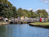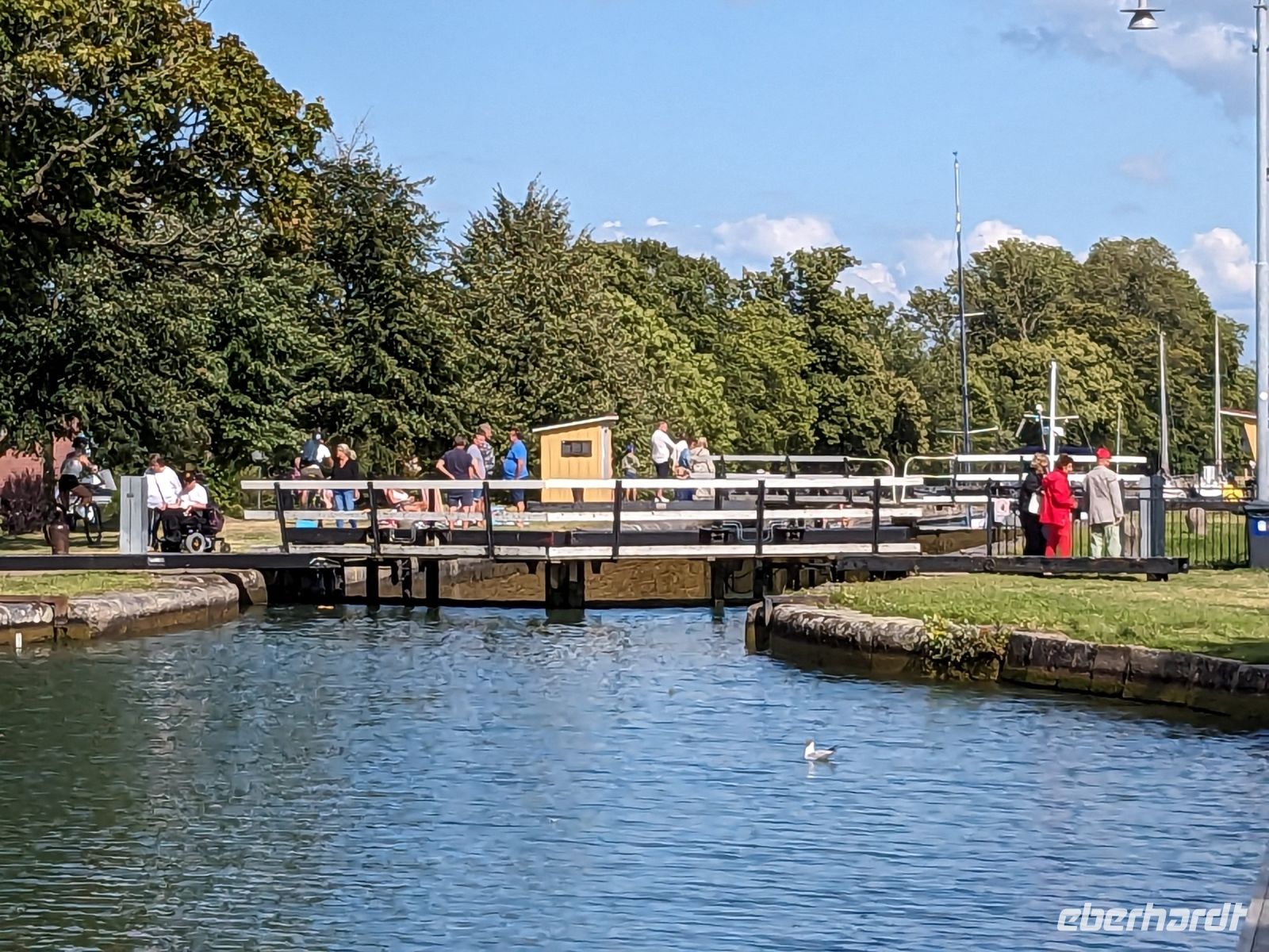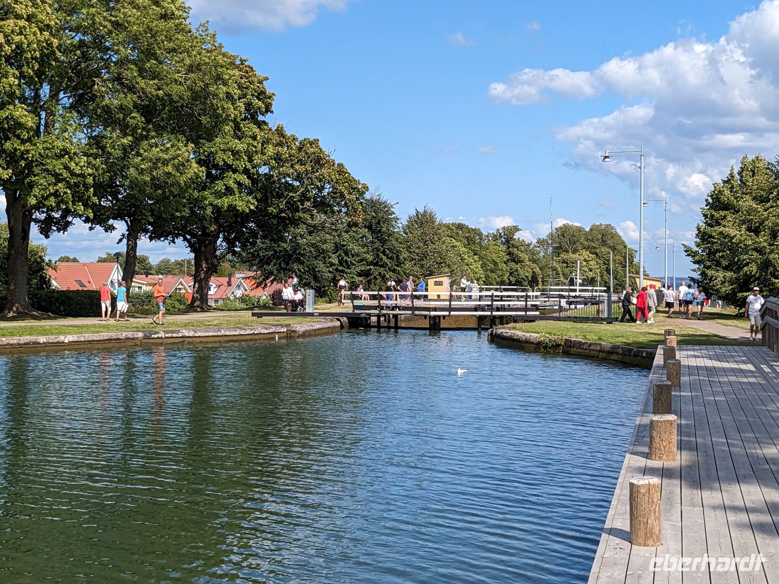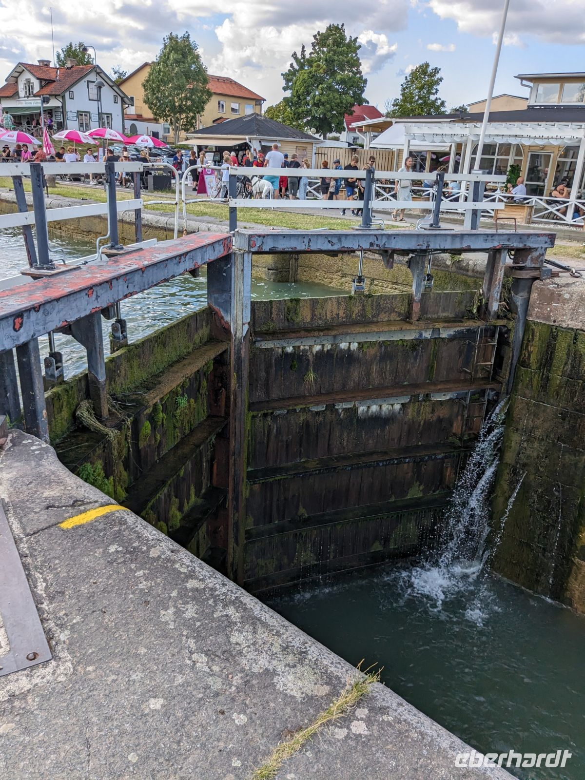 Es war von hier gar nicht weit bis zum nächsten Extra und die Zeit erlaubte noch einen Umweg. So fuhren zum berühmten Götakanal, der längsten künstlichen Wasserstraße Schwedens. Seit dem 19. Jahrhundert verbindet er die großen schwedischen Seen untereinander sowie mit der Ostsee bei Stockholm und mit der Nordsee über das Skagerrak, in das der vom Kanal erreichte Götafluss mündet. Ursprünglich war er für den Warentransport auf kleinen Flussschiffen gedacht, wird aber heute vorwiegend von Freizeitkapitänen genutzt. Wir fuhren zu einem der malerischsten Abschnitte des Götakanals, wo beim kleinen Dorf Berg mehrere Schleusen den Kanal mit kleineren Seen verbinden.
