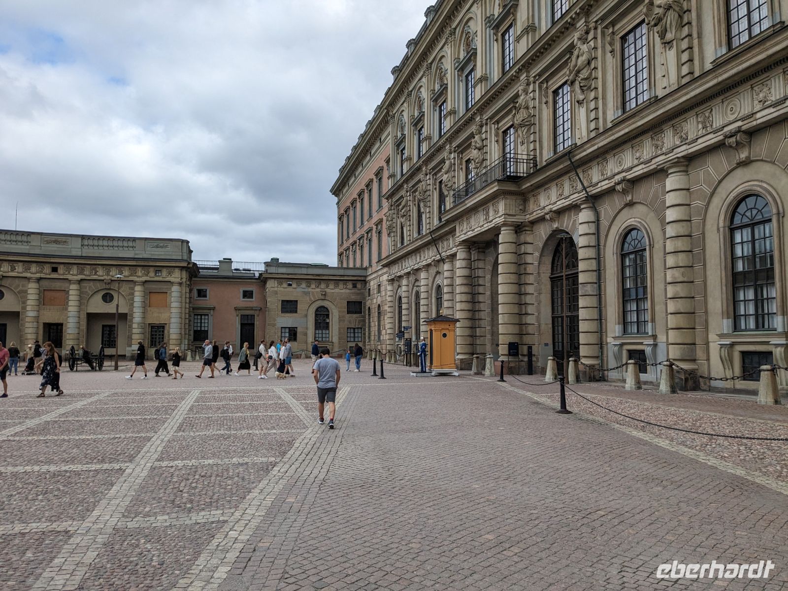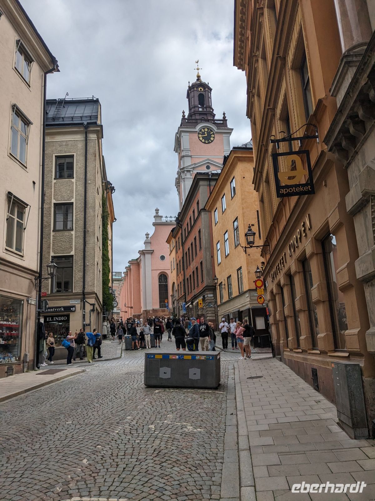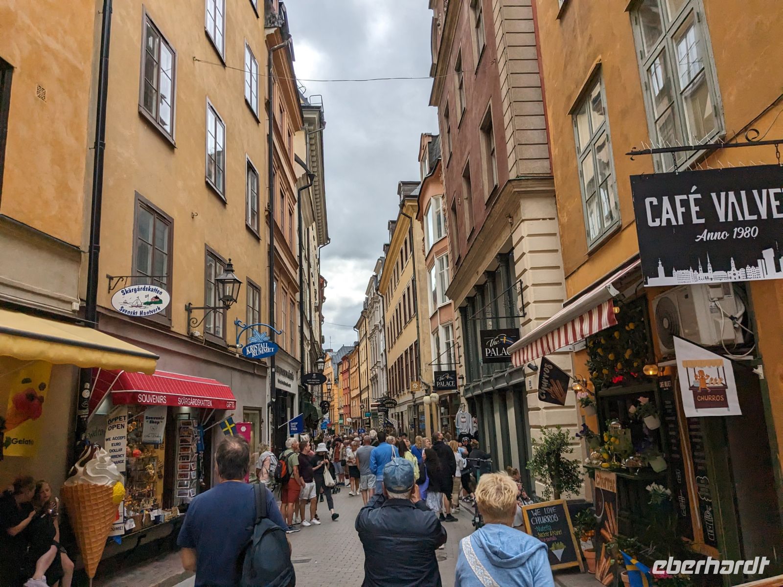 Heute früh trafen wir unsere Stadtführerin Alexa am üblichen Treffpunkt mit den Ortsführern, dem schwedischen Rathaus, das Anfang des 20. Jh. aus Backstein im Stil der schwedischen Nationalromantik erbaut wurde. Vorbei an verschiedenem Sehenswertem und dem belebten Verkehrsknotenpunkt „Slussen“, bei dem neben Dutzenden Fahrbahnen ein unter den über Brücken geführten Straßen raffiniertes Schleusensystem den Höhenunterschied zwischen dem Mälarsee, an dem Stockholm liegt und der Ostsee ausgleicht, ging es unter anderem zum schönsten Aussichtspunkt über die skandinavische Metropole im Ortsteil Södermalm. Von hier kann man hinübersehen zur Stockholmer Altstadt, zum Schloss, der Neustadt und verschiedene Seefahrts-Einrichtungen aber auch zur „Museumsinsel“ mit Nordischem und Vasa-Museum und dem Vergnügungsviertel Gröna Lund. Später ging es an königlicher Oper und Reichstagsgebäude vorbei bis zum am Rande der Altstadt gelegenen Schloss und der davor liergenden evangelischen Domkirche. Hier und auch in der anschließenden Freizeit bummelten wir über den Alten Markt, an dem nicht nur Schwedische Akademie steht, die jährlich über die Nobelpreisvergabe entscheidet, sondern auch der zentrale Brunnen, von dem aus alle Entfernungen Schwedens gemessen werden. In der Freizeit gab es die Möglichkeit, noch durch die Altstadtgassen mit ihren Souvenirladen und Cafés zu bummeln oder sich die tägliche Wachablösung im Hof des Königsschlosses anzuschauen.
