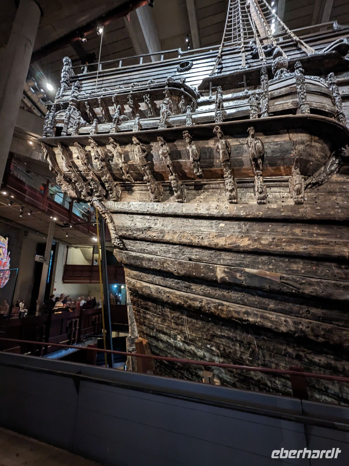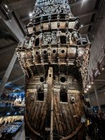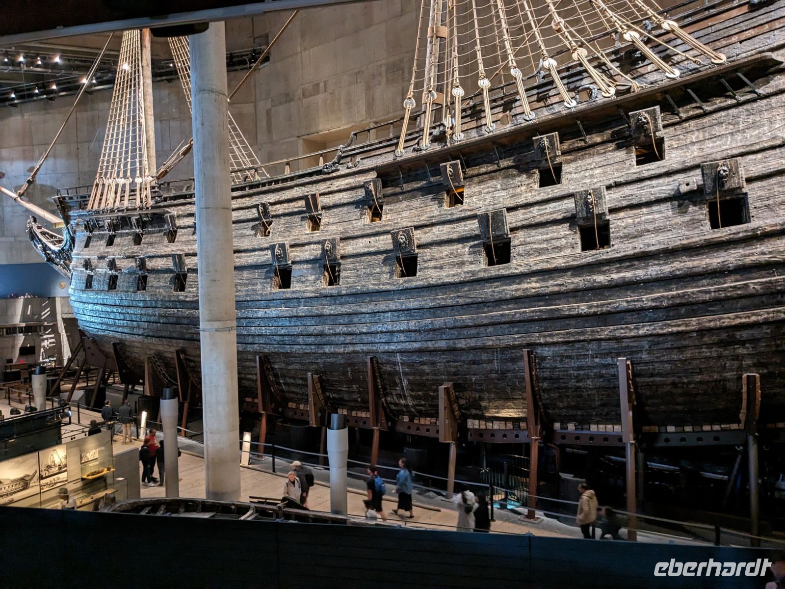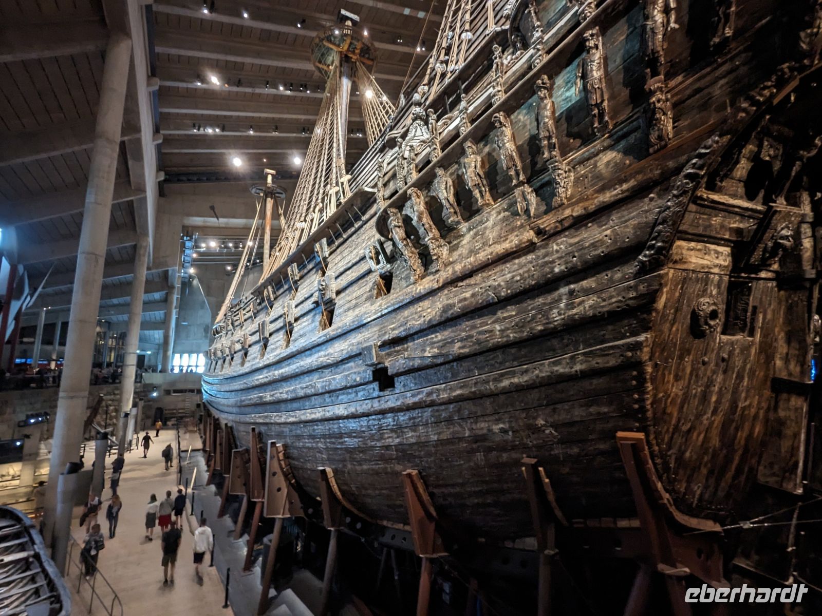 Am Ende, bevor wir Stockholm verlassen mussten, stand der Besuch des Vasa-Museums. Dieses bekannteste aller schwedischen Museen begeistert durch seine Authentizität: man sieht und „riecht“ ein nahezu vollständig erhaltenes Kriegsschiff aus der Zeit des Dreißigjährigen Krieges. Das um das Schiff herum gebaute und hervorragend gestaltete Museum zeigt sowohl das in den 60er Jahren des 20. Jh. gehobene und danach konservierte Schiff, als auch die dabei gefundenen Gegenstände und vermittelt einen Eindruck vom Leben in der schwedischen Marine des 17. Jh. Schon 1628, mitten im 30jährigen Krieg sollte die nach dem Königsgeschlecht benannte „Vasa“ als Flaggschiff der schwedischen Ostseeflotte dienen, versank aber aufgrund eines Konstruktionsfehlers schon auf ihrer Jungfernfahrt nach wenigen Kilometern im Stockholmer Hafen. Das Schiff wurde nahezu unversehrt aus dem Hafenschlamm geborgen, aufwendig konserviert und restauriert und ist seit den 90er Jahren des vorigen Jahrhunderts eine unbedingt sehenswerte Attraktion der schwedischen Hauptstadt.