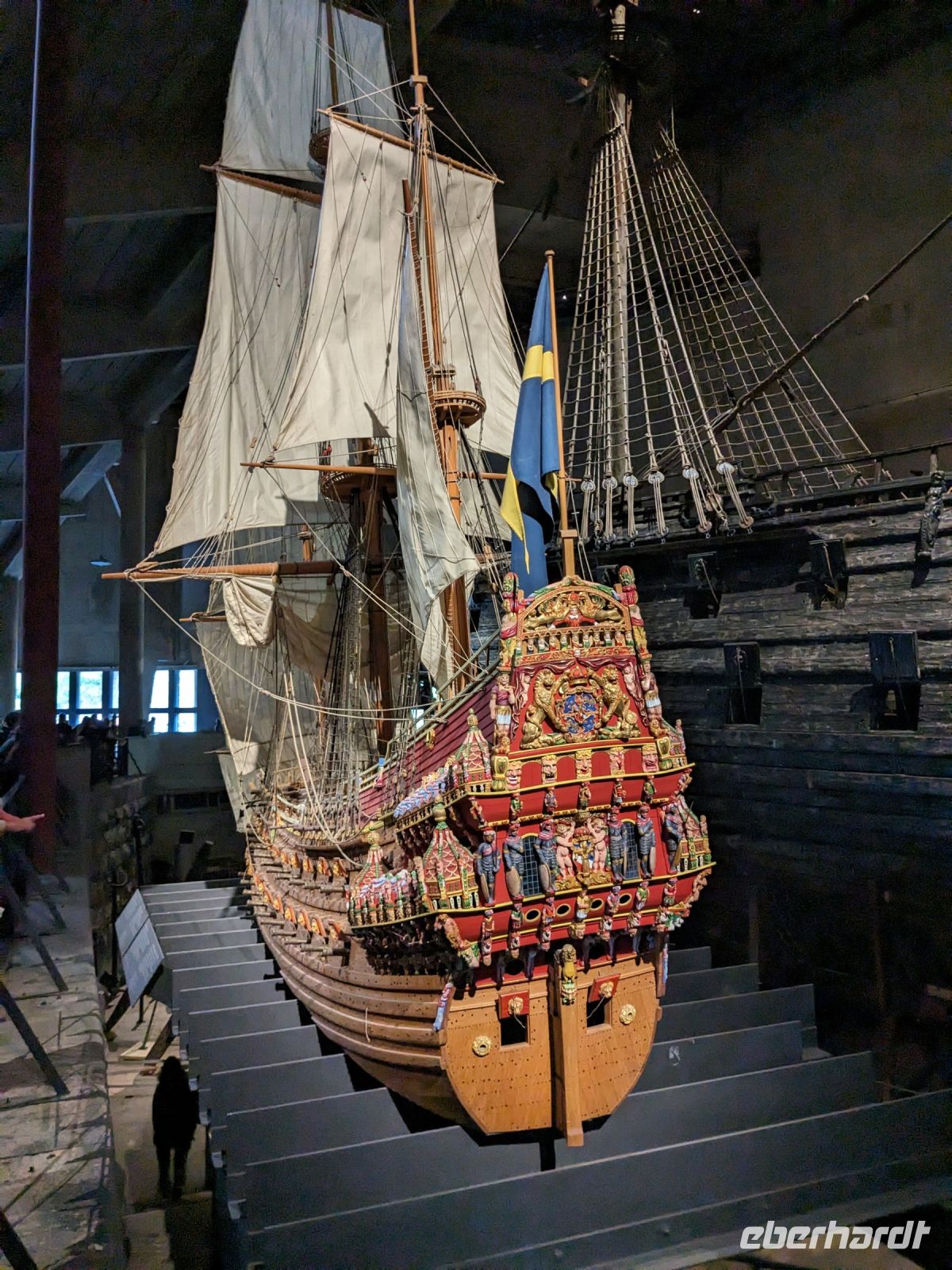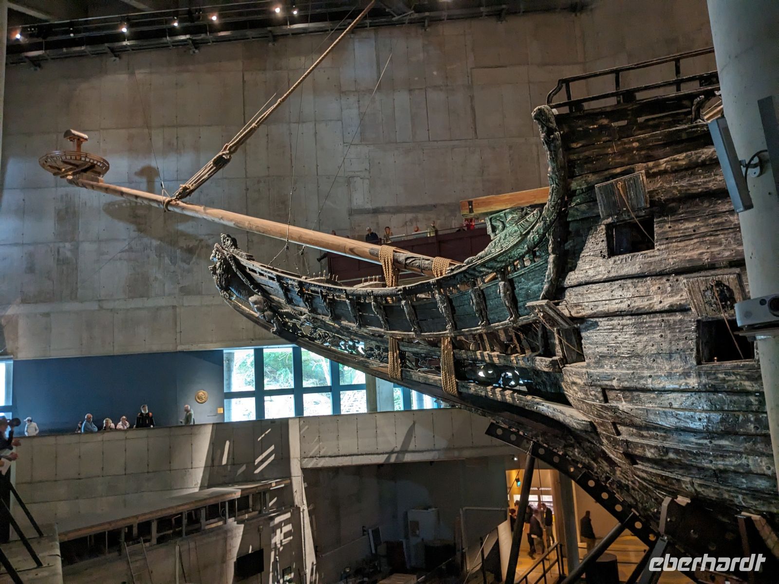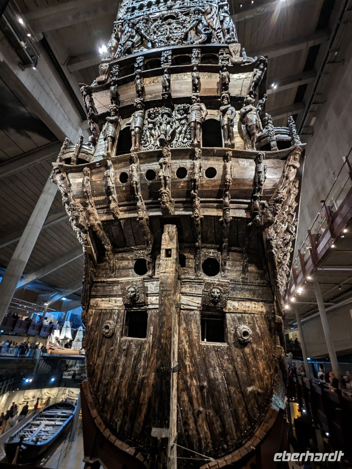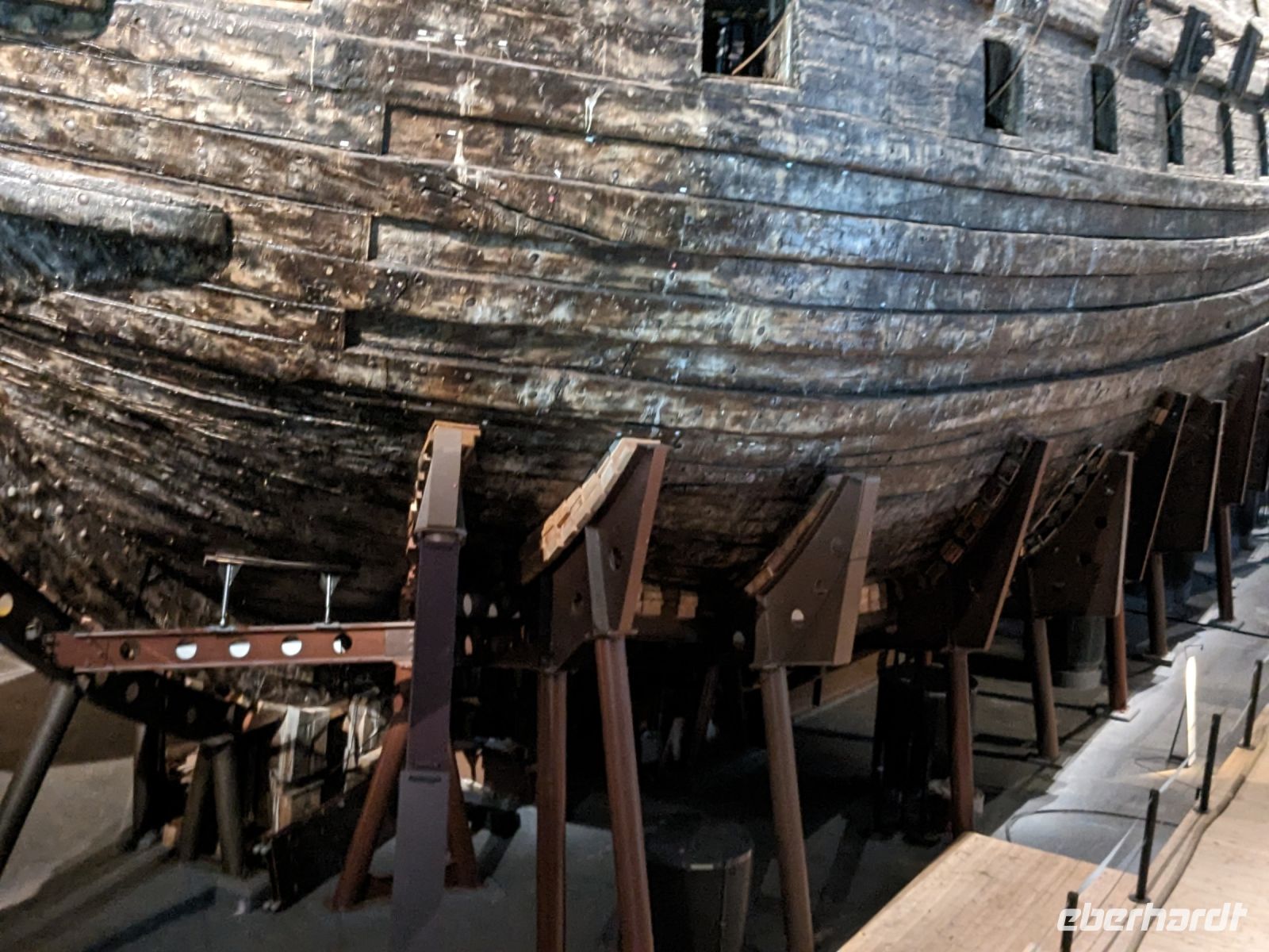 Am Ende, bevor wir Stockholm verlassen mussten, stand der Besuch des Vasa-Museums. Dieses bekannteste aller schwedischen Museen begeistert durch seine Authentizität: man sieht und „riecht“ ein nahezu vollständig erhaltenes Kriegsschiff aus der Zeit des Dreißigjährigen Krieges. Das um das Schiff herum gebaute und hervorragend gestaltete Museum zeigt sowohl das in den 60er Jahren des 20. Jh. gehobene und danach konservierte Schiff, als auch die dabei gefundenen Gegenstände und vermittelt einen Eindruck vom Leben in der schwedischen Marine des 17. Jh. Schon 1628, mitten im 30jährigen Krieg sollte die nach dem Königsgeschlecht benannte „Vasa“ als Flaggschiff der schwedischen Ostseeflotte dienen, versank aber aufgrund eines Konstruktionsfehlers schon auf ihrer Jungfernfahrt nach wenigen Kilometern im Stockholmer Hafen. Das Schiff wurde nahezu unversehrt aus dem Hafenschlamm geborgen, aufwendig konserviert und restauriert und ist seit den 90er Jahren des vorigen Jahrhunderts eine unbedingt sehenswerte Attraktion der schwedischen Hauptstadt.