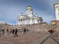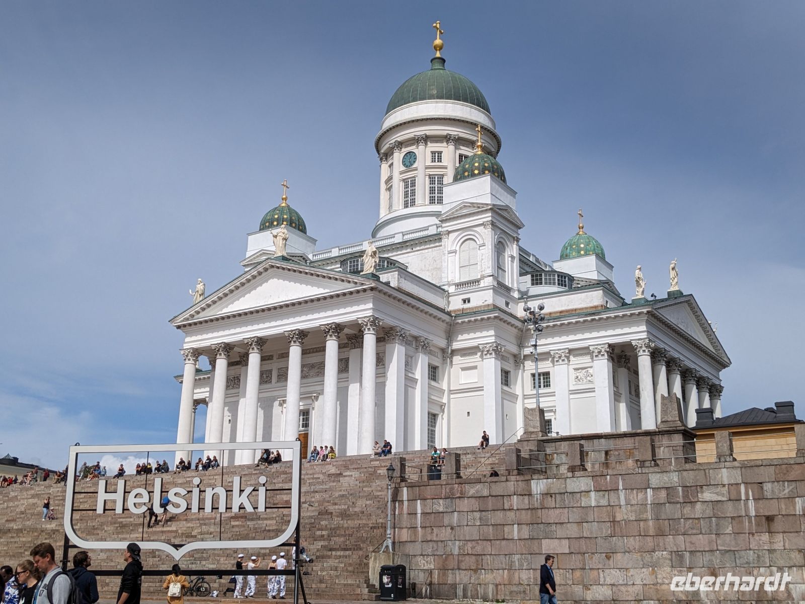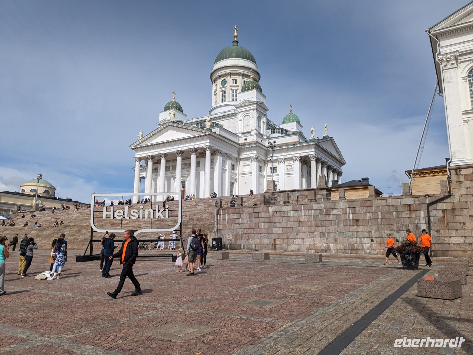 Zunächst fuhren wir am Olympiastadion vorbei, vor dem die Statue des finnischen Ausnahmesportlers Paavo Nurmi steht, wir besuchten das etwas ungewöhnlich aussehende Denkmal für den Nationalkomponisten Jean Sibelius, das an dessen „Waldmusik“ erinnern soll und dann ging es in die Innenstadt, wo wir repräsentative Bauten wie den Hauptbahnhof und verschiedene Bauten in Stilen von Klassizismus über Jugendstil bis zur modernen finnischen Architektur bewundern konnten. Einen Stopp gab es dann im Stadtzentrum am Senatsplatz, den der weithin sichtbare Dom von Helsinki, bekanntestes Wahrzeichen der Stadt, beherrscht. Zwischen 1830 und 1842 wurde die weiß leuchtende, hoch aufragende klassizistische Kathedrale erbaut, Zentrum einer seit der Hauptstadtentscheidung für Helsinki von 1812 von dem deutschen Architekten Carl Ludwig Engel, einem engen Freund Friedrich Schinkels geplanten Altstadt. Ein repräsentatives Zentrum nach dem Vorbild der damals auch erst etwa 100 Jahre alten Stadt St. Petersburg sollte es werden und der Senatsplatz hält den Vergleichen mit anderen Stadtzentren gut und gerne stand.