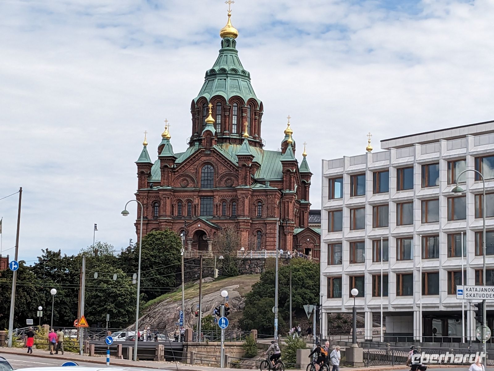 Schließlich setzten wir die Stadtrundfahrt mit Kommentaren zu weiteren repräsentativen Gebäuden fort und endeten nahe der Uspenski-Kathedrale, der auf einem Felsen nahe dem alten Hafen Mitte des 19. Jh. erbauten roten Kathedrale im russisch-byzantinischen Stil. Sie ist als Hauptsitz des Bischofs der finnisch-orthodoxen Kirche ein Symbol für die Zeit, als Finnland zu Russland gehörte und heute die größte orthodoxe Kathedrale im westlichen Europa. Ein Stück von ihr entfernt konnte unser Bus stehen und in der Freizeit war nicht nur Zeit für ein Foto und einen kleinen Mittagsimbiss im Hafen-Markt, sondern auch für eventuellen Shopping-Abstecher zur alten Markthalle.