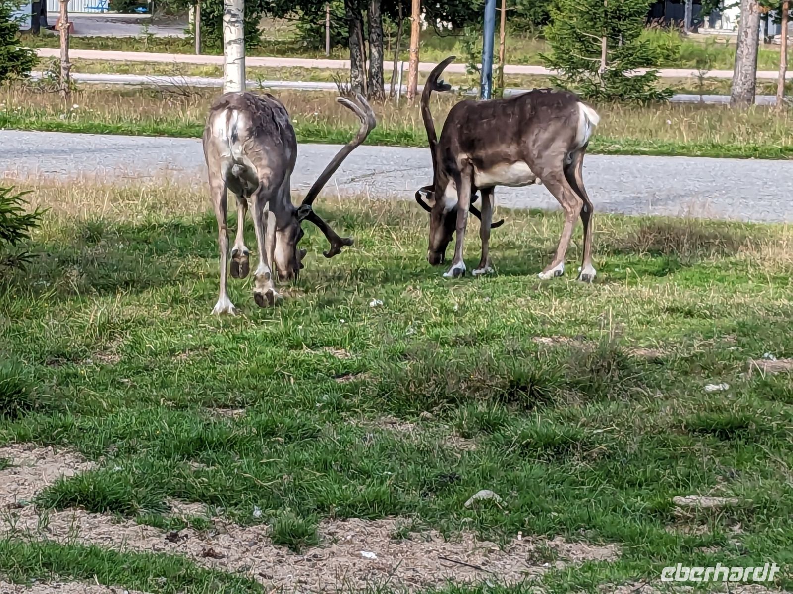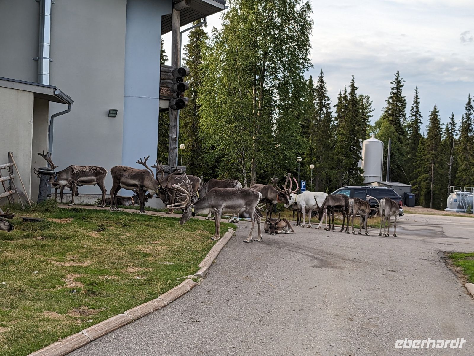 Gut eine Stunde nach Verlassen des Weihnachtsmanndorfes erreichten wir unser Hotel und stellten fest, dass sich viele Dutzend Rentiere hier aufhielten – für uns nicht ganz ungelegen, boten sie doch Motive für ungestörte und ungestellte Fotos.