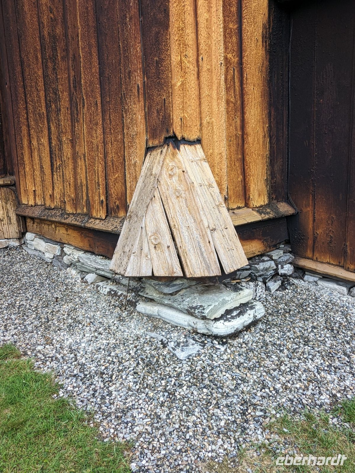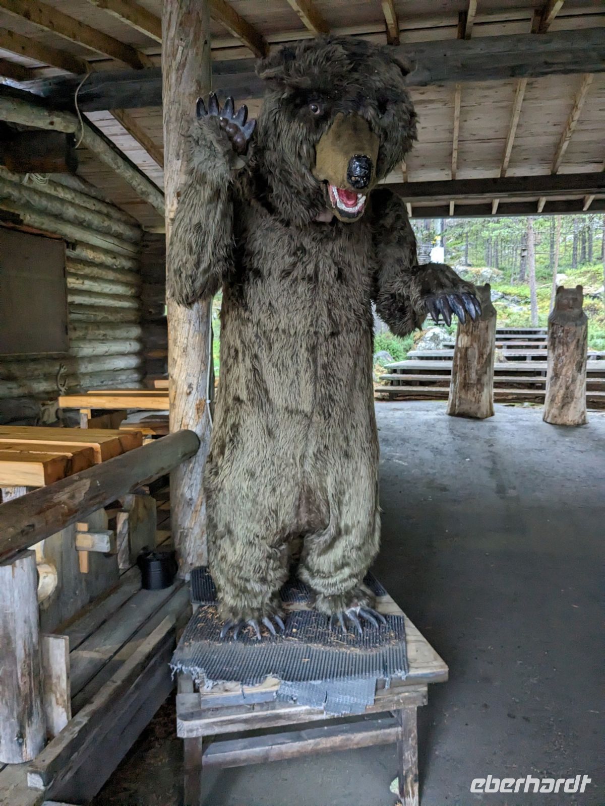 Heute war das Wetter schlechter als in den letzten Tagen, Nieselregen und tiefhängende Wolken sorgten für Abkühlung und nicht immer gute Sicht. So fuhren wir erst ein Stück in Richtung Norden, bevor wir in der „Bärenhöhle Karhunpesäkivi“, einem Rast- und Souvenirshop einen Stopp einlegten. In der Nähe gibt es tatsächlich eine – allerdings etwas schwierig zu erreichende Höhle, in der Knochen von Höhlenbären gefunden wurden. Ein inzwischen recht in die Jahre gekommener ausgestopfter Braunbär begrüßte uns hier an der Raststätte. Bei der Weiterfahrt hielten wir wegen des strömenden Regens nicht am oft in Kreuzworträtseln gefragten Inarisee an, dem sechstgrößten See Europas und dem drittgrößten der etwa 100.000 Gewässer im Seenland Finnland, sondern fuhren, mit einem Stopp unterwegs an einer Gamme – dem aus Holz und Torf bzw- Grassoden bestehenden Winterquartier des samischen Volkes – bis kurz hinter die norwegische Grenze in den Ort Karasjok. Hier, im norwegischen Hauptort Lapplands, wie die überwiegend von Samen bevölkerte nördlichste Region Europas genannt wird, legten wir eine Rast ein.