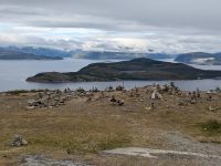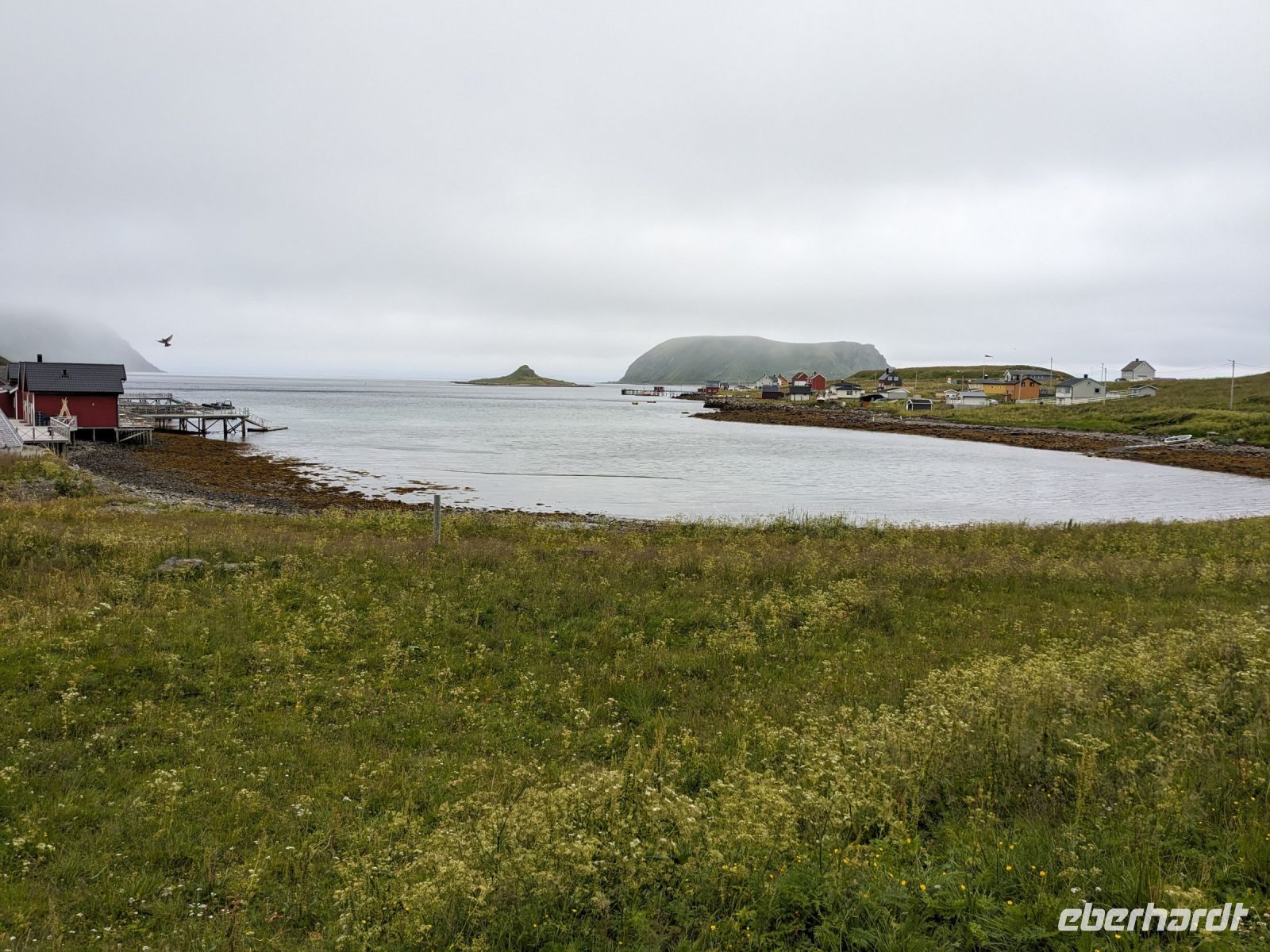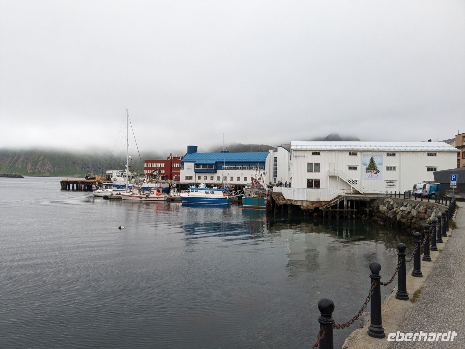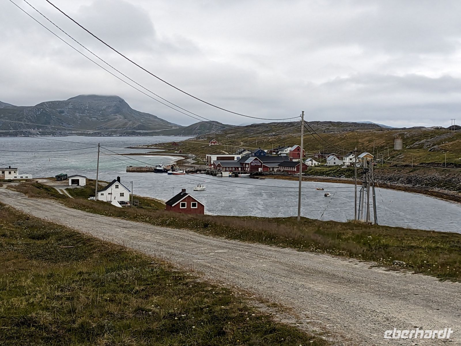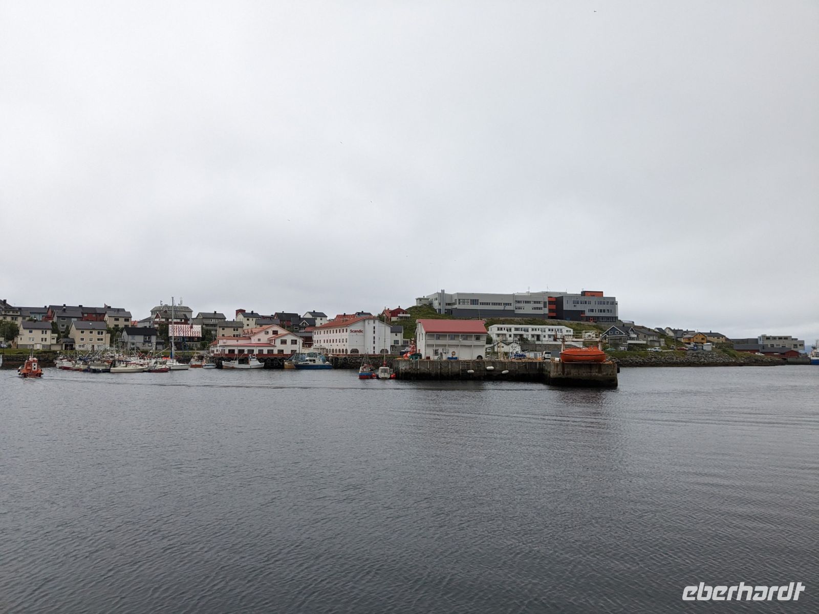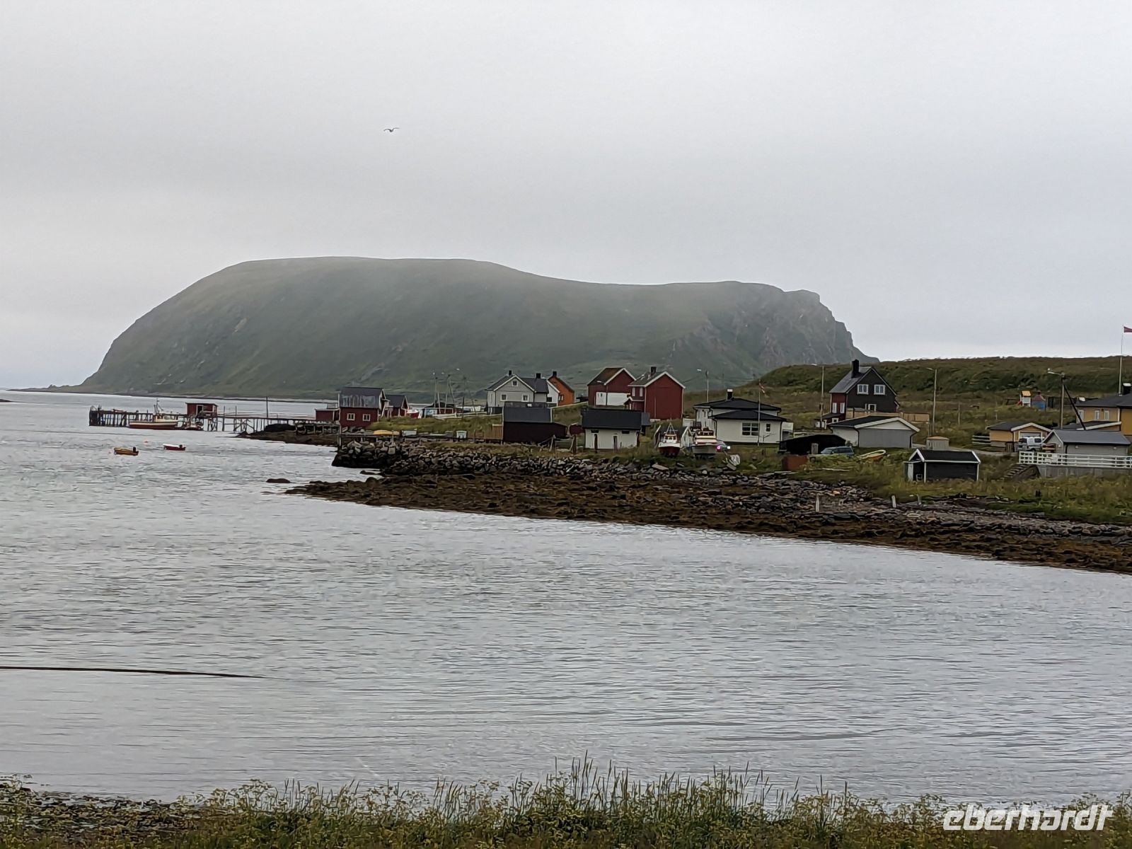 Weiter ging es dann nach Norden bis zum Porsangerfjord, an dessen nördlicher Einmündung in den Atlantik bereits die Insel Magerøya mit dem Nordkap liegt. Ein weiterer Stopp an einem Rastplatz in einer der wenigen Siedlungen so hoch im Norden und wir setzten die Fahrt bei kühlem Wetter immer entlang der Porsangerküste fort, die ab und zu von hübschen bunten, meist auf Stelzen stehenden Rorbuer – Fischerhütten – gesäumt wird. Der Fjord hat nur wenige kleine Fischerdörfchen und von der Eiszeit abgeschliffene Gebirgsketten als Umrahmung und immer wieder Schiefergestein und Felskanten am Straßenrand. Kurz vor unserem Tagesziel gelangten wir mittels FATIMA – wie die abkürzungs-vernarrten Norweger das Tunnel- und Brückensystem „Fastlandsförbindelse til Magerøya“ (Festlandsverbindung nach Magerøya) zum Nordkapp nennen - in den Hauptort der Gemeinde „Nordkapp“, die kleine Hafenstadt Honningsvåg.