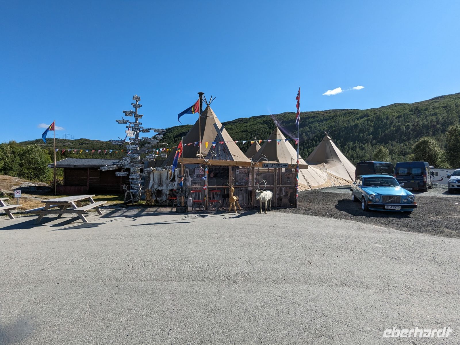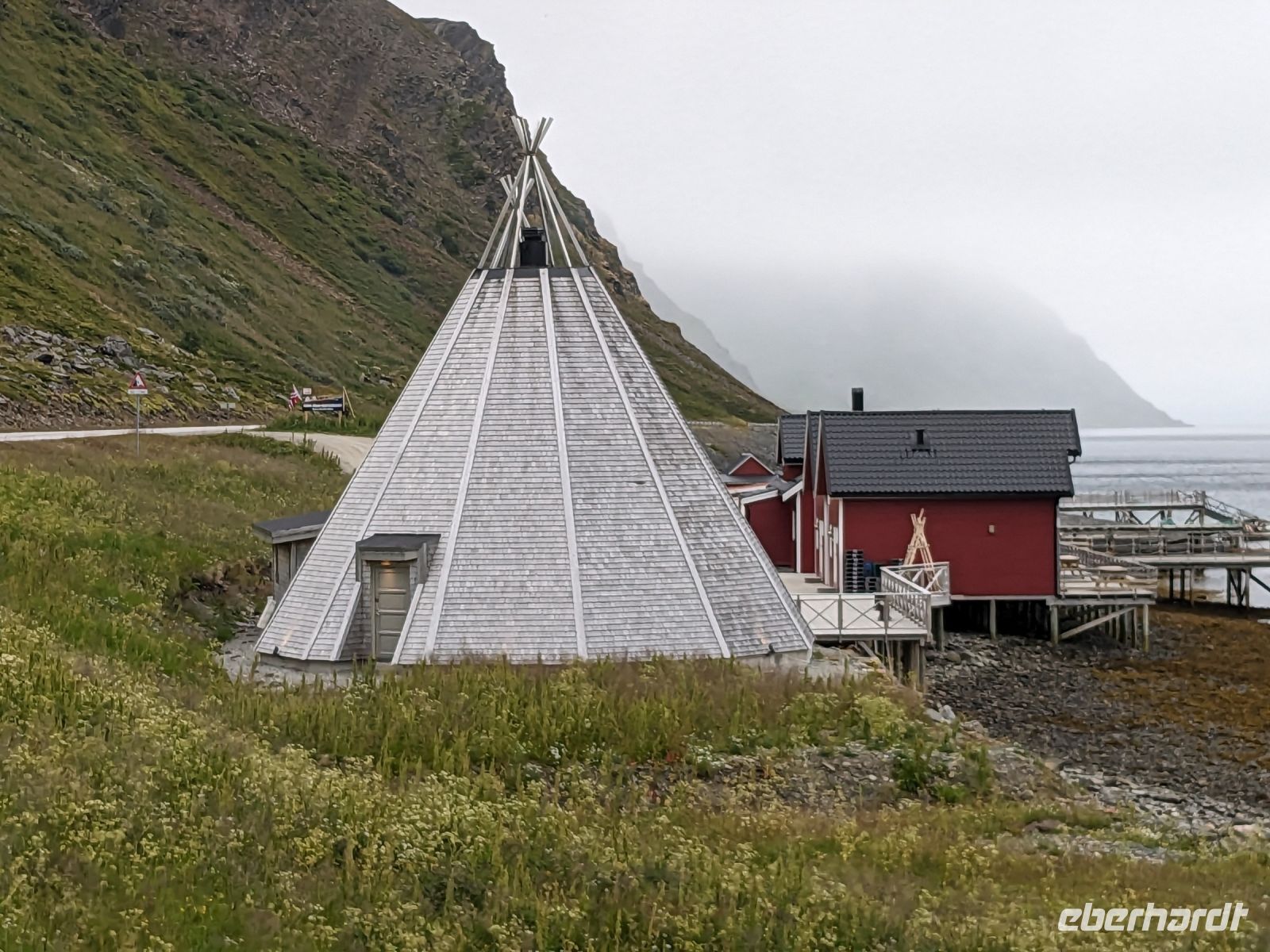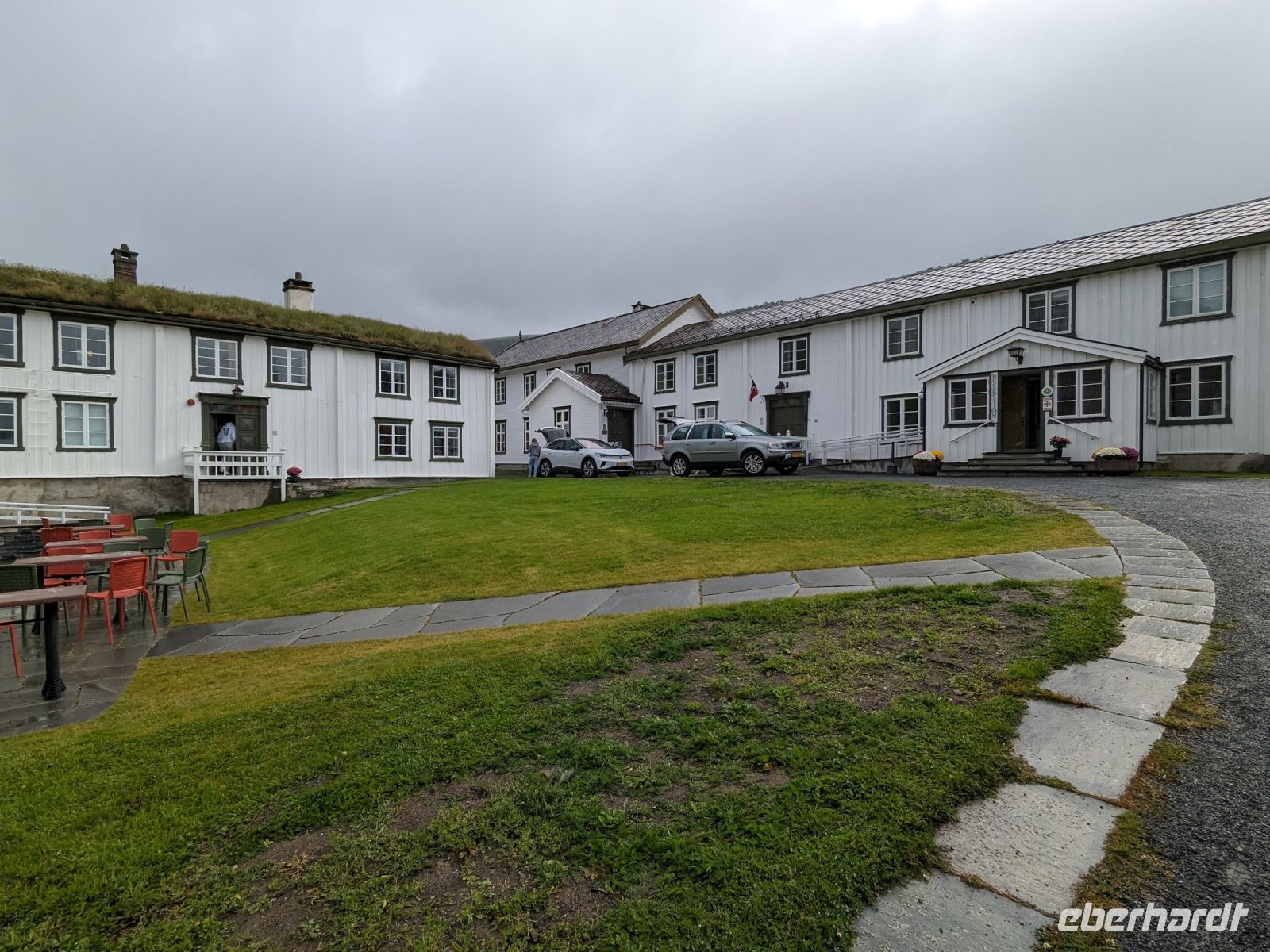 Bei unserer weiteren Fahrt folgten wir weitgehend den Fjordufern, und da die Küstenlinie Norwegens malerisch, aber sehr lang ist, dauerte das einige Zeit. Einen Nachmittagsstopp legten wir am originellen Gästehaus „Gildetun“ ein, das in typisch arktisch-samischer Manier als Restaurant mit umliegenden Blockhütten zum Wohnen eingerichtet ist und spektakuläre Ausblicke auf Fjorde und Berge bietet.