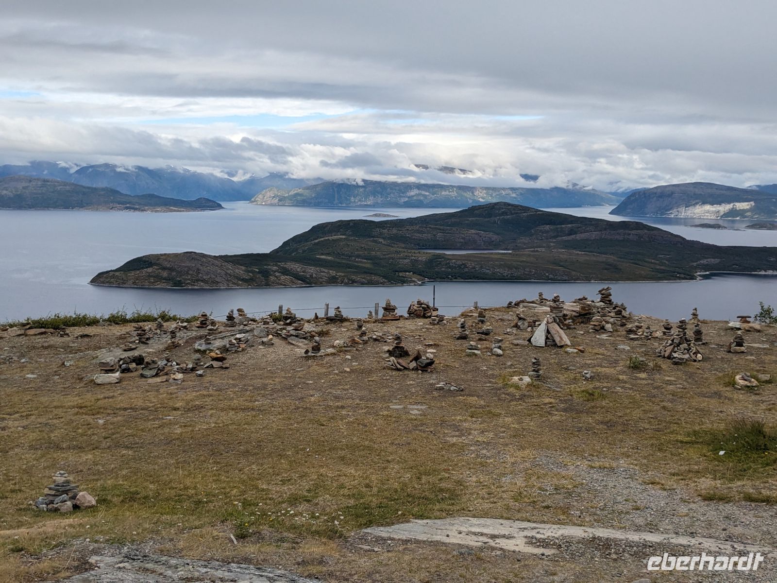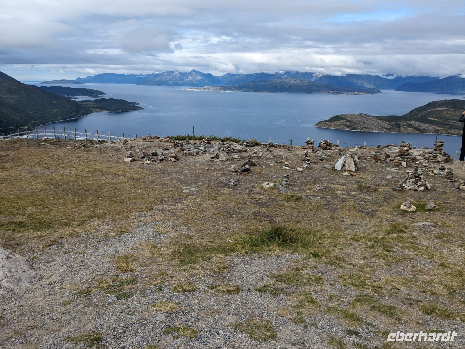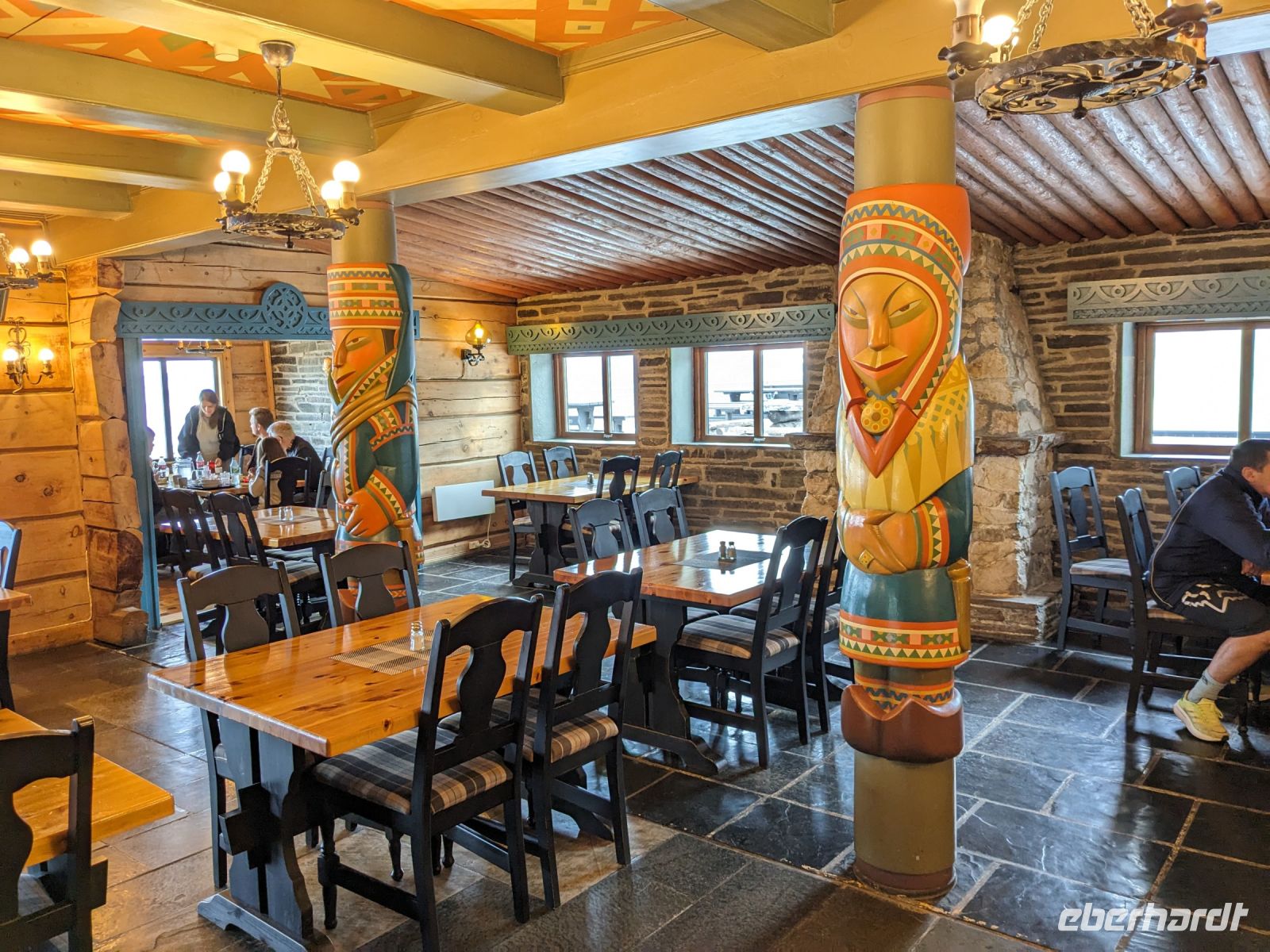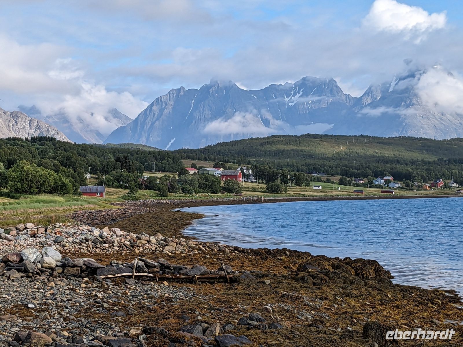 Bei unserer weiteren Fahrt folgten wir weitgehend den Fjordufern, und da die Küstenlinie Norwegens malerisch, aber sehr lang ist, dauerte das einige Zeit. Einen Nachmittagsstopp legten wir am originellen Gästehaus „Gildetun“ ein, das in typisch arktisch-samischer Manier als Restaurant mit umliegenden Blockhütten zum Wohnen eingerichtet ist und spektakuläre Ausblicke auf Fjorde und Berge bietet.