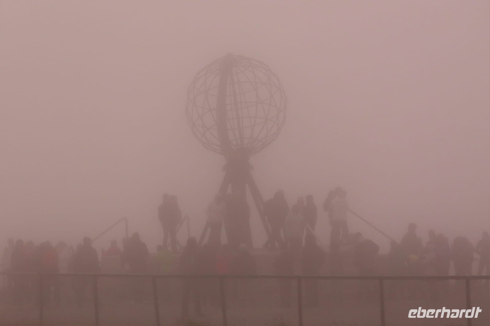 Dann erreichten wir die Nordkapphalle mit ihren Souvenirshops, gastronomischen und musealen Einrichtungen und bemerkten schon bei Ankunft, dass uns jeglicher Blick auf die Mitternachtssonne verwehrt bleiben würde. Tiefhängende Wolken, Nebel und Sprühregen machten den Aufenthalt am nördlichsten Punkt Europas nicht besonders angenehm. Selbst das „Ende der Welt“, symbolisiert durch den berühmten Globus auf dem Kapfelsen, konnte man nur in wenigen Augenblicken mal aus dem Nebel auftauchen sehen, und dann musste man schnell sein für ein Foto.