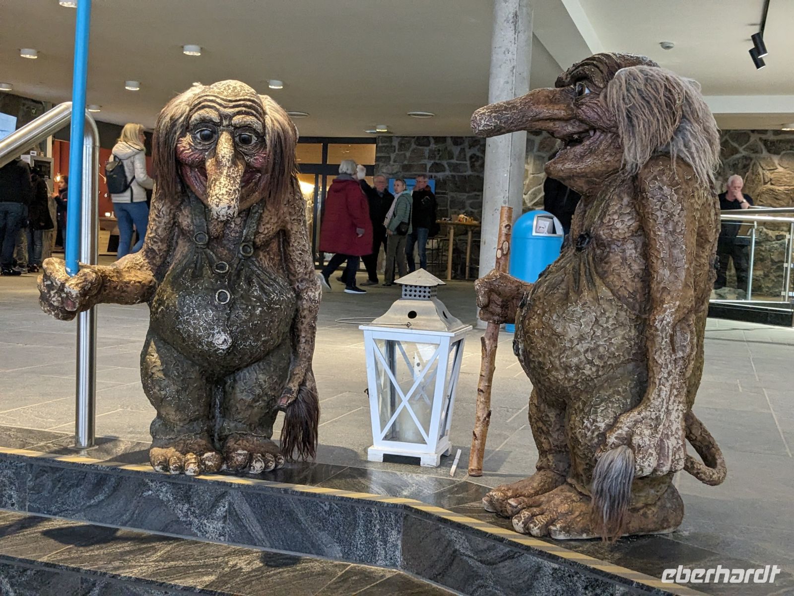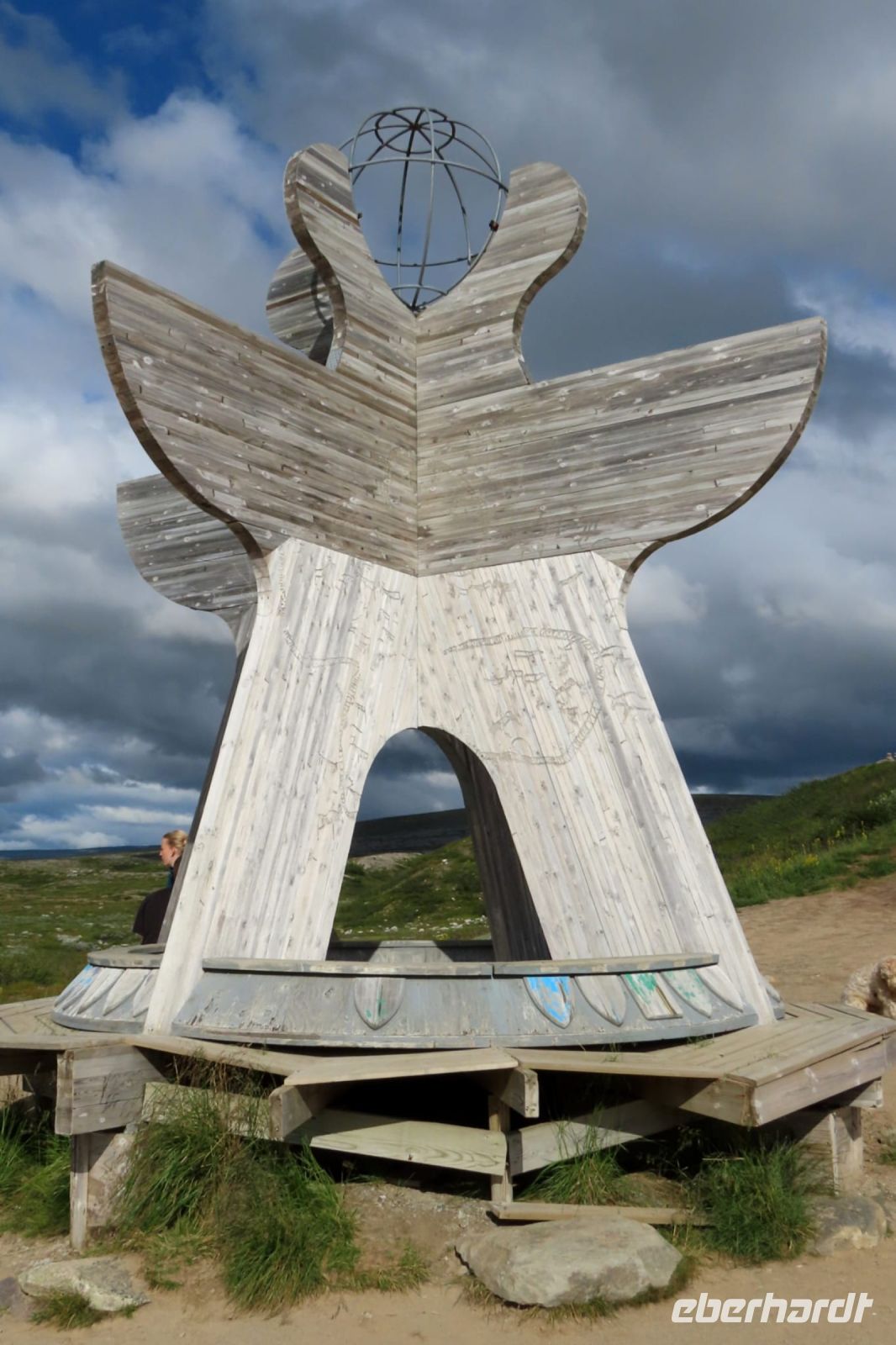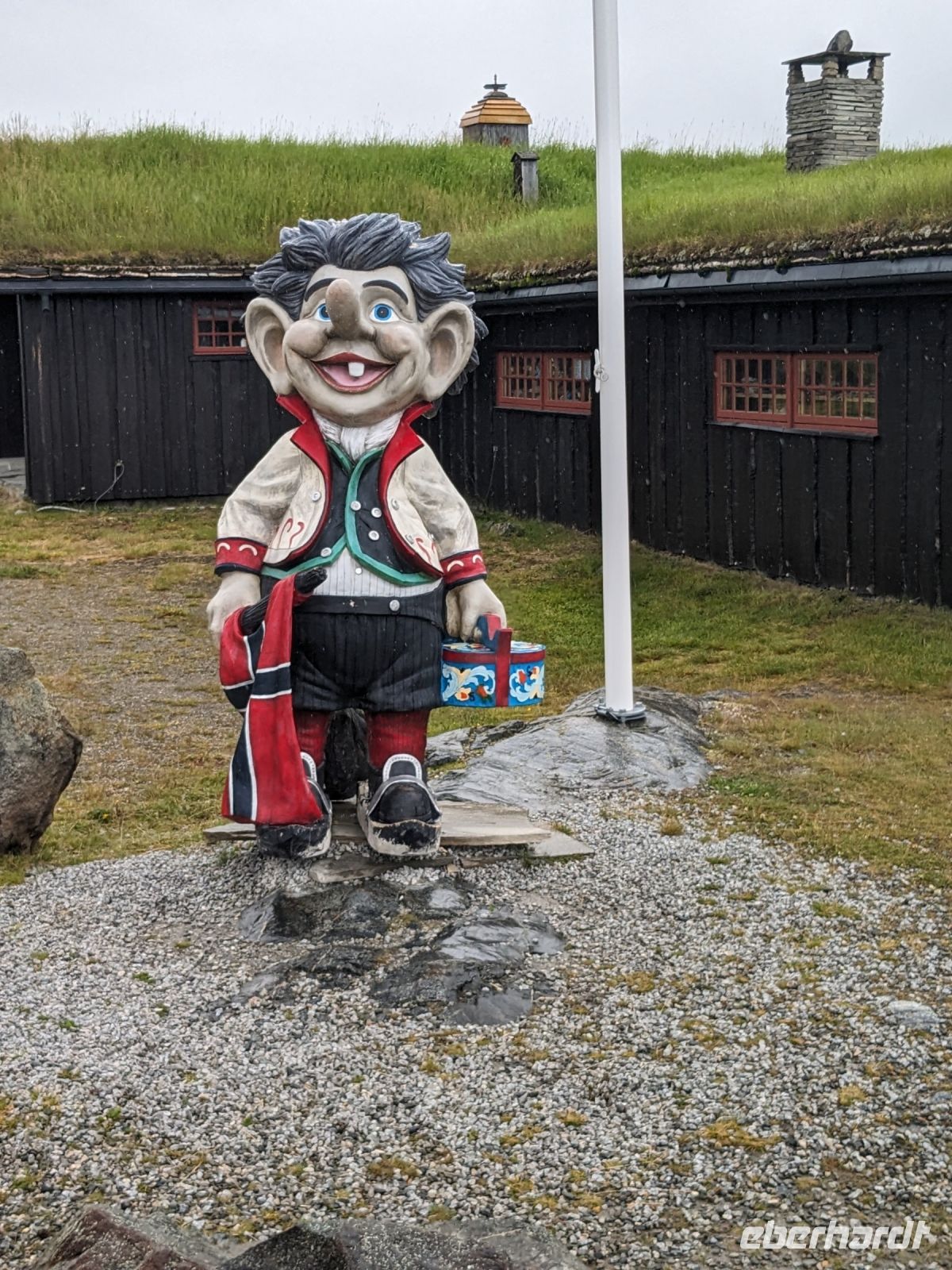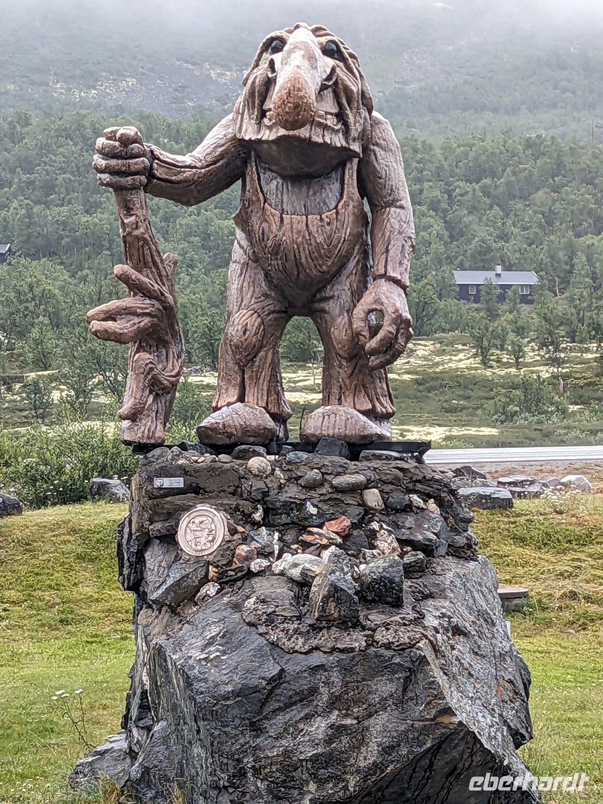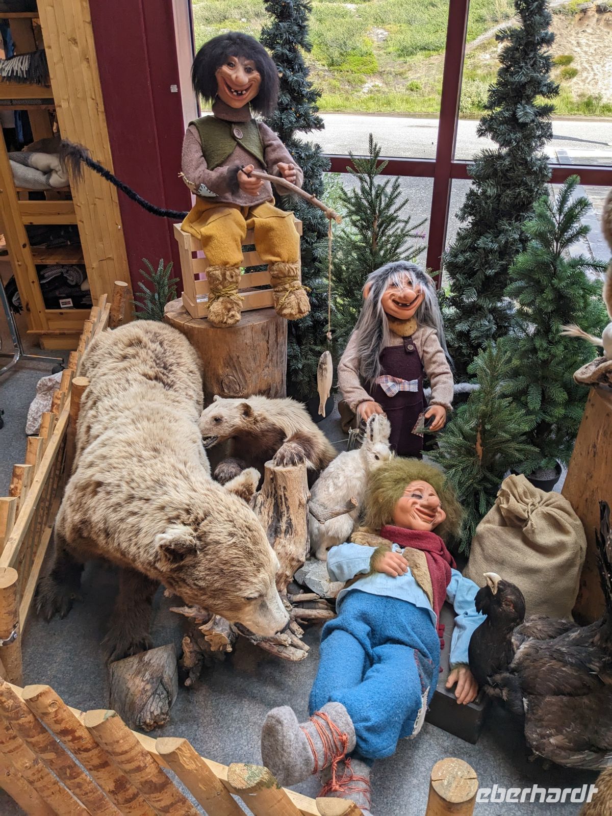 Dann fuhren wir über das Saltfjell, eine Hochfläche, an deren Rand der mächtige Svartisen-Gletscher liegt, den man von der Straße aus aber leider nicht sehen kann. Am späten Nachmittag erreichten wir wieder den Polarkreis und hatten hier einen Stopp zum Besuch des Polarkreiszentrums. Hier gibt es Toiletten, Gastronomie und – natürlich - ein großes Souvenirgeschäft. Allerdings zeigt dieses – fast nebenbei – eine originelle Sammlung von „Bewohnern“ der Polarregion – vom ausgestopften Eisbären und Polarfuchs bis zu einer Gruppe von Trollen…