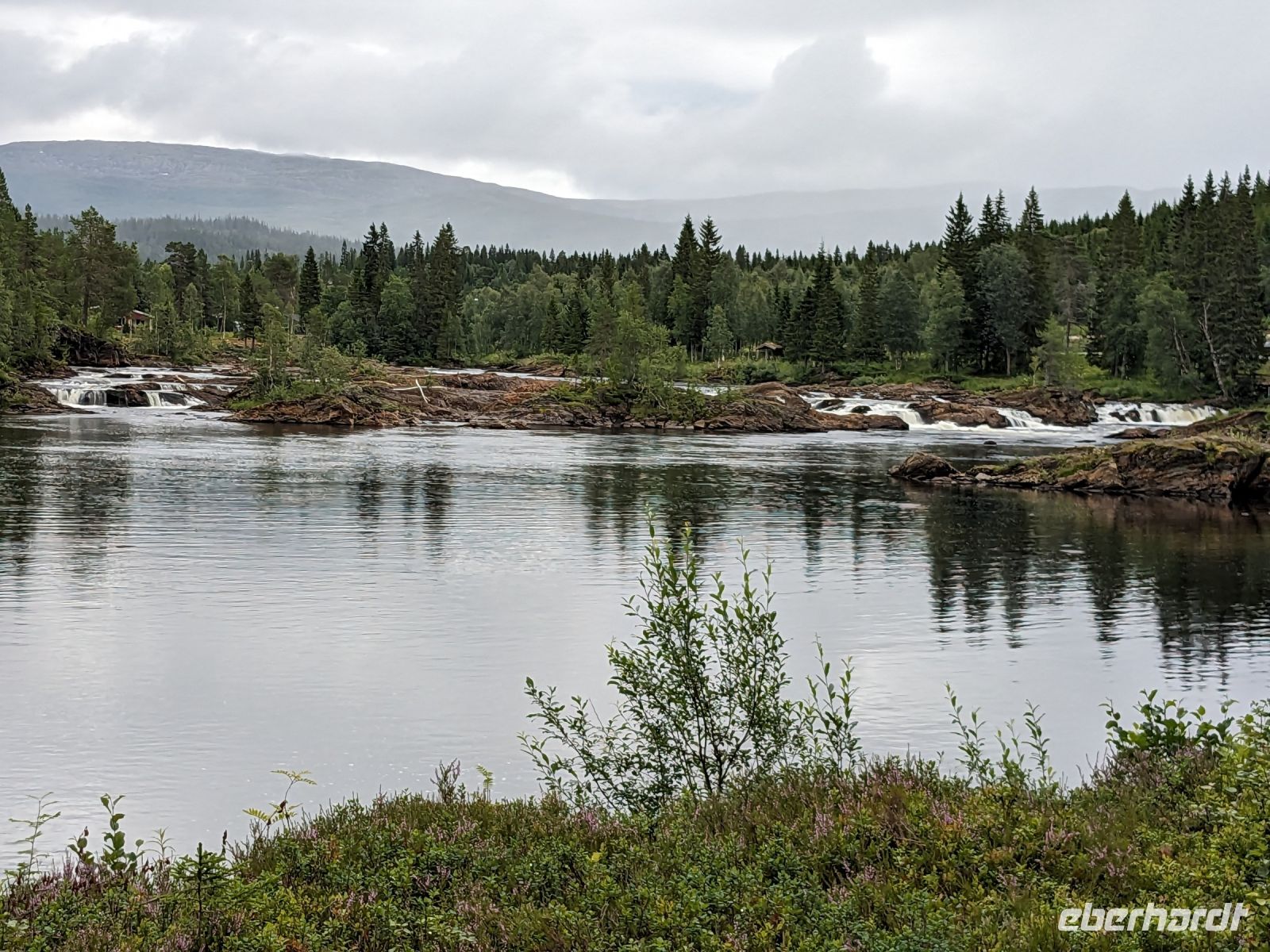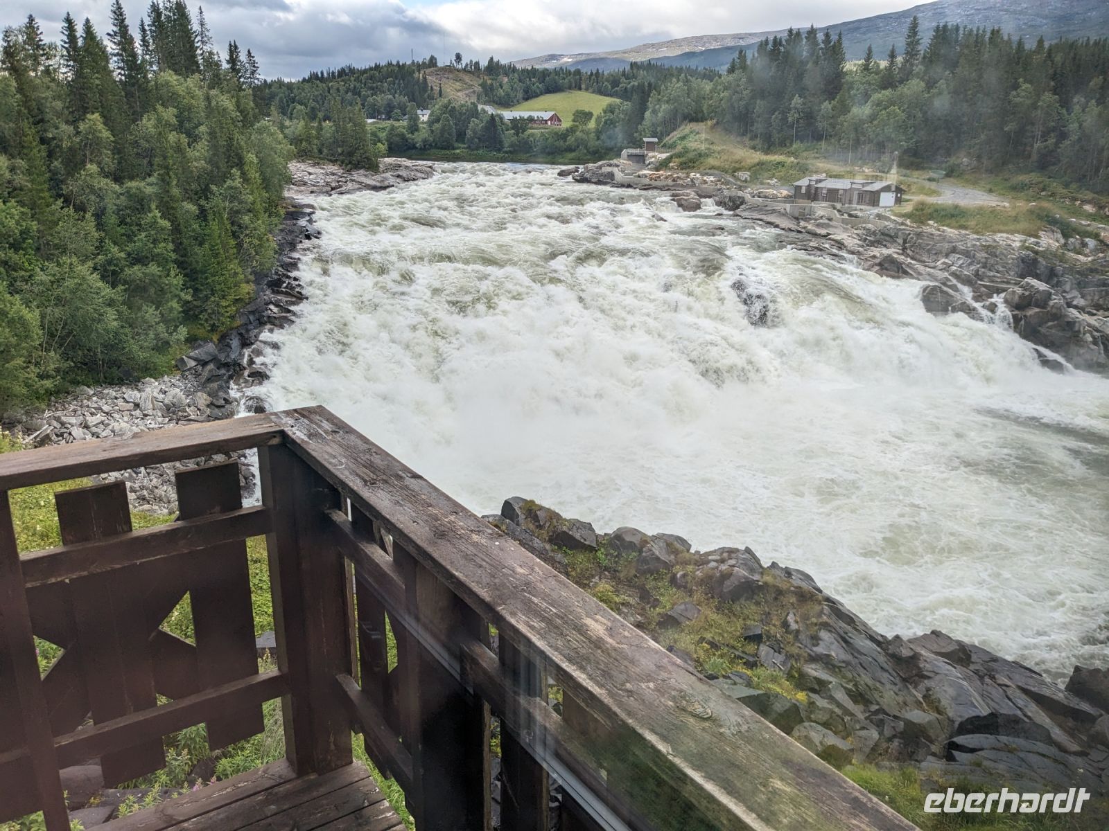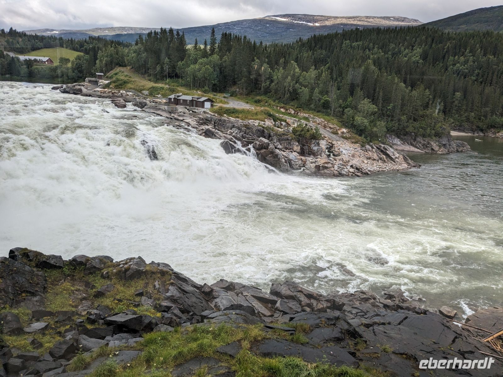 Vorbei an der Hafen-und Industriestadt Mosjøen, bekannt durch ihr Aluminiumwerk, ging es durch das Namsedal, entlang an einem der wasserreichsten Flüsse Norwegens, dem Namsen, der bei Anglern wegen seines Fischreichtums, vor allem an Lachsen und Forellen beliebt ist. Wir hielten dann zur ersten Pause auch an einem Wasserfall, dem Laksfoss, später zur Mittagspause in der Kommune Grong.