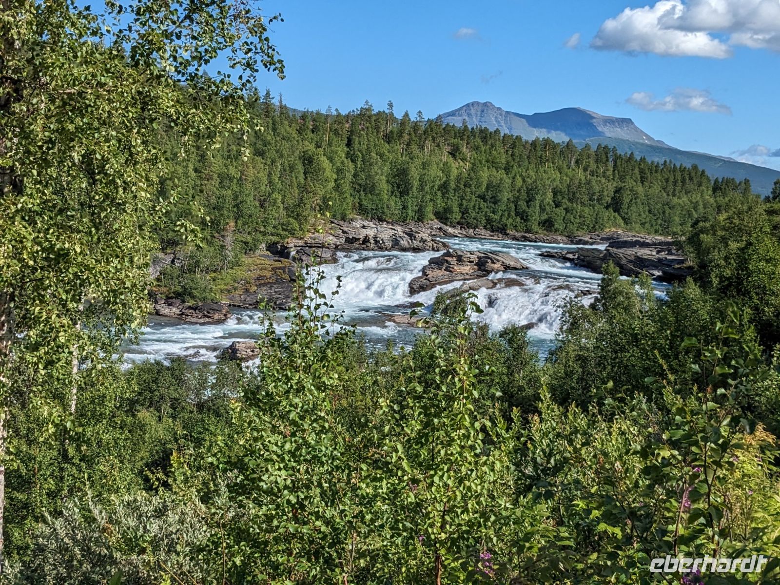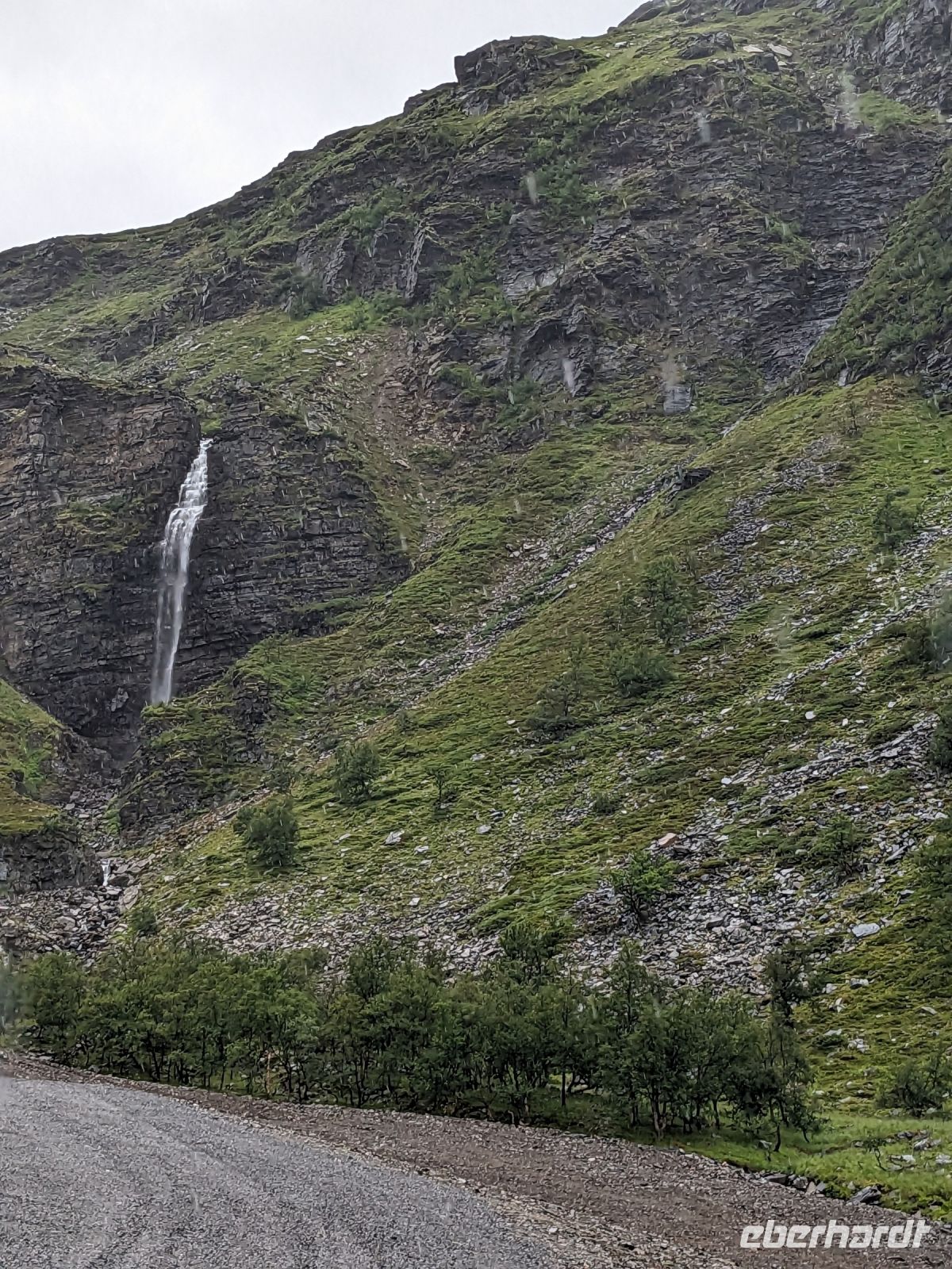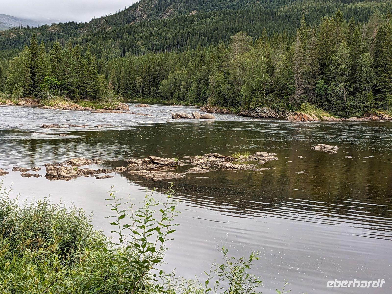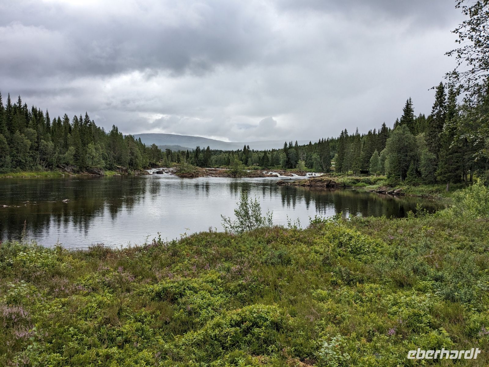 Vorbei an der Hafen-und Industriestadt Mosjøen, bekannt durch ihr Aluminiumwerk, ging es durch das Namsedal, entlang an einem der wasserreichsten Flüsse Norwegens, dem Namsen, der bei Anglern wegen seines Fischreichtums, vor allem an Lachsen und Forellen beliebt ist. Wir hielten dann zur ersten Pause auch an einem Wasserfall, dem Laksfoss, später zur Mittagspause in der Kommune Grong.