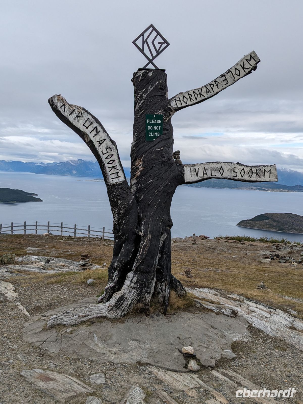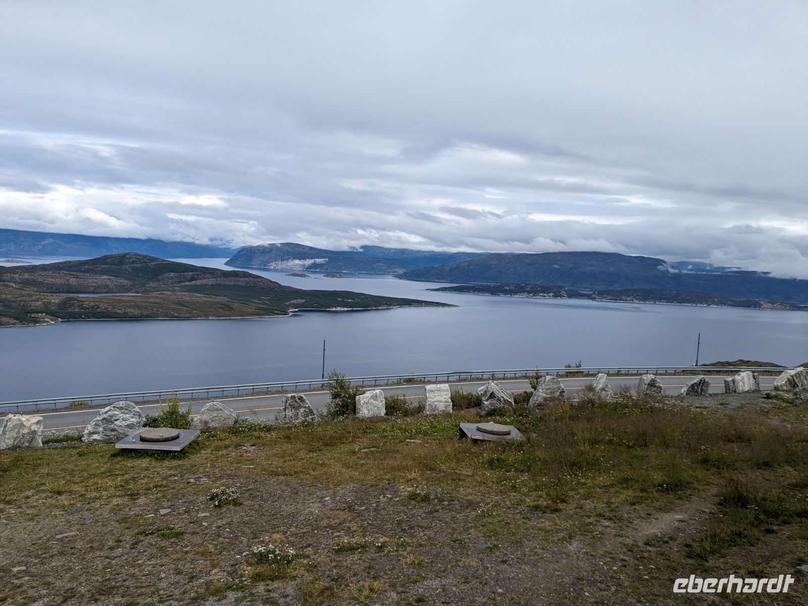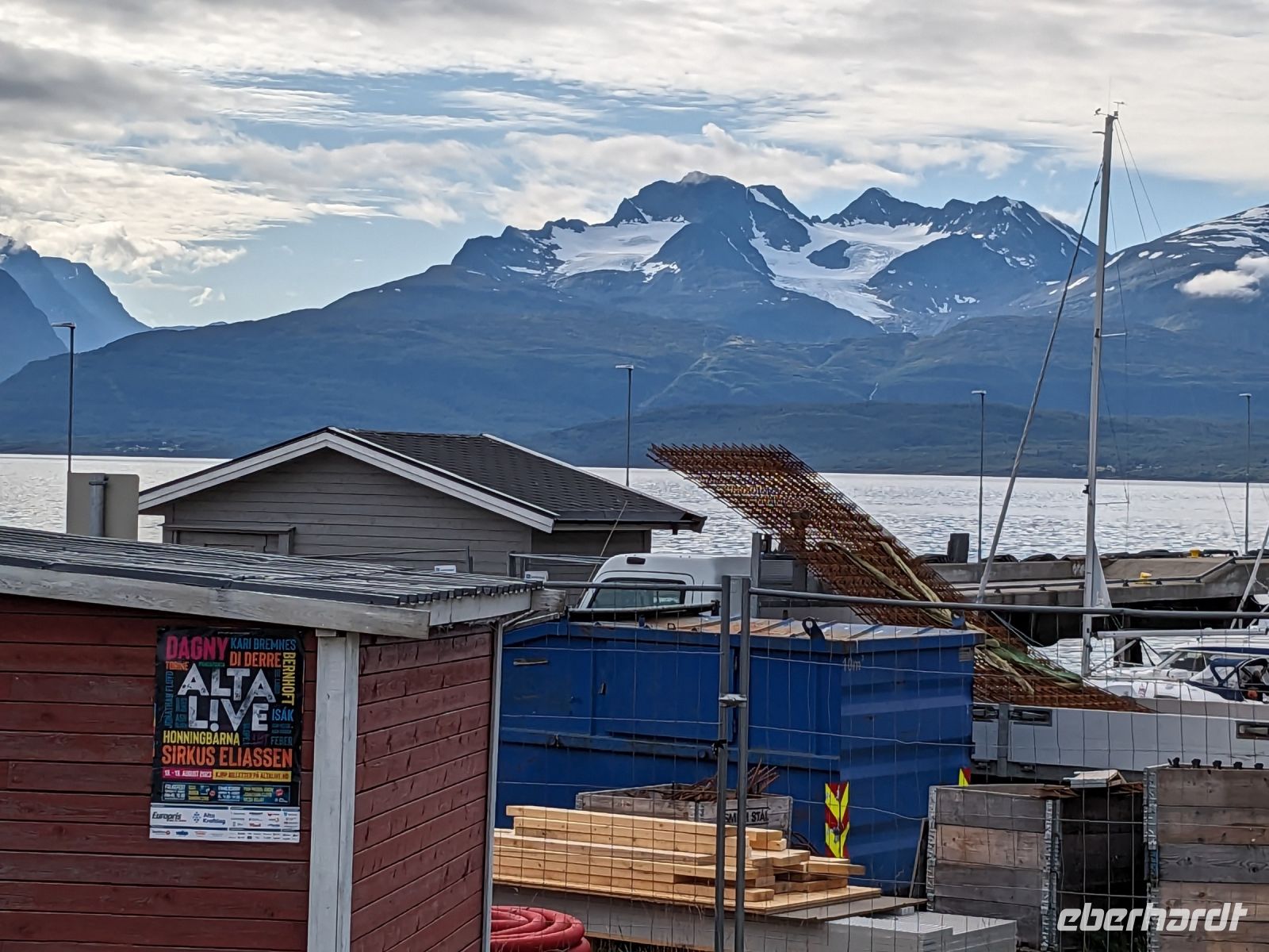 Wiederum am Porsangerfjord entlang führte unser Weg ein Stück auf schon bekannter Wegstrecke zunächst nach Süden, bevor wir uns an den Fjorden entlang über Alta weiterbegaben. An derselben Raststätte wie am Vortag, kurz bevor wir den Porsangerfjord verließen, machten wir Pause und fuhren dann bis zum Zentrum von Alta weiter, wo wir wieder einen Stopp einlegen konnten. Jetzt waren wir bereits im nördlichen Fjordland und nahe am Eismeer, wie der nördliche Teil des Atlantiks genannt wird. Alta gehört zu den Regionen, die am frühesten nach der Eiszeit wieder besiedelt wurden, worauf die hier in der Nähe gefundenen Felszeichnungen von Hjemmeluft deuten, die seit 1985 auf der Liste des UNESCO-Weltkulturerbes stehen.