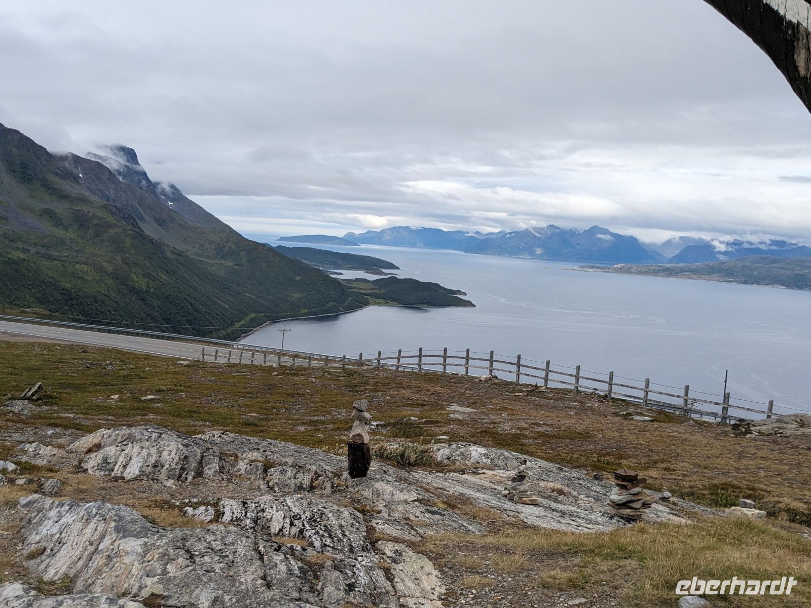 Von Tromsø aus ging es jetzt weiter nach Süden. Auf der Europastraße 8 erreichten wir am Balsfjord die Europastraße 6, die fast durch ganz Norwegen führt und durch besondere landschaftliche Schönheit gekennzeichnet ist. Sie wurde als erste durchgehende Straße von Süd- nach Norwegen erbaut vor allem im Zusammenhang mit Narvik, Norwegens bedeutendstem Erzhafen – allerdings unter großen Opfern während der deutschen Besatzung Norwegens seit 1940 mit einer immensen Zahl beim Bau durch die harten Arbeitsbedingungen gestorbenen Kriegsgefangenen. Strategische Bedeutung hatten Hafen und Straße vor allem im 2. Weltkrieg und so kann man fast überall an den Parkplätzen Kriegsdenkmäler und Schautafeln entdecken. Sie erhalten Informationen über die erbitterten Kämpfe zwischen der Armee des norwegischen Königs und den Truppen Hitlers sowie die Opfer bei Errichtung der „Blodvei“ (Blutstraße) genannten Durchgangsstraße..