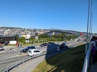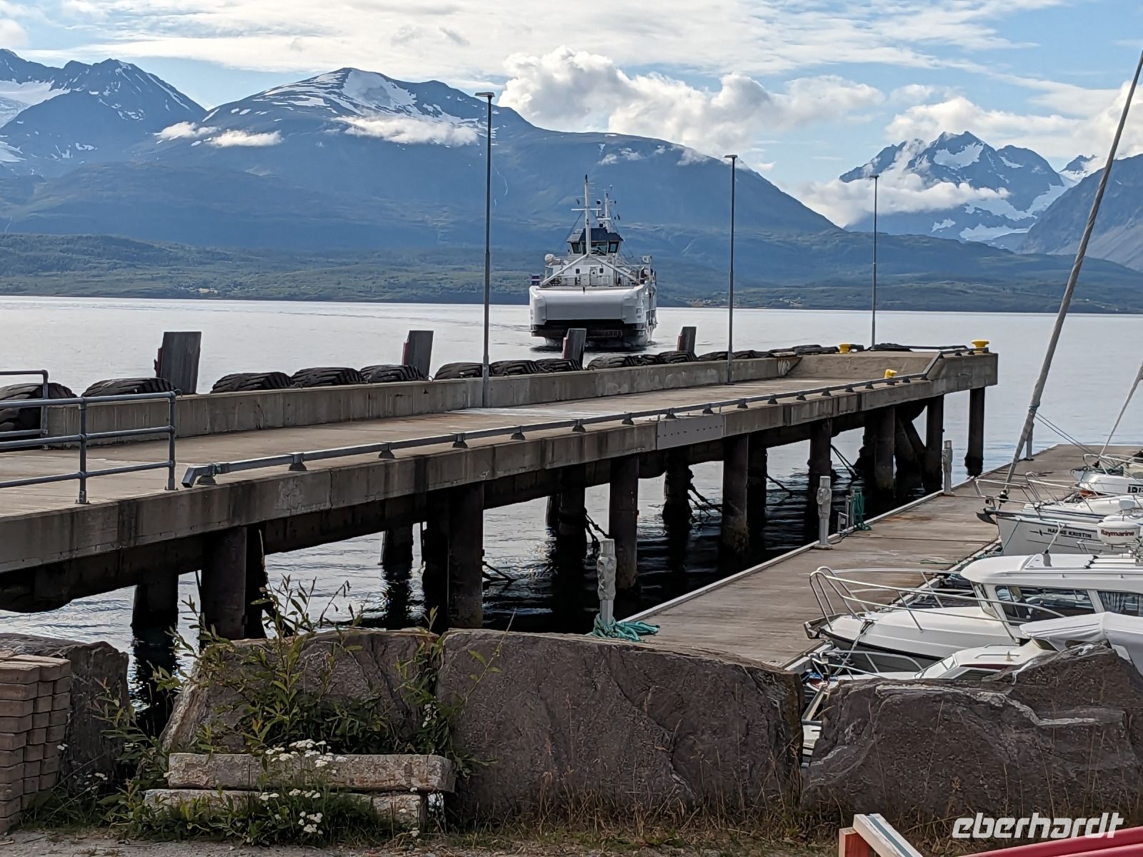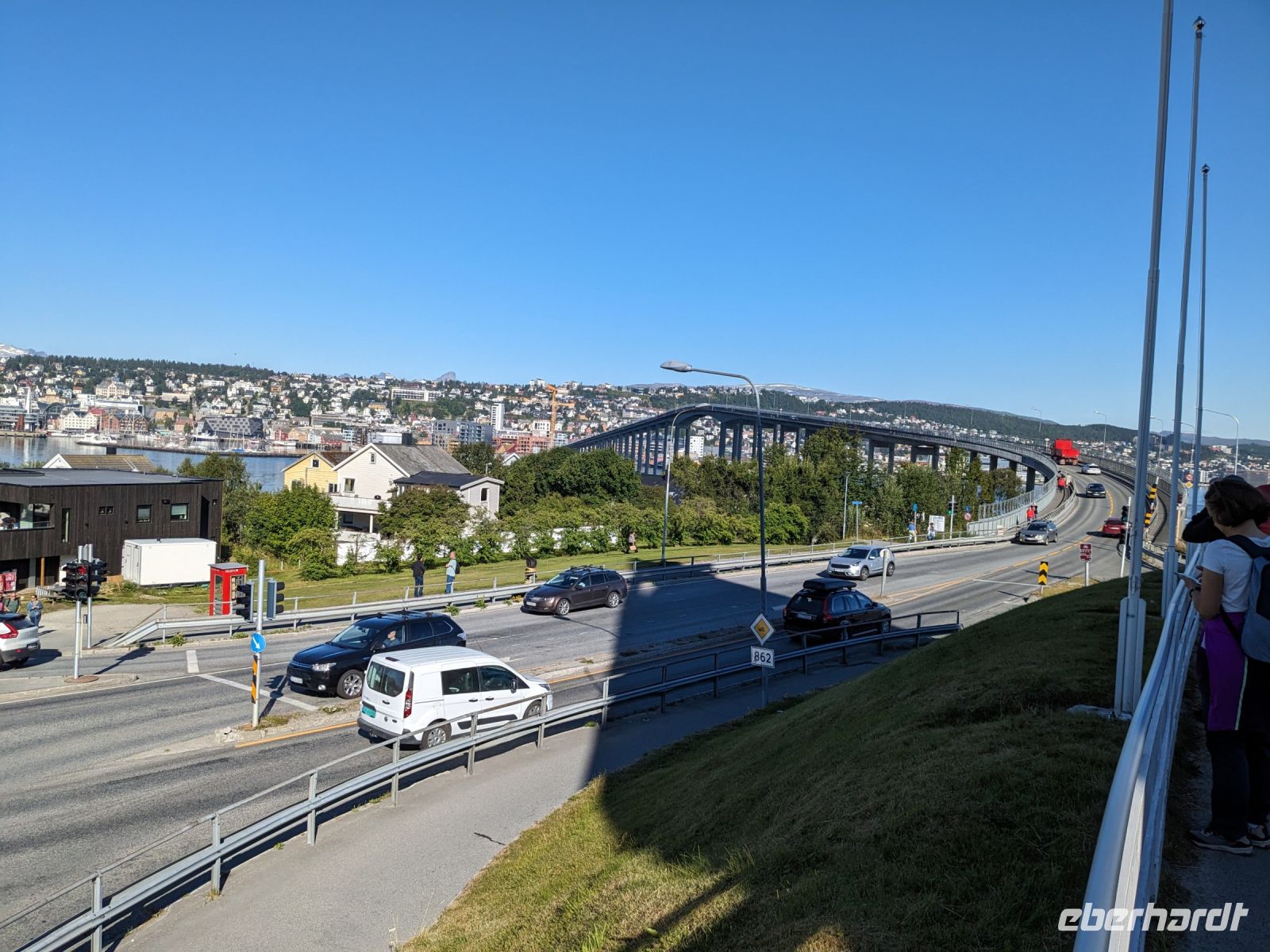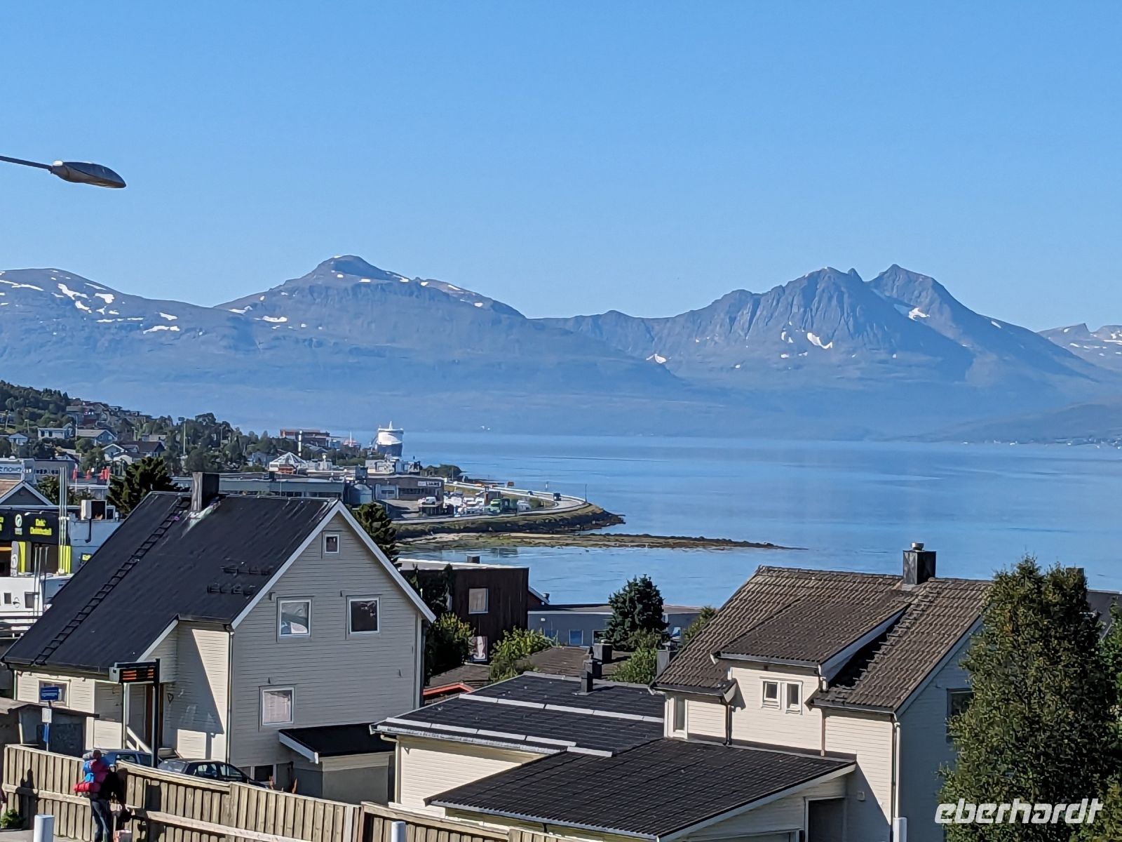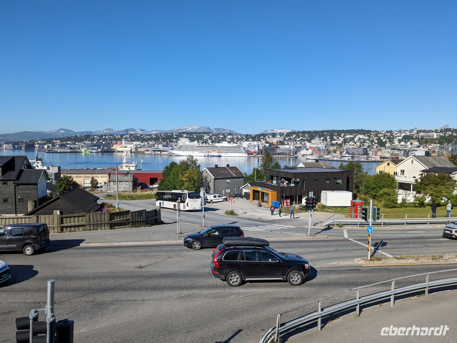 Danach mussten wir noch zwei breite Fjorde mit Fähren überqueren und ein Stück Küstenstraße fahren, bevor wir recht spät unser heutiges Ziel erreichten. Tromsø ist nach dem russischen Murmansk die größte europäische Stadt nördlich des Polarkreises. Hier im Zentrum bezogen wir unser bequemes Hotel und nahmen unser Abendessen ein.