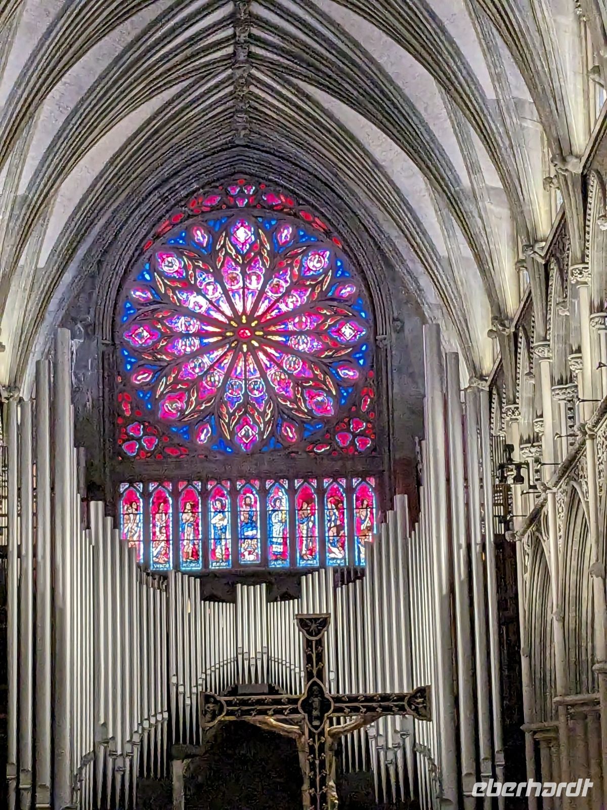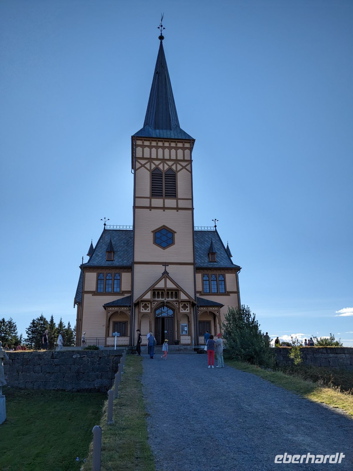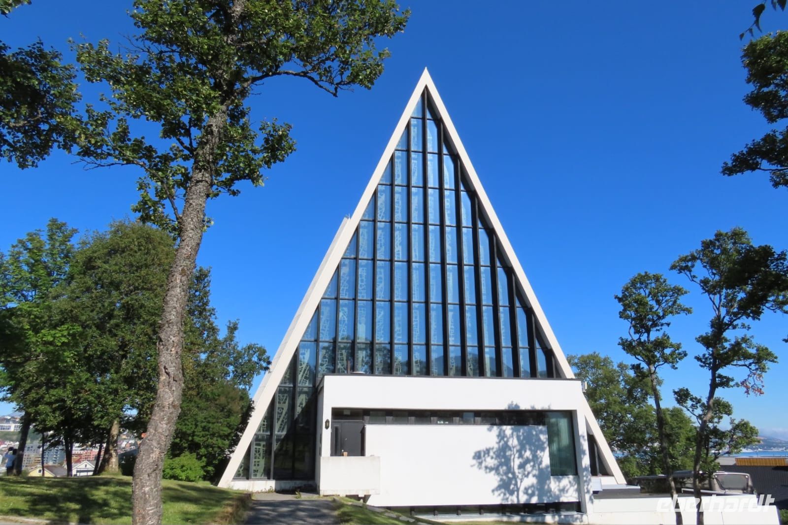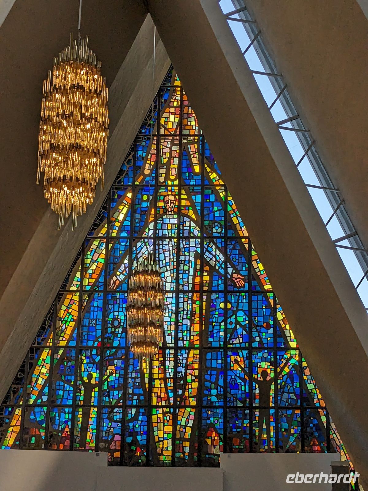 Den ersten Tageshöhepunkt bildete in Tromsø deren bekanntestes Bauwerk, die Eismeer-Kathedrale. Der Name führt etwas in die die Irre – sie ist keine echte Bischofskirche – ansonsten aber ein „Hingucker“ und ein besonderes Werk modernster Baukunst. Seit ihrer Einweihung 1965 ist sie das unbestrittene Wahrzeichen der Stadt Tromsø und neben ihrer Funktion als evangelische Pfarr- und Seemannskirche ein Touristenmagnet. Das Äußere der aus mit Aluminium verkleidetem Beton errichten Kirche, deren Dach bis zum Boden reicht, soll an aufgeschichtete Eisplatten erinnern. Die 35 m hohen Giebel – das Gotteshaus ist mit seiner Altarwand wie fast alle christlichen Kirchen nach Osten ausgerichtet - sind mit Glas verkleidet. Seit 1972 trägt die Ostwand eines der größten Glasgemälde Europas – das 23 m hohe Glasmosaik „die Wiederkehr Jesu“ des norwegischen Künstlers Victor Sparre.