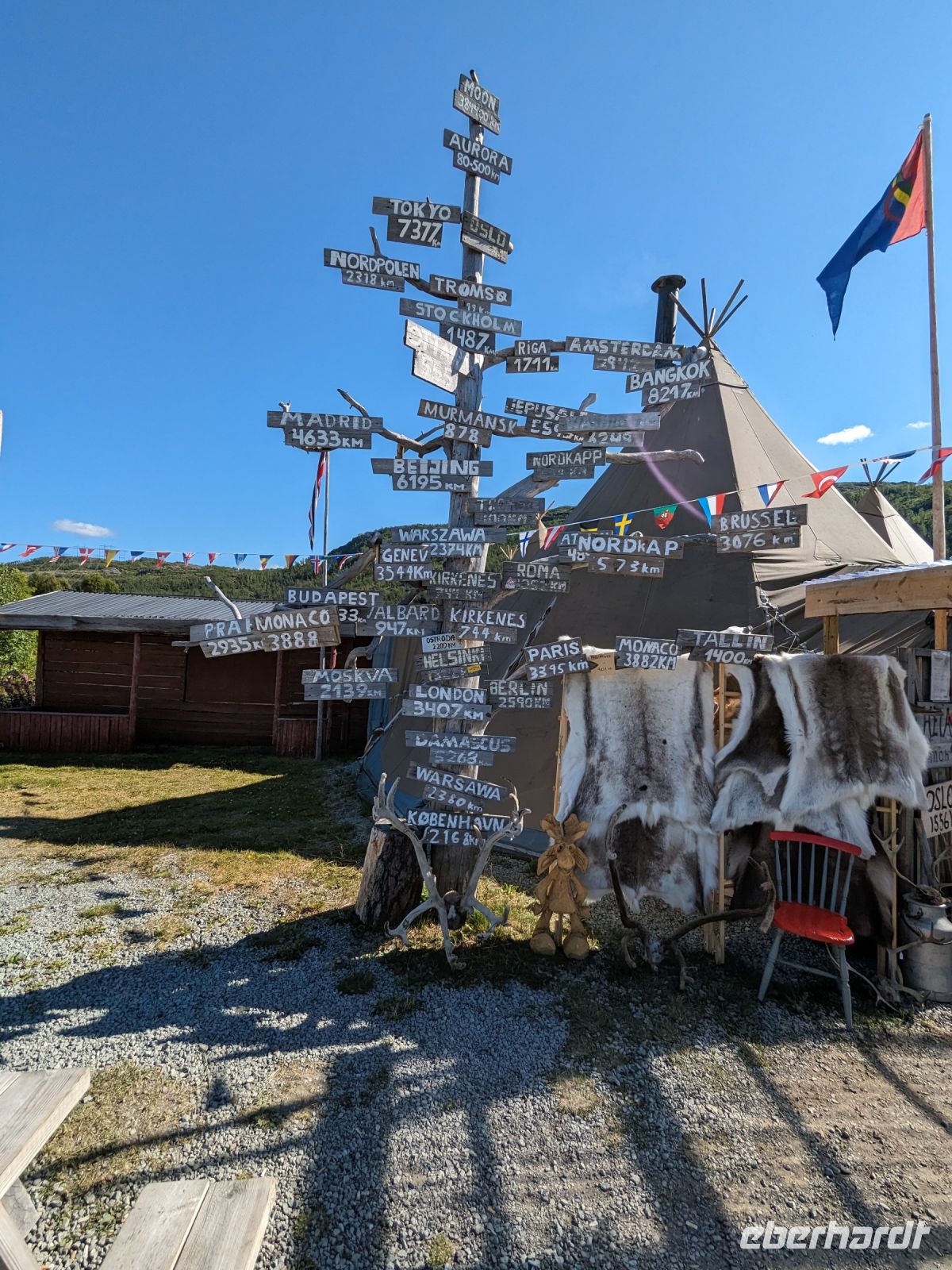 Später durchquerten wir auf unserem Weg zum Nordkapp Rovaniemi, den Hauptort von Finnisch-Lappland und gelangten zum Polarkreis. Hier am nördlichen Breitenkreis mit den Koordinaten 66°33'55? nördlicher Breite geht am Tag der Sommersonnenwende die Sonne nicht unter – ein Phänomen, das sogar bereits den alten Griechen bekannt war. Er markiert den „Beginn der Arktis“ und hier, nördlich von Rovaniemi, liegt das Blockhüttendorf des Weihnachtsmannes, in dem es neben Souvenirläden auch Gastronomie, ein Museum und das „Weihnachtsmann-Postamt“ gibt. In Finnland glaubt man – während andere Länder den Sitz des Weihnachtsmanns anderswo verorten – fest daran, dass dieser am Polarkreis in Finnland wohnt. Schuld ist unter anderem eine populäre Weihnachtsmanngeschichte, die früher von finnischen Radiosendern verbreitet wurde. Inzwischen hat sich der finnische „Joulupukki“, wie der englische „Santa Claus“ und deutsche Weihnachtsmann hier genannt wird, als sehr geschäftstüchtig erwiesen und am Polarkreis unter Ausnutzung seiner Wohnort-Legende in Lappland, ein kommerzielles Blockhütten-Dorf hingestellt – beliebt bei Touristen aus aller Welt.