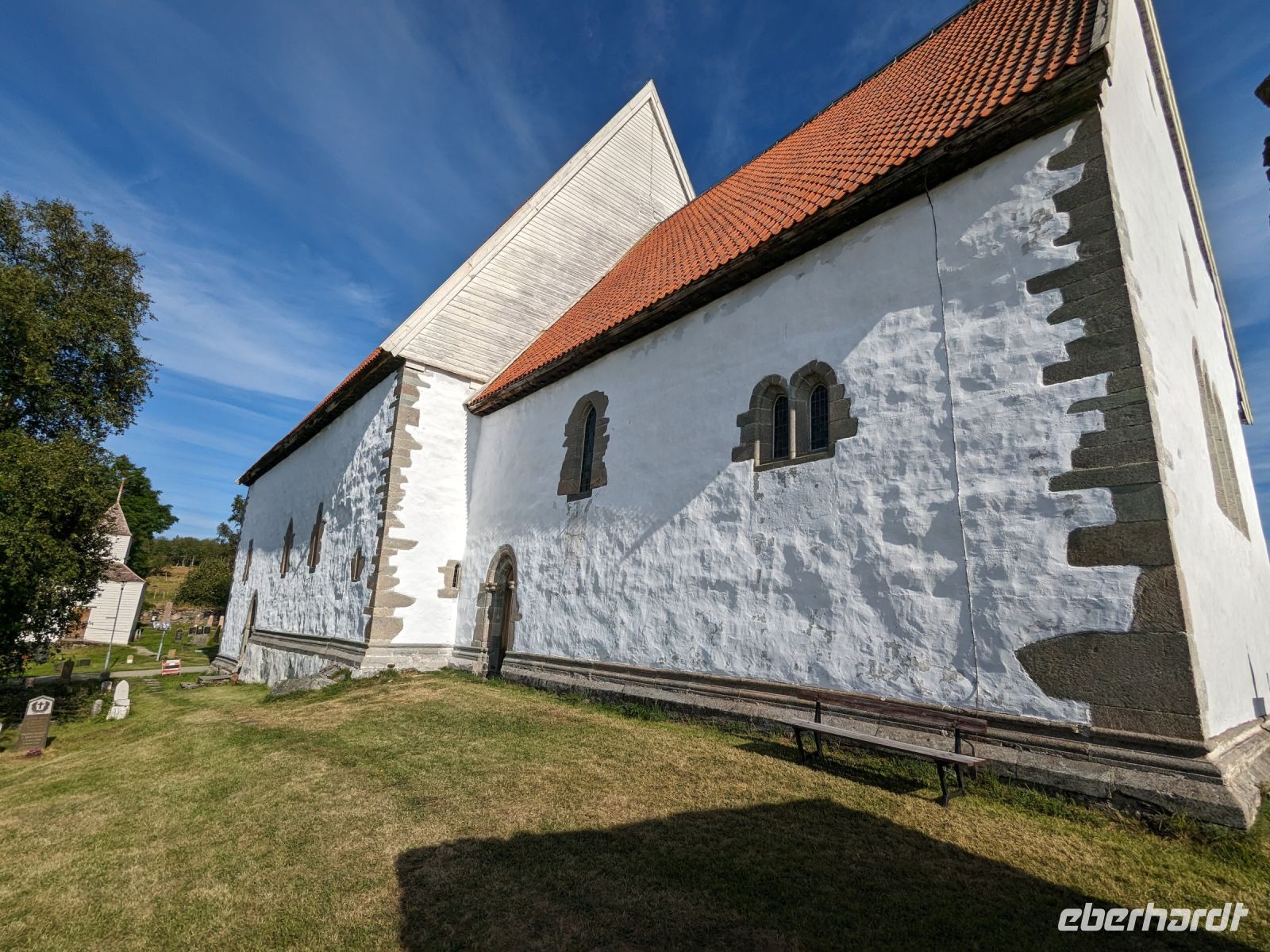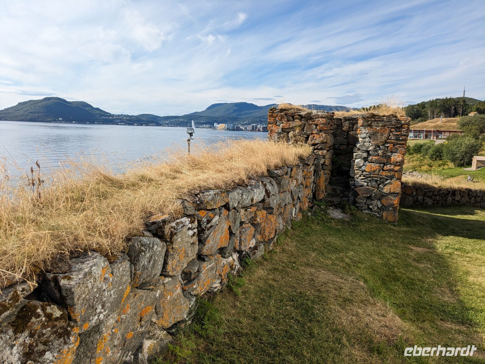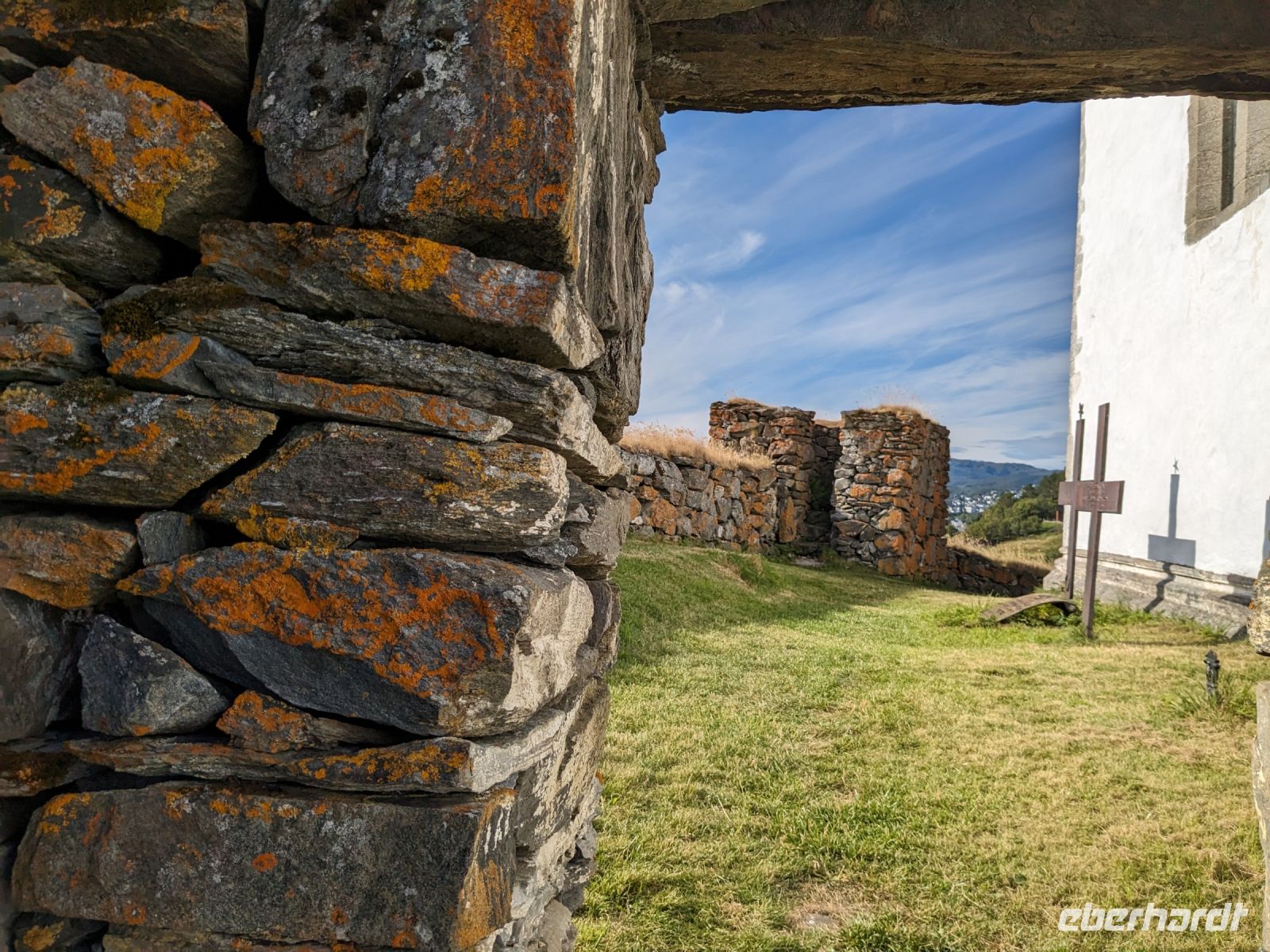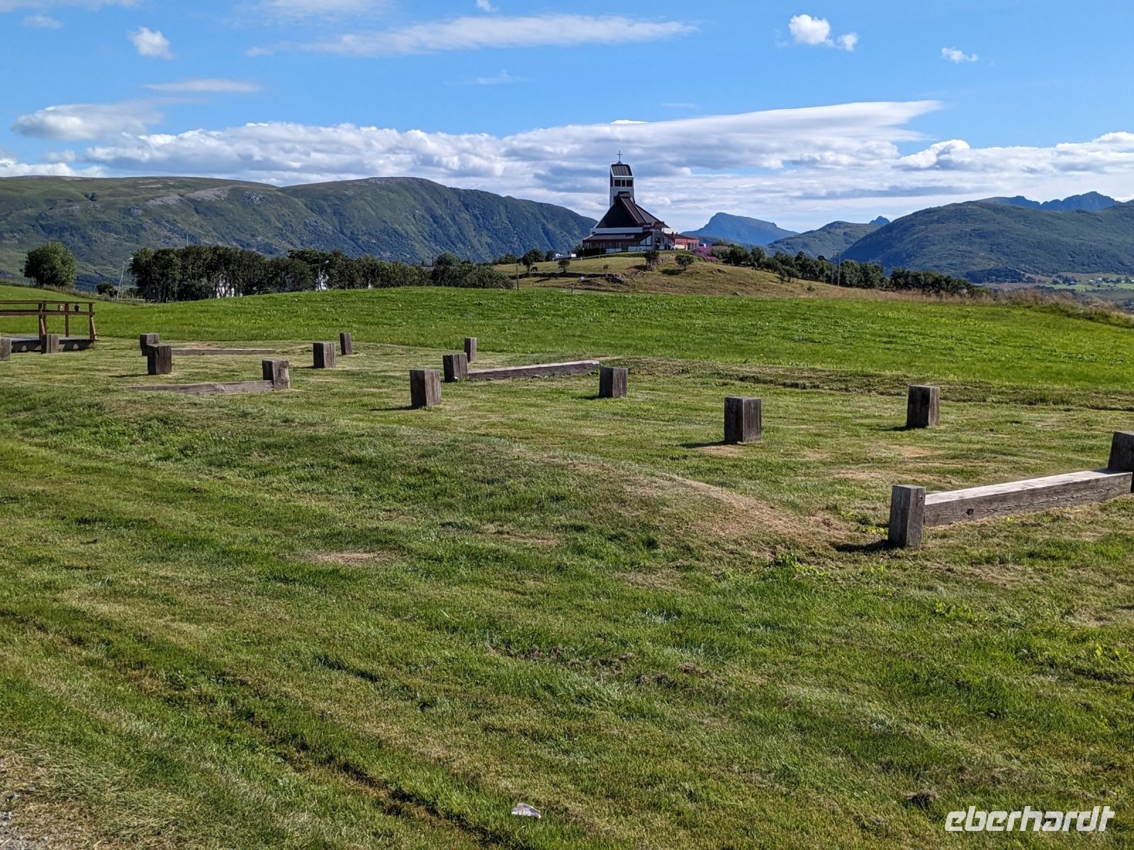 Heute Vormittag besahen wir uns zunächst die etwas nördlich von Harstad gelegene Pfarrkirche von Trondenes, die als älteste original erhaltene Steinkirche Norwegens gilt. Sie wurde Anfang des 12. Jh. errichtet, zu einer Zeit, in der sich das Christentum noch keineswegs überall in Nordeuropa endgültig durchgesetzt hatte. Daher ist sie von Festungsmauern umgeben, von denen sich Reste erhalten haben.